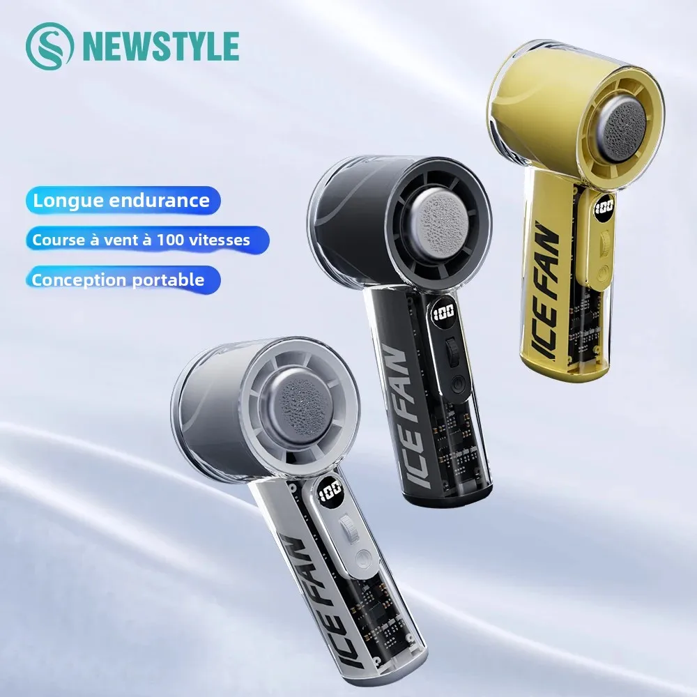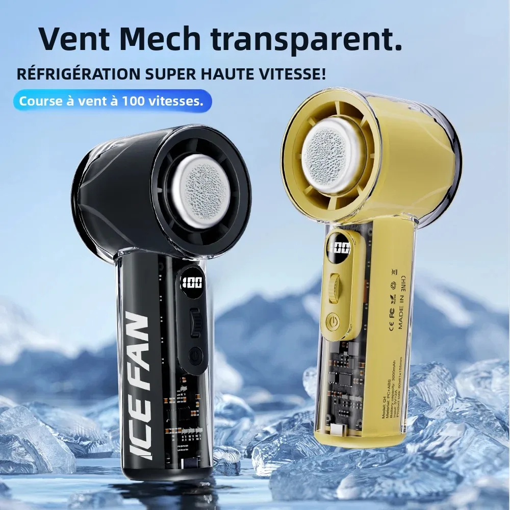 Experience ultimate comfort with this innovative semiconductor refrigeration mini fan, designed for portability and efficiency. Its sleek, transparent case reveals cutting-edge internal components, giving it a modern, mechanical-mecha style aesthetic. Available in versatile colors—black, white, and yellow—this fan complements any environment, from home to outdoor activities. The cylindrical handle houses a bright LED digital display showing wind speed, along with intuitive controls for seamless operation. With a built-in 3000mAh rechargeable battery, you enjoy extended cooling without interruption. The fan’s powerful 100-speed stepless airflow adjustment and maximum reach of 19 meters ensure a refreshing breeze wherever you are, making it an essential summer companion. Its futuristic design combines style with high-tech performance, elevating your daily comfort.