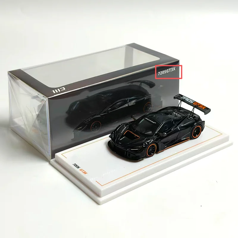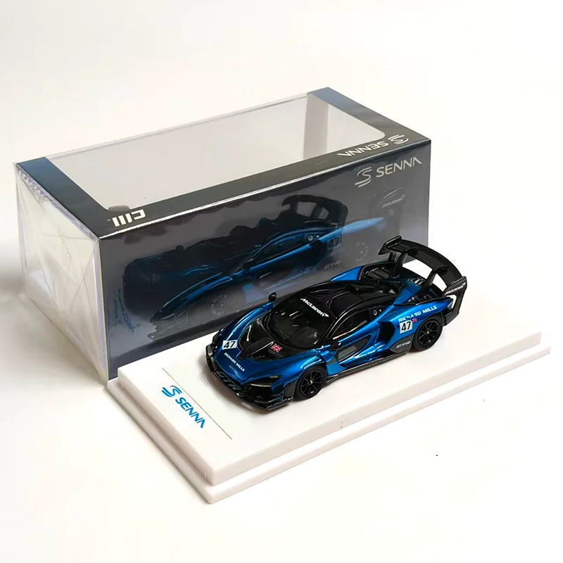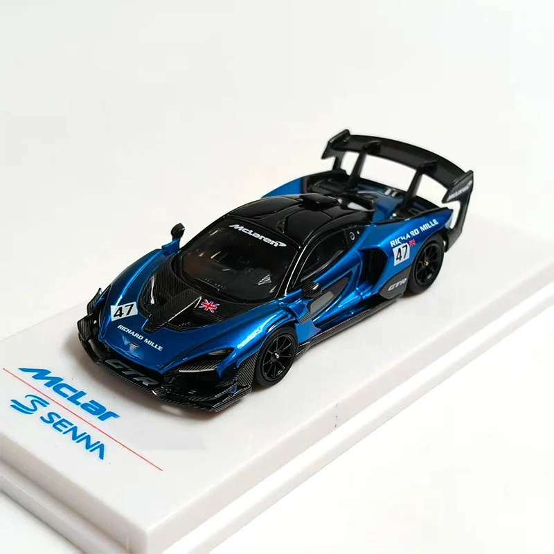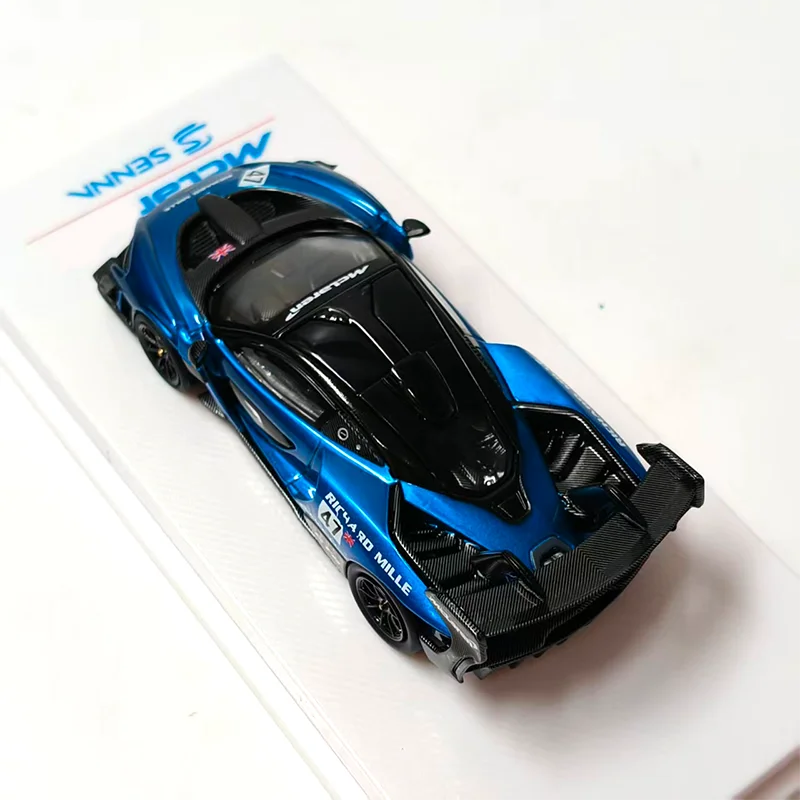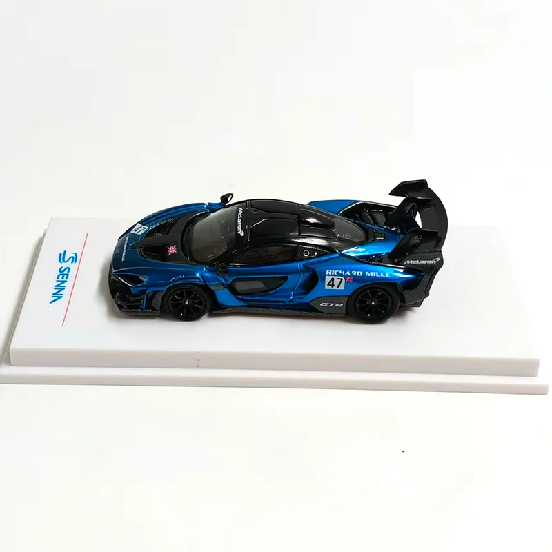 Imagine owning a stunning replica of the iconic Senna GTR/720 GT3X, beautifully crafted to showcase the racing car's sleek lines and aerodynamic precision. This 1:64 scale model exudes high-performance aesthetics with its vivid metallic blue body accented by striking black details. The glossy finish heightens its realism, highlighting features such as the aggressive black front splitter, intricately designed air intake vents, and sculpted side panels that emphasize speed. The black roof, complemented by small aerodynamic side mirrors, contrasts perfectly with the vibrant body. The large black rear wing and detailed diffuser add to its authentic race-ready appearance. Perfect for display, this model brings dynamic sportiness to any collection or desk.