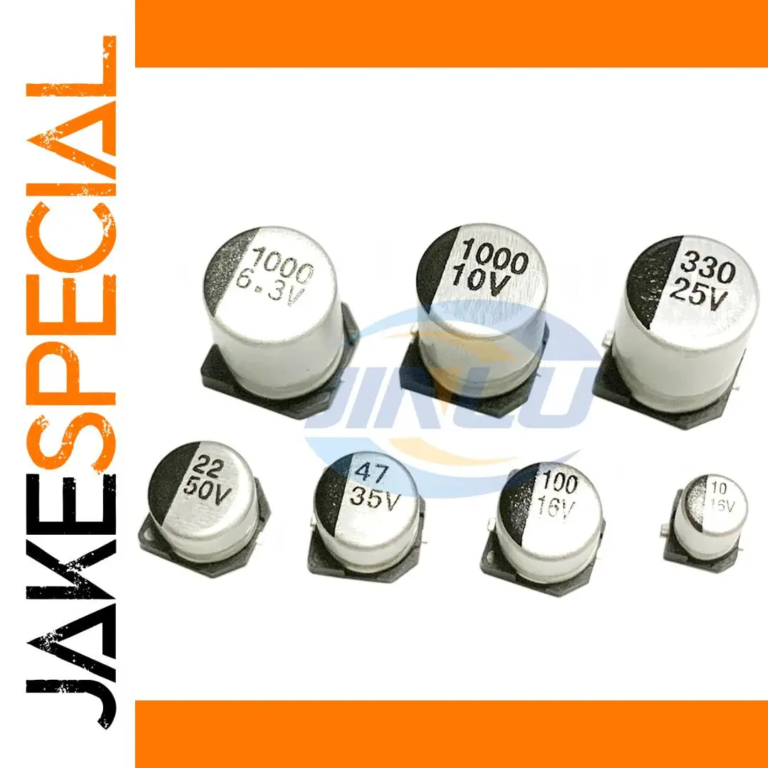 This set of ten surface-mount aluminum electrolytic capacitors features a 16V voltage rating and a wide range of capacitance values, including 10UF, 22UF, 33UF, 47UF, 100UF, 220UF, 330UF, 470UF, 680UF, and 1000UF. Each capacitor has precise dimensions, from 4×5.4mm to 8×10.2mm, tailored to their capacitance. Crafted for general-purpose applications, these fixed, sleek cylindrical components boast a minimalist black-and-white design with clear black markings, offering both functional reliability and a modern, streamlined aesthetic. Ideal for electronic repairs, modifications, and custom projects.