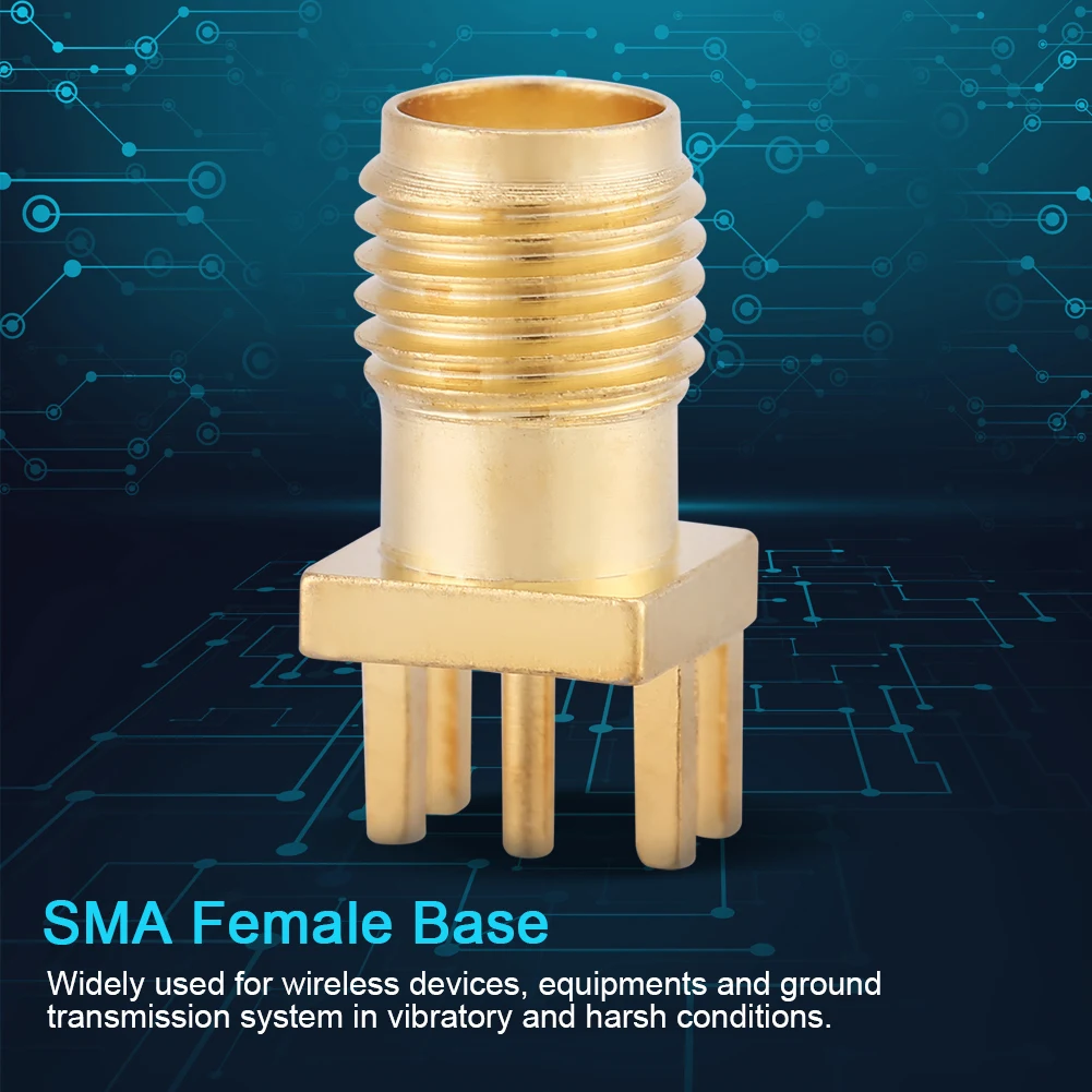 Imagine elevating your RF projects with these precisely crafted SMA female connectors. Featuring a sleek, metallic gold finish, these connectors exude a luxurious yet professional appearance, emphasizing both style and durability. Their compact, cylindrical design with external threading ensures a secure, reliable connection, while the gold plating enhances conductivity and prevents corrosion. The square flange with three pins offers a sturdy mounting option for PCB integration. Designed to operate efficiently across a broad temperature range (-65°C to +165°C), these connectors support frequencies up to 6GHz, making them ideal for high-performance wireless applications. Whether you're assembling antennas, modules, or transmission systems, this set promises longevity and consistent performance.