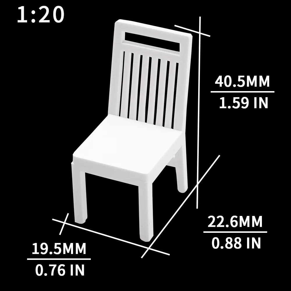 Enhance your DIY scene layouts and diorama kits with this set of 10 miniature chairs, crafted from high-quality white ABS plastic. Featuring clean and modern lines, each chair is designed with a straight backrest and sturdy legs, making them ideal for indoor décor and mini garden landscapes. Available in scales of 1:20, 1:25, and 1:30, these chairs will seamlessly fit into your creative projects. With a total of 10 pieces in each package, you’ll have ample chairs to bring life to your model homes and miniature scenes. Perfect for adult collectors and enthusiasts looking to add a touch of elegance to their displays.