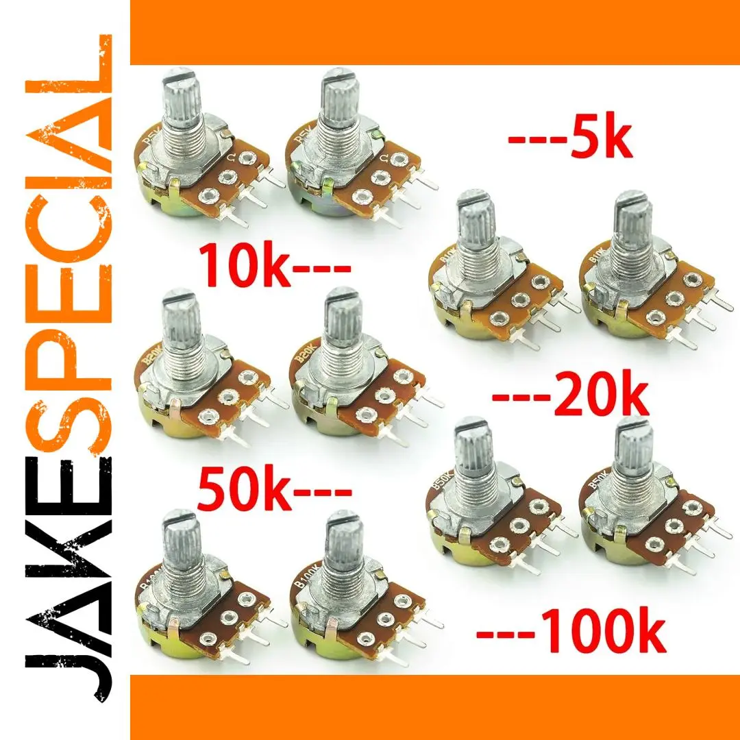 Imagine enhancing your electronic projects with this reliable set of ten linear potentiometers, each boasting a 15mm shaft length for precise control. Designed for versatility, these potentiometers feature metallic, knurled shafts that ensure a sturdy grip and easy adjustment. The components are mounted on compact, brownish-orange circuit boards with clearly visible solder points and three metal pins for secure electrical connection. The resistance values—5KΩ, 10KΩ, 20KΩ, 50KΩ, and 100KΩ—are conveniently grouped for quick identification. Their sturdy construction, sleek metallic surfaces, and minimalist design make them ideal for integrating into computers, audio equipment, or other electronic devices, combining functionality with a clean, industrial look.
