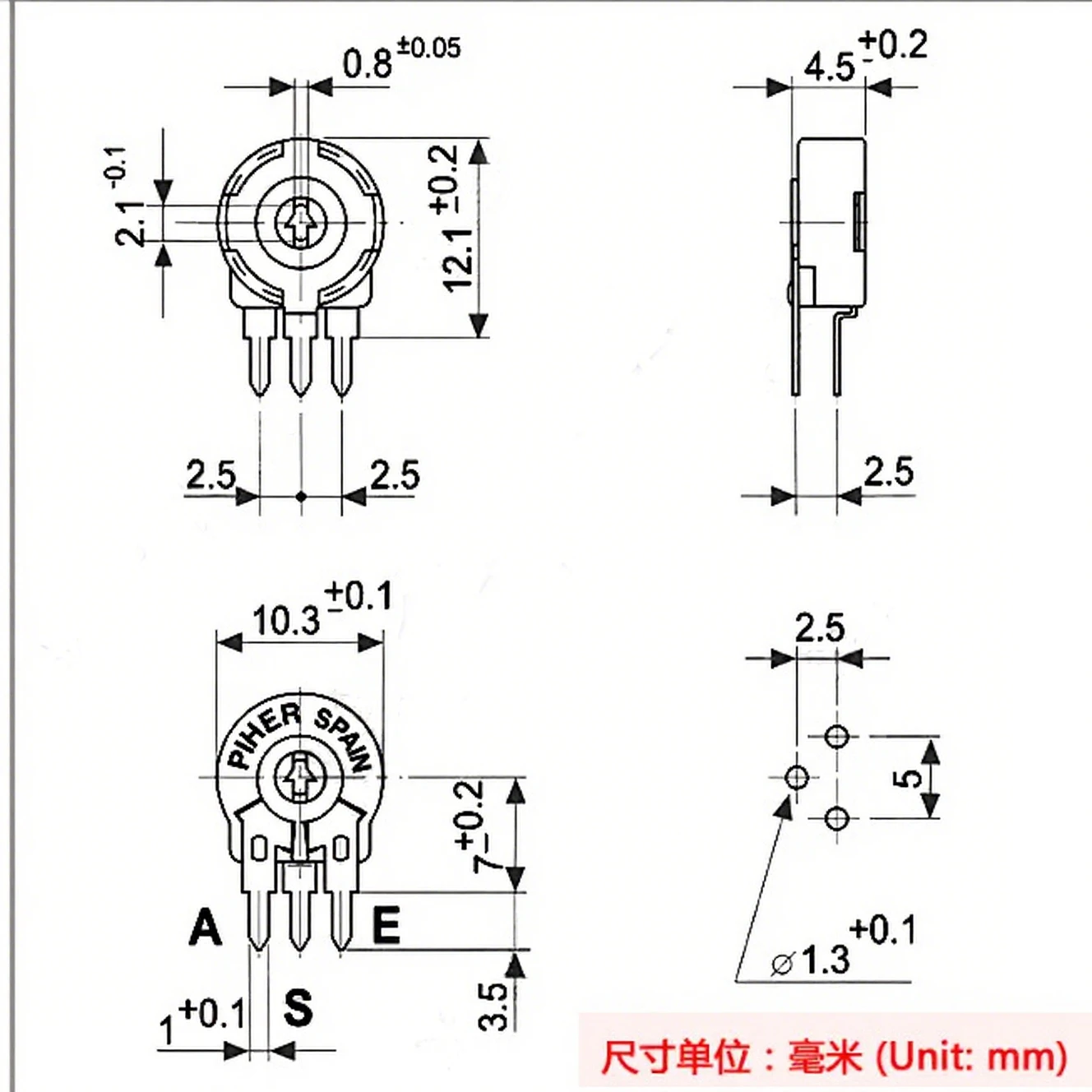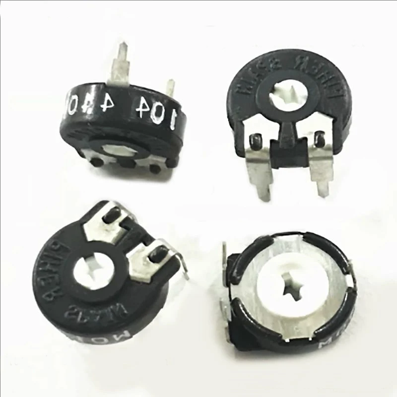 This set of 10 adjustable potentiometers features resistance ratings of 100Ω, 200Ω, 500Ω, 1K, 2K, 5K, 20K, 50K, 200K, and 2MΩ, designed with a sleek, horizontal single-turn, arrow hole model. Crafted with a durable black plastic body and metallic components, these potentiometers offer a professional, minimalist aesthetic with clear white markings indicating resistance values for easy identification. Equipped with a white adjustment shaft for precise control, they are suitable for various general electronic applications, operating at standard supply voltage and power dissipation. Whether you’re building or repairing, these new, customizable components are designed to meet your technical needs confidently.