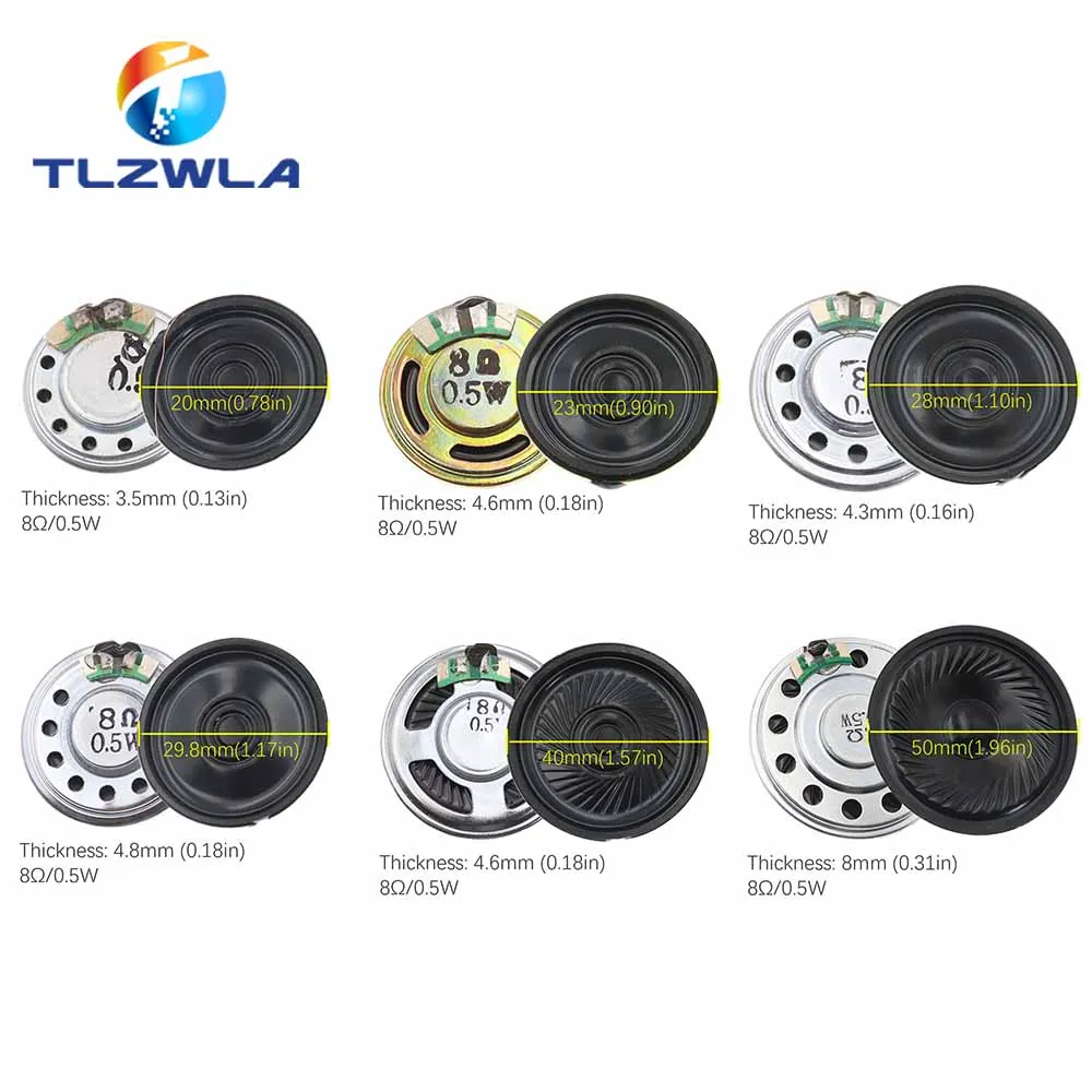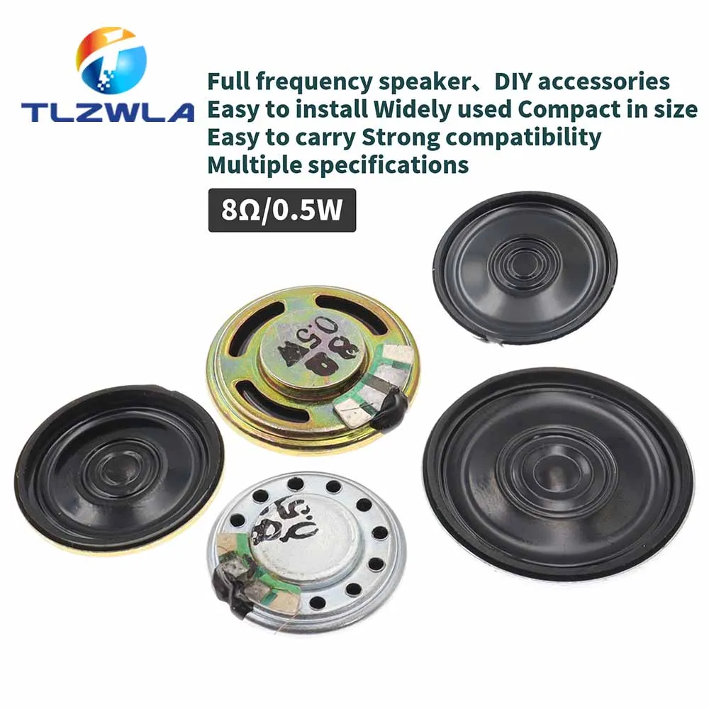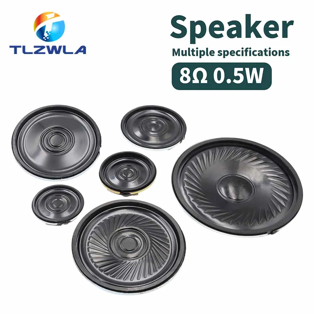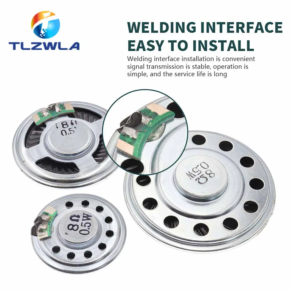 Enhance your electronic projects with this set of 10 small loudspeakers, featuring diameters of 20mm, 23mm, 28mm, 30mm, 40mm, and 50mm. Each speaker offers 8 ohms impedance and 0.5W power, operating at 36V, making them ideal for buzzers, alarms, and warning systems. Crafted with ultra-thin design and durable materials, these speakers showcase a minimalist, industrial aesthetic with radiating cone patterns on larger sizes and smooth surfaces on smaller ones. Vented back covers and visible solder points ensure easy mounting and connection. Certified CE and RoHS, they promise reliable, high-quality performance for a variety of electronic applications.