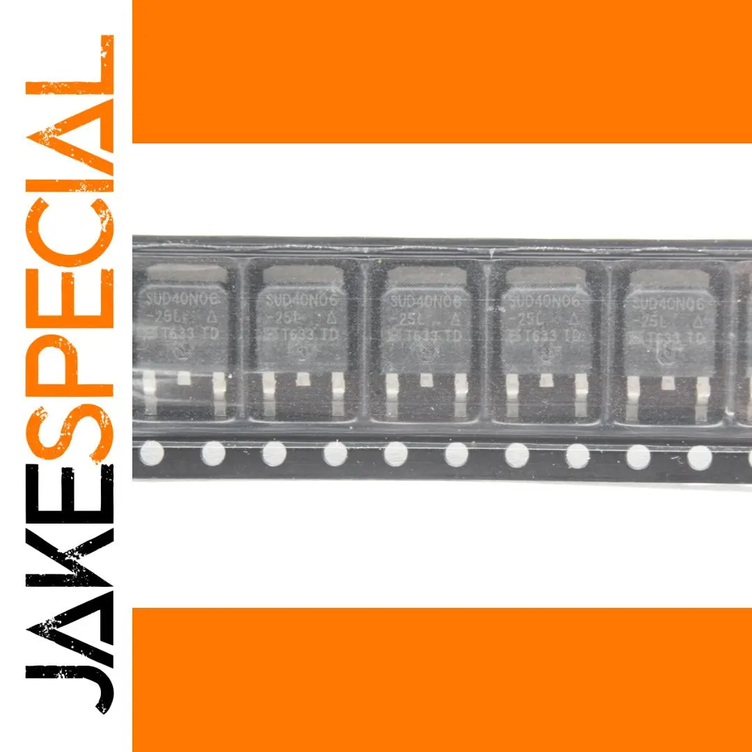 Experience reliable power regulation with this set of 10 SUD40N06-25L power MOSFETs. These compact, black plastic devices feature a sleek TO-252 package, ideal for surface-mount applications. Equipped with three gold or tin-plated leads, they promise efficient electrical conductivity while maintaining a minimal profile. Each unit bears precise white markings, including model number and codes, ensuring easy identification and consistent quality. Their modern rectangular design not only enhances your circuit’s aesthetic but also provides a robust, functional component for high-performance switching. Perfect if you're assembling or repairing electronic devices, these MOSFETs offer dependable operation in diverse electrical environments. Invest in this batch to streamline your projects and ensure long-term performance.
