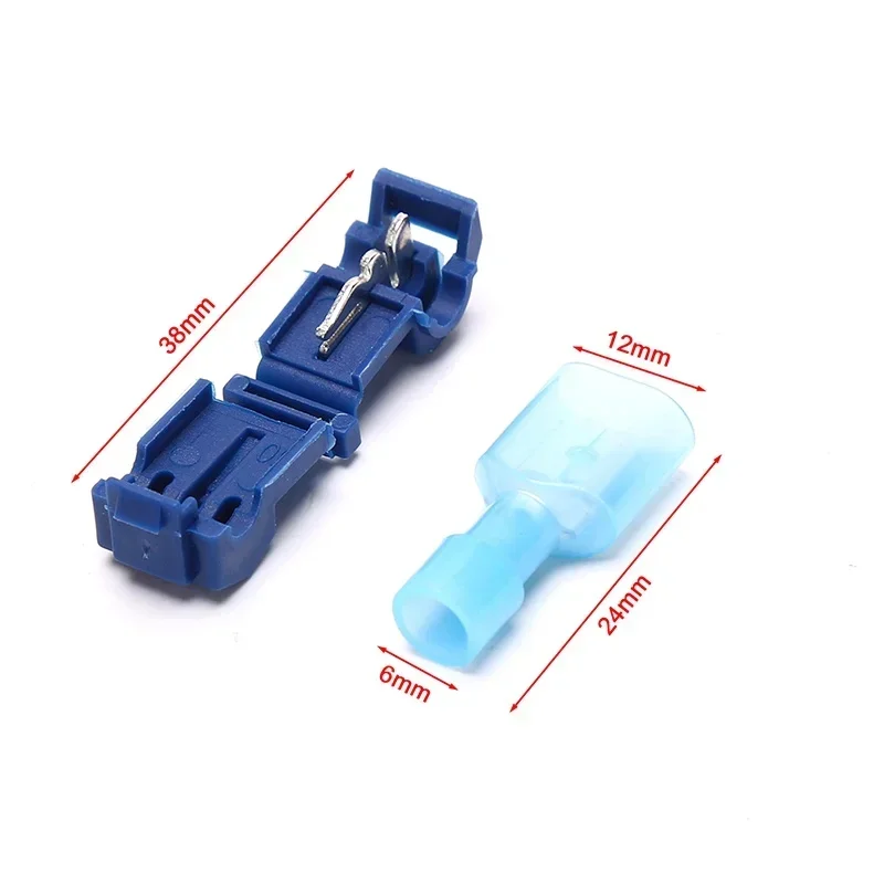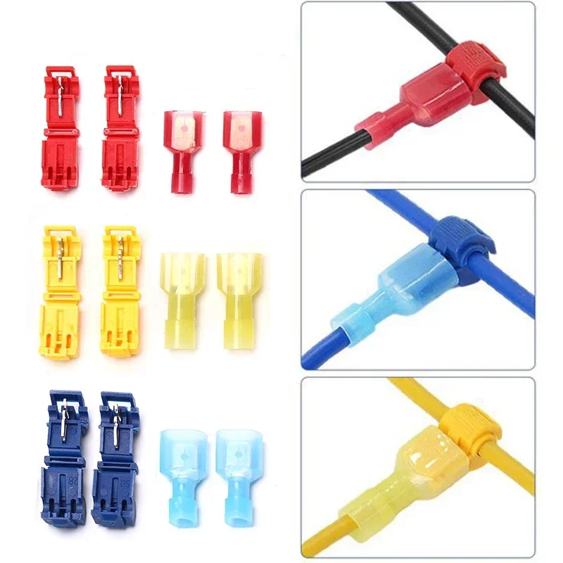 Enhance your electrical wiring projects with this set of 10 T-Tap wire connectors and 5 male quick disconnects, crafted from durable nylon, copper, and tin. Featuring color-coded insulation in red (22-18 AWG, 0.5-1.5 mm²), blue (18-14 AWG, 1.5-2.5 mm²), and yellow (12 AWG, 2.5-4.0 mm²), they provide clear organization and compatibility for various wire sizes. These crimp connectors support a maximum voltage of 600V and operate safely up to 221°F (105°C). Their insulated, streamlined design allows secure, quick connections in low-voltage, high-performance electrical systems, ensuring safety, durability, and ease of installation.