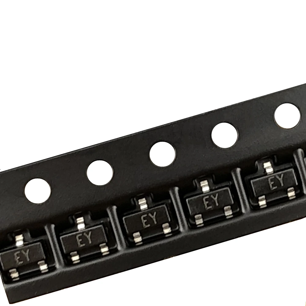 - Pack of 100 black rectangular SOT-23 transistors with a semi-matte finish, marked EY, arranged for easy automated surface-mount assembly in your projects.