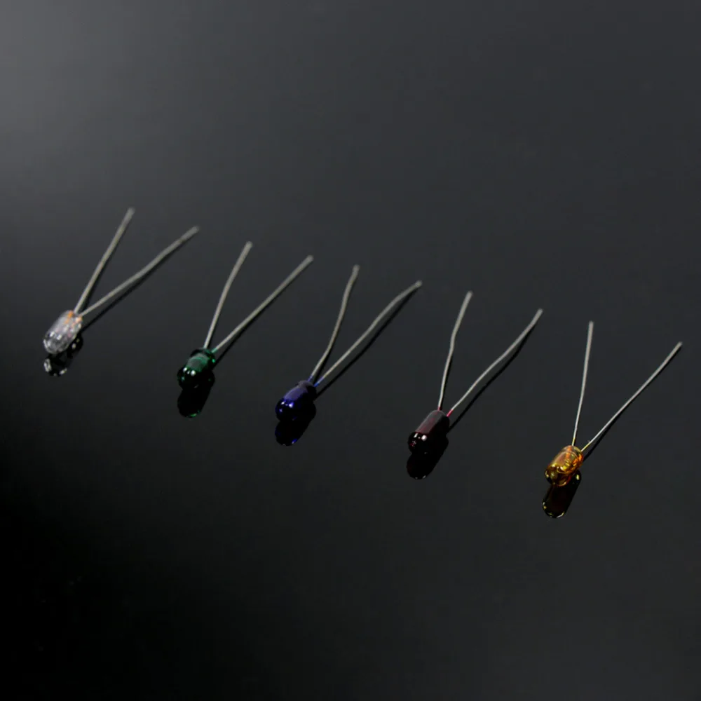 Imagine elevating your lighting projects with this set of 100 mini grain of wheat bulbs, expertly crafted for precision and style. Each bulb measures approximately 3mm in diameter and 8mm in length, featuring a sleek, transparent glass enclosure that showcases delicate internal filaments. The bulbs emit vibrant colors—red, yellow, blue, green, and white—and are designed for easy integration with 12V power systems. The glossy finish reflects light beautifully, intensifying their colorful glow when illuminated. Perfect for model building, decorative lighting, or custom displays, these bulbs deliver both technical reliability and aesthetic appeal. Visualize your project enhanced with these tiny, colorful light sources that combine craftsmanship with functionality seamlessly.