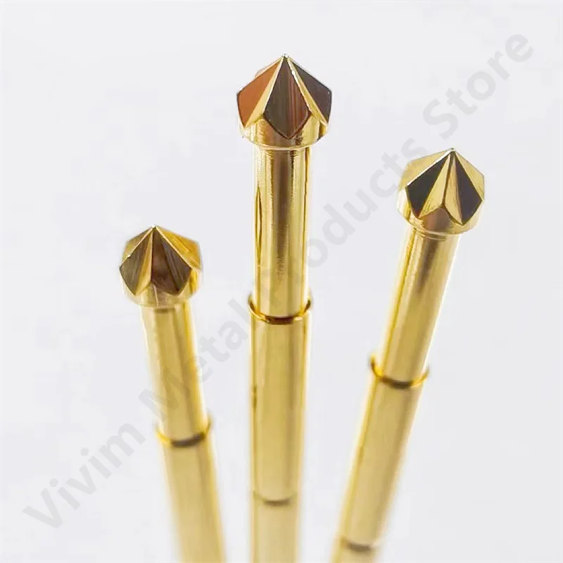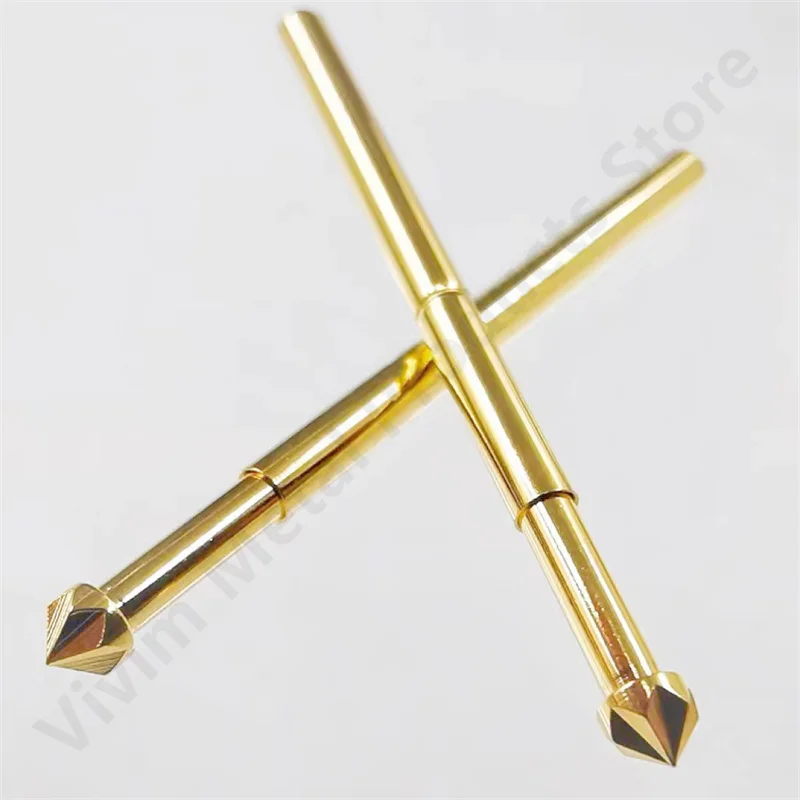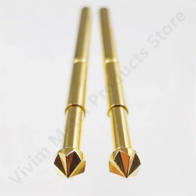 Experience exceptional precision and durability with this set of 100 high-quality spring test pins, models PA125-LM, PA125-LM2, and P125-LM2. Each probe measures 33.35mm in length, with a slender 2.02mm diameter, designed for efficient PCB testing and inspection. The gold-colored finish offers a sleek, reflective surface that ensures excellent electrical conductivity and corrosion resistance, highlighting their professional-grade construction. The wide, faceted pyramid-like heads (2.50mm diameter) taper to a fine point, enabling precise contact with test points on PCBs. These probes are built with a compression load type, making them ideal for reliable electrical testing during manufacturing or repair. Their minimalist, technical style emphasizes quality, precision, and longevity, perfect for demanding professional applications.