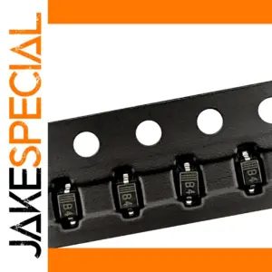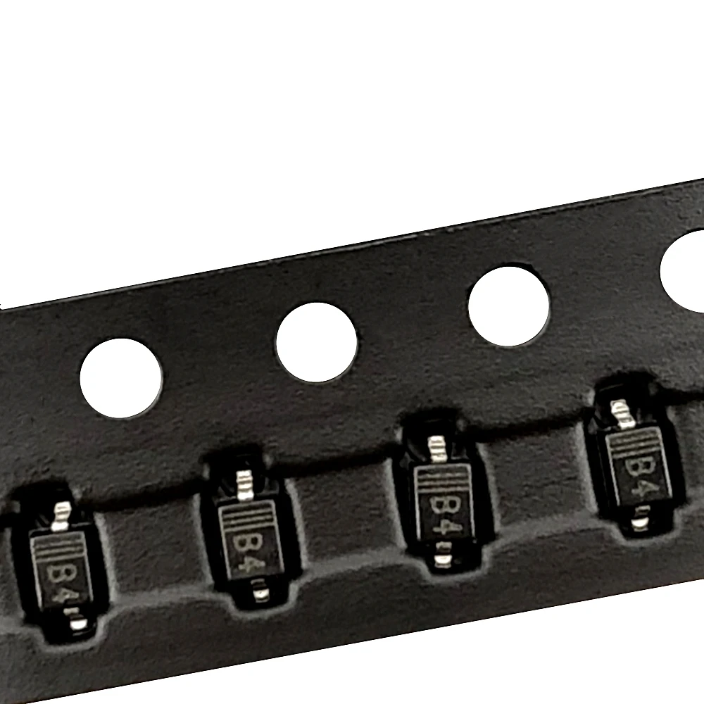 This set of 100 MBR0540WS Schottky diodes features SOD-323 (0805) surface-mount packages, ideal for high-speed switching and low forward voltage in electronic circuits. Each diode is a bipolar junction type marked with B4, securely held in individual compartments within a black anti-static carrier tape with a matte finish. The organized tape includes evenly spaced rectangular compartments and guiding holes for automated placement, ensuring precise and efficient assembly. Designed for reliable surface mounting, these diodes are suitable for various electronic applications, providing excellent performance in compact, professional-grade circuit designs.