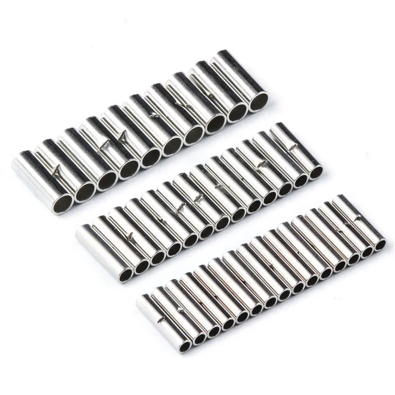 - Each connector measures approximately 30 x 22 mm, with a seamless tubular shape and a subtle seam or indentation for quick, secure crimping on wires of different sizes.