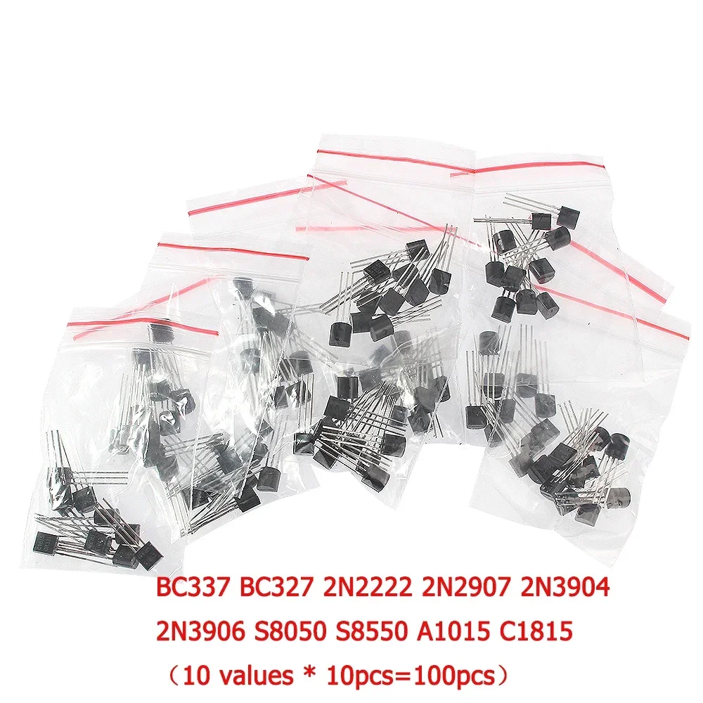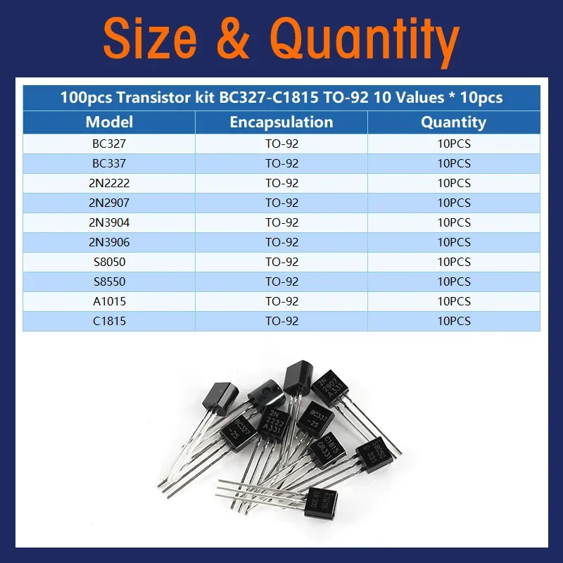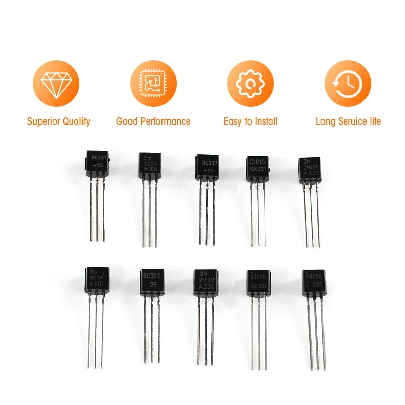 Enhance your electronic projects with this set of 100 high-quality triode transistors in TO-92 packaging, including models BC337, BC327, 2N2222, 2N2907, 2N3904, 2N3906, S8050, S8550, A1015, and C1815. These new, reliable NPN and PNP transistors feature a sleek black rectangular design with crisp white labels for easy identification. Their compact, durable form makes them ideal for a wide range of general-purpose applications, from amplification to switching. Whether you’re building new circuits or troubleshooting existing designs, this versatile transistor kit provides all the essential components needed for professional and hobbyist electronics alike.