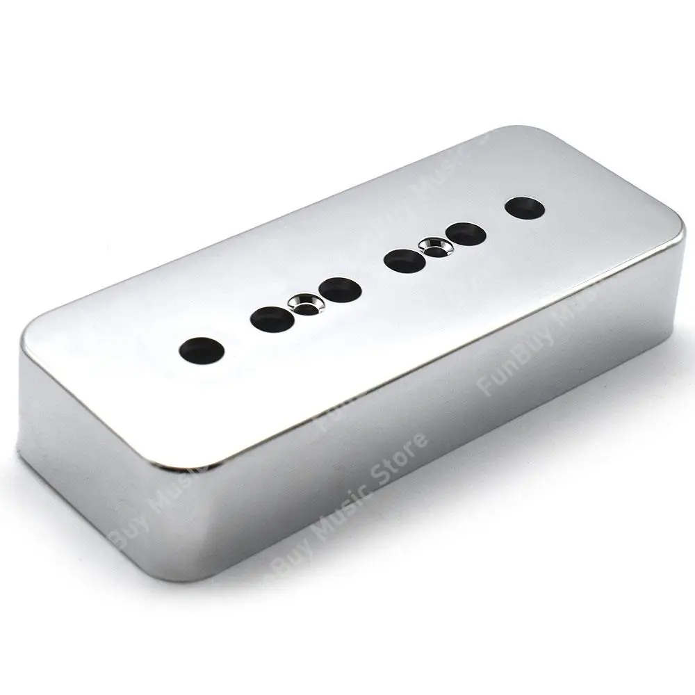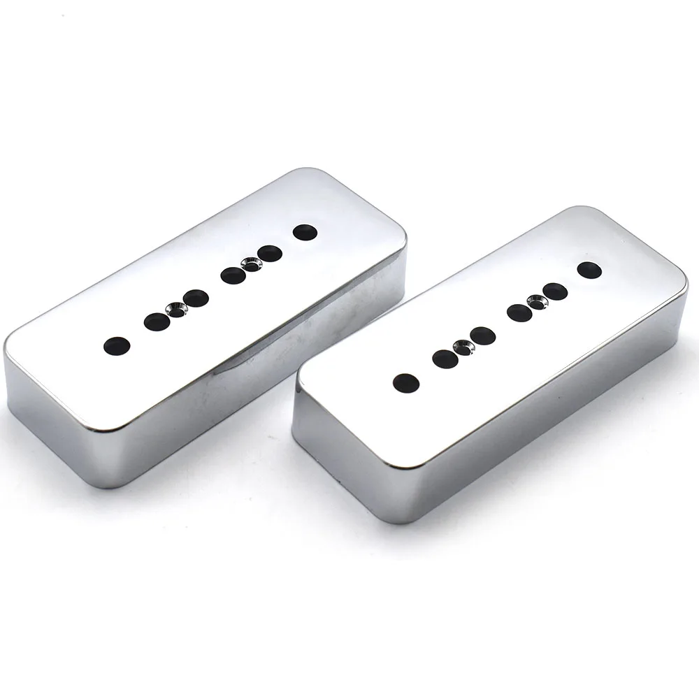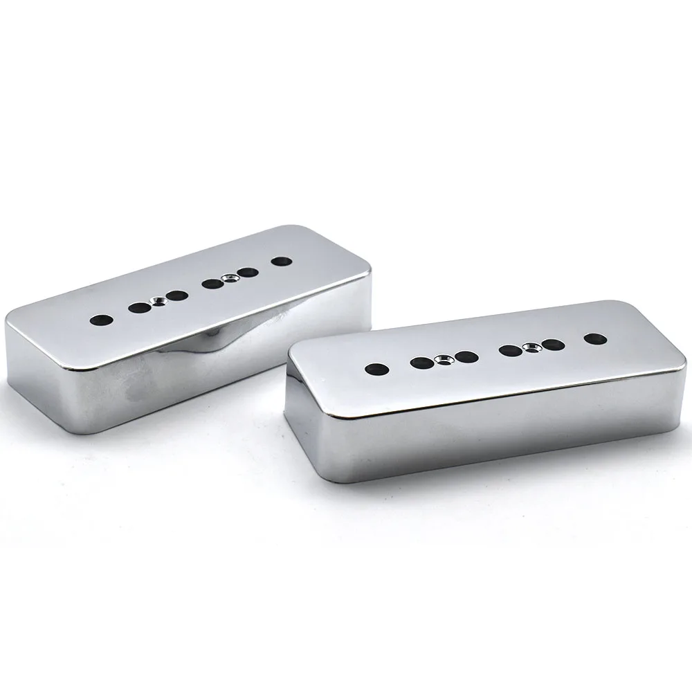 Enhance your electric guitar’s look and protection with this set of 12 P90 pickup covers with bobbins, available in 50mm (neck) and 52mm (bridge) sizes. Crafted from durable ABS plastic with a sleek chrome finish, these covers feature a minimalist design with evenly spaced black holes aligned along the top surface, adding both style and functionality. They fit snugly over P90 pickups, ensuring a seamless and modern appearance while safeguarding your gear. Perfect for replacement or customization, these covers are compatible with various electric guitar models and provide an elegant upgrade for any enthusiast aiming to combine aesthetic appeal with practical protection.