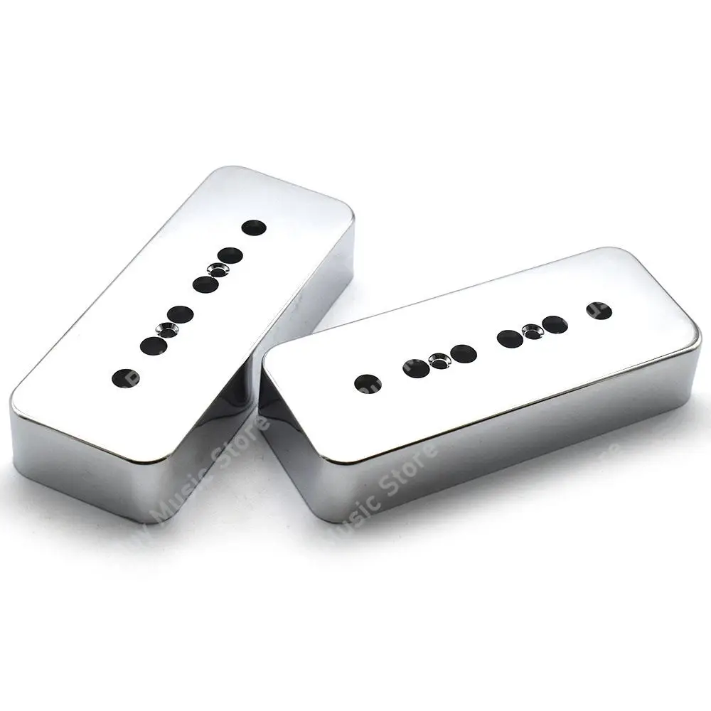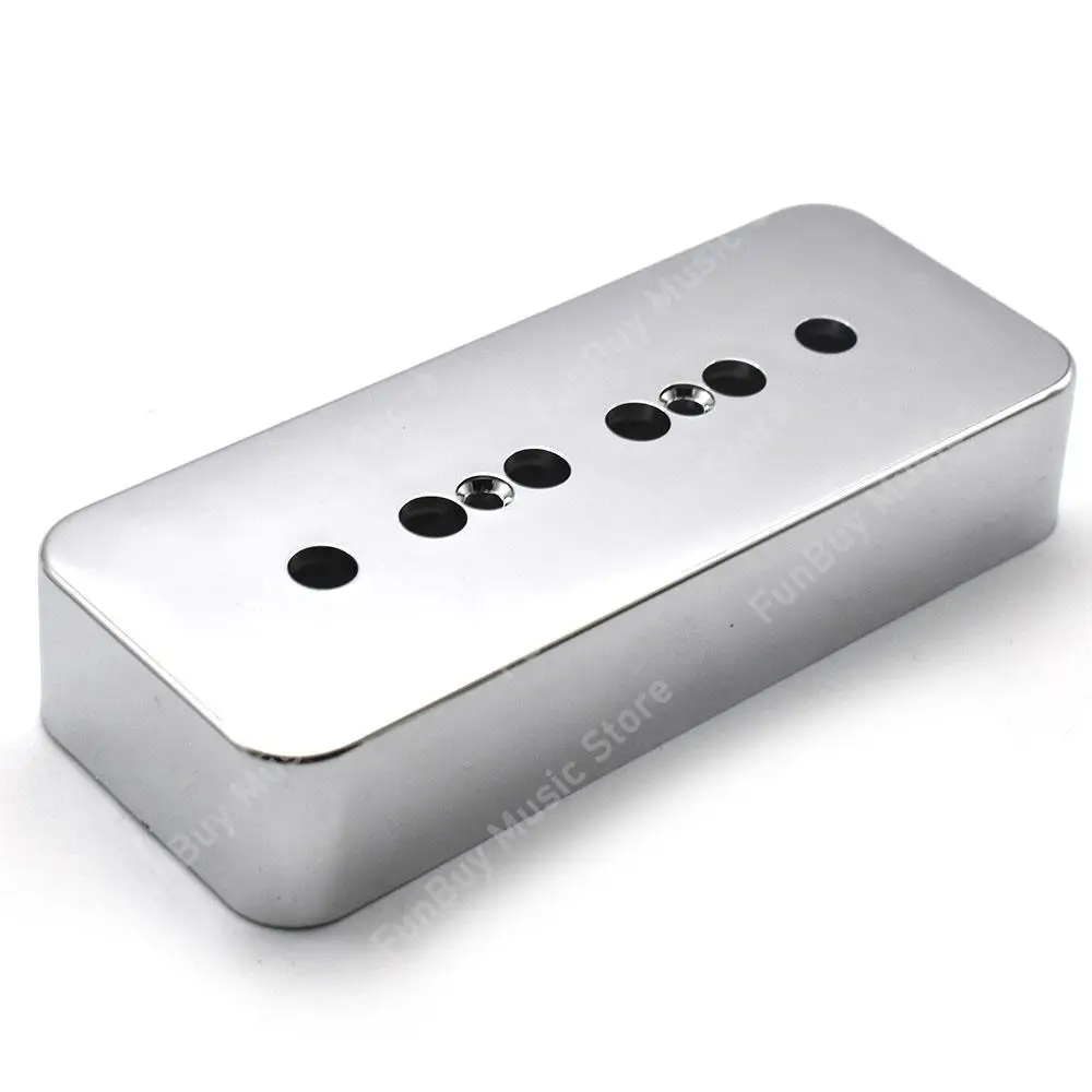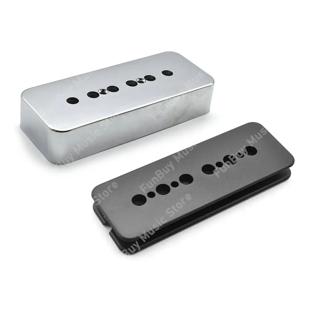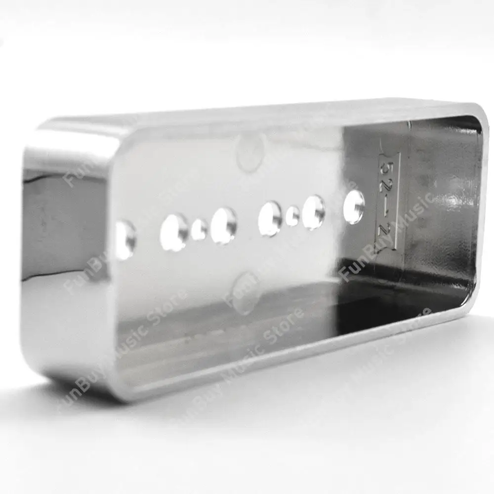 Enhance your electric guitar’s look and protection with this set of 12 P90 pickup covers with bobbins, available in 50mm (neck) and 52mm (bridge) sizes. Crafted from durable ABS plastic with a sleek chrome finish, these covers feature a minimalist design with evenly spaced black holes aligned along the top surface, adding both style and functionality. They fit snugly over P90 pickups, ensuring a seamless and modern appearance while safeguarding your gear. Perfect for replacement or customization, these covers are compatible with various electric guitar models and provide an elegant upgrade for any enthusiast aiming to combine aesthetic appeal with practical protection.