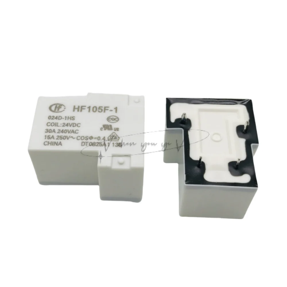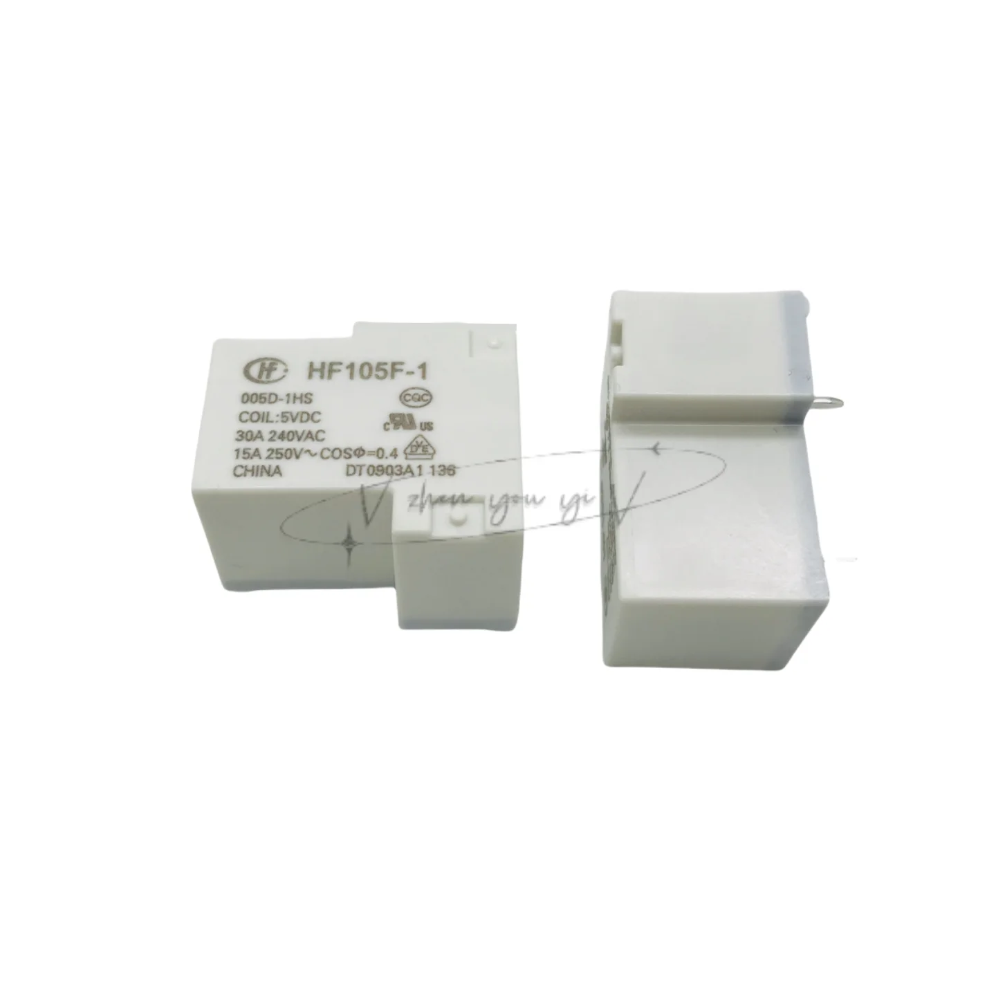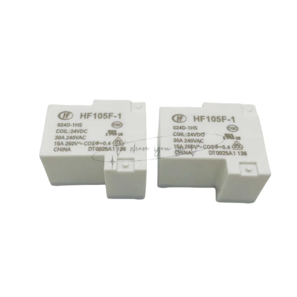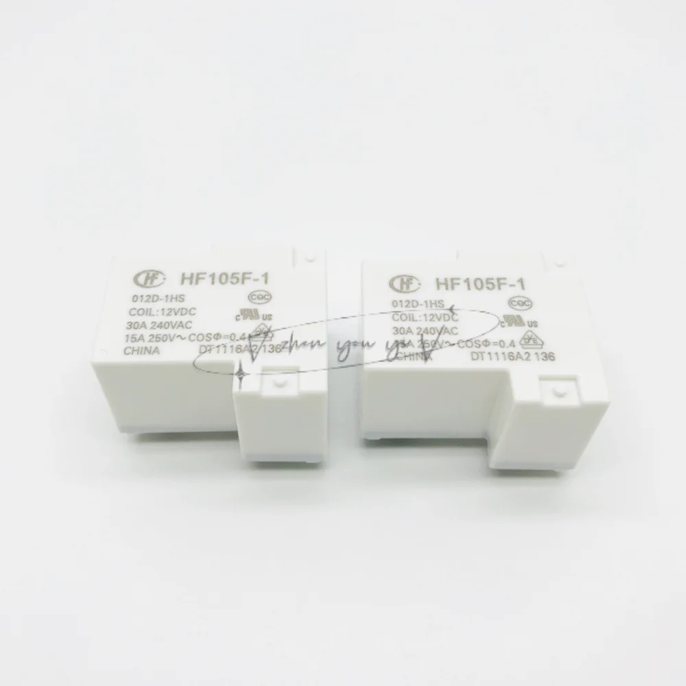 Experience reliable switching with this set of two identical, compact electromagnetic relays, enclosed in sleek white plastic housings. Designed for durability and ease of integration, these relays feature a rectangular, minimalist aesthetic that suits any electronic or industrial setup. The clear black printing on the front face displays essential technical details including model number HF105F-1-012D-1HS, voltage rating (12V DC), and electrical ratings like 30A at 240VAC or 15A at 250V. The black internal relay coil and contact points are visible through the housing, emphasizing precision engineering. Their sealed design ensures protection against dust and moisture, providing peace of mind in various operational environments. These relays are perfect for professionals seeking dependable and easily identifiable switching solutions.