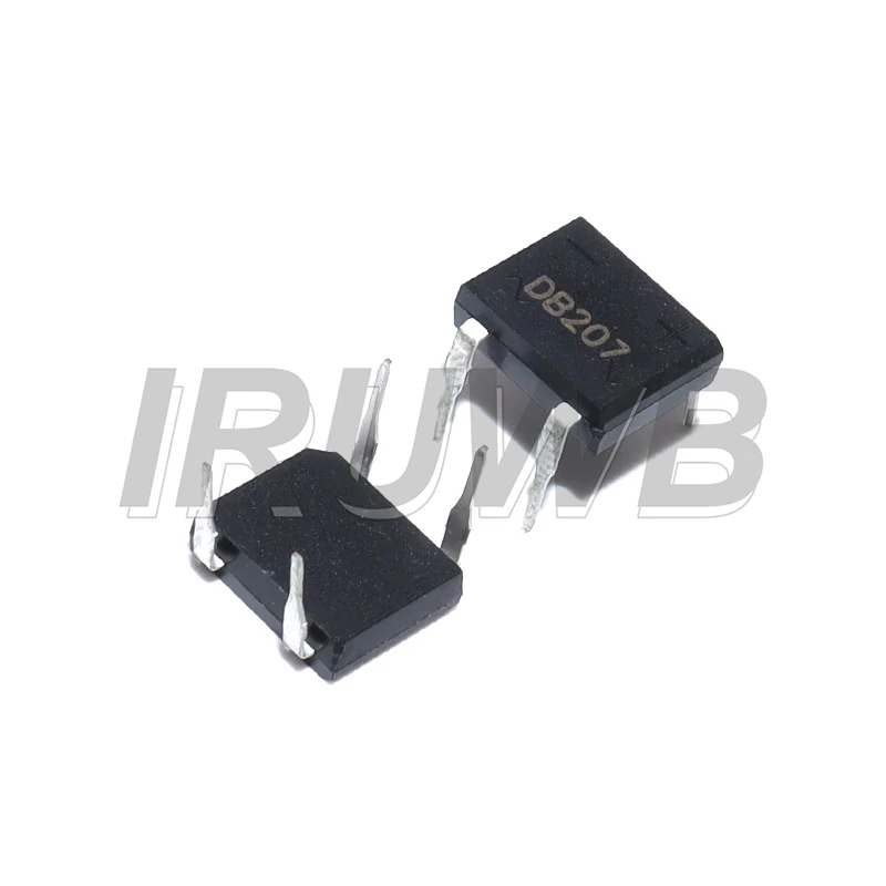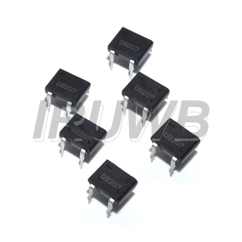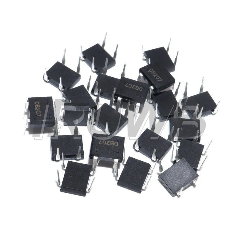 This set includes 20 DB207S bridge rectifiers in DIP-4 packages, designed for reliable power conversion with a maximum voltage of 1000V and a current of 2A. Crafted for high stability, they feature excellent self-healing performance and long-lasting durability. These through-hole components are ideal for electronic applications requiring efficient rectification, offering a professional, uniform design with a sleek black rectangular body, accented by clear light-colored markings on the top surface. The metallic leads are neatly bent outward for easy insertion into through-hole PCB sockets, making them a dependable choice for customizing and maintaining electronic circuits.