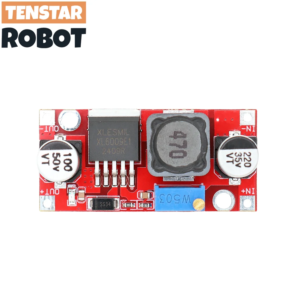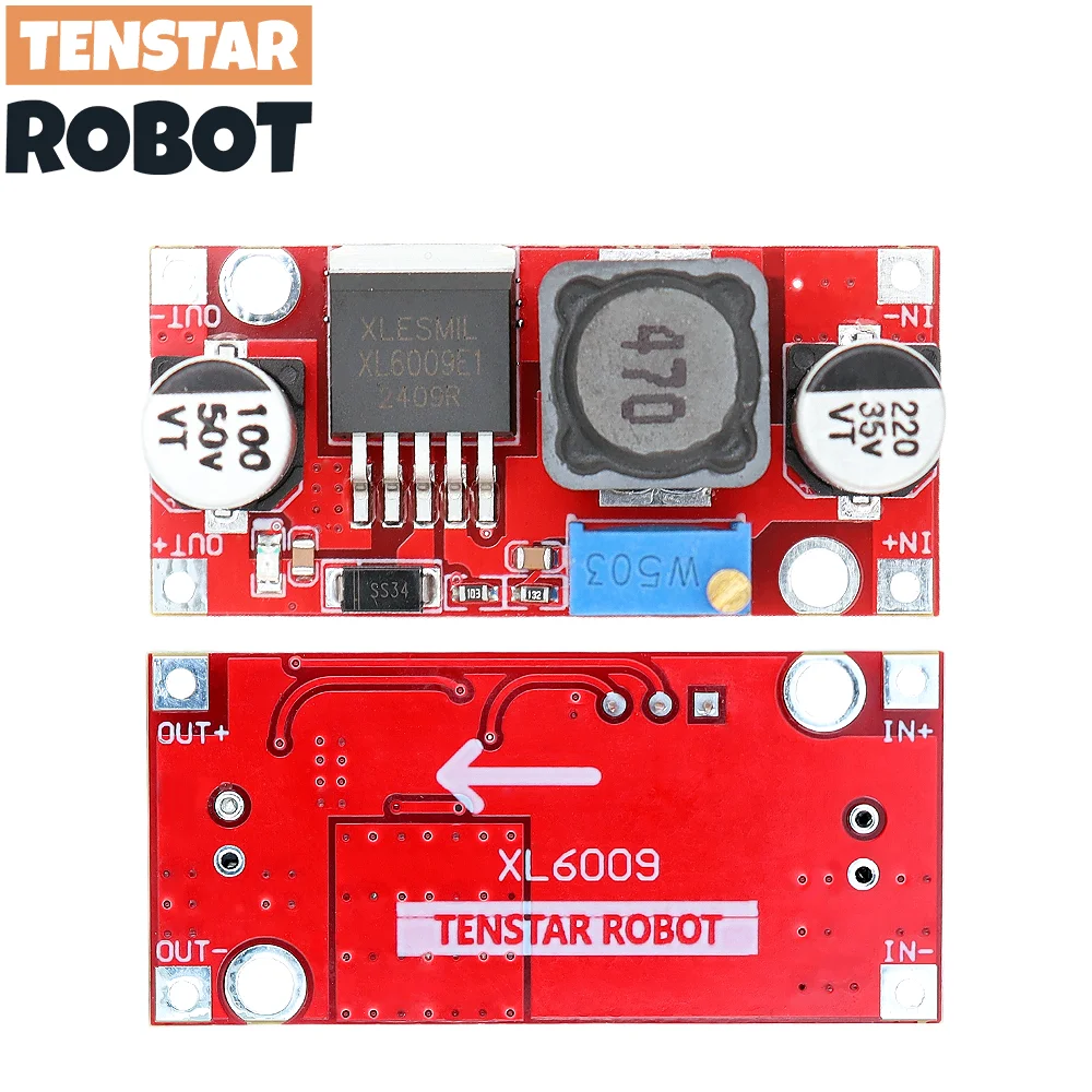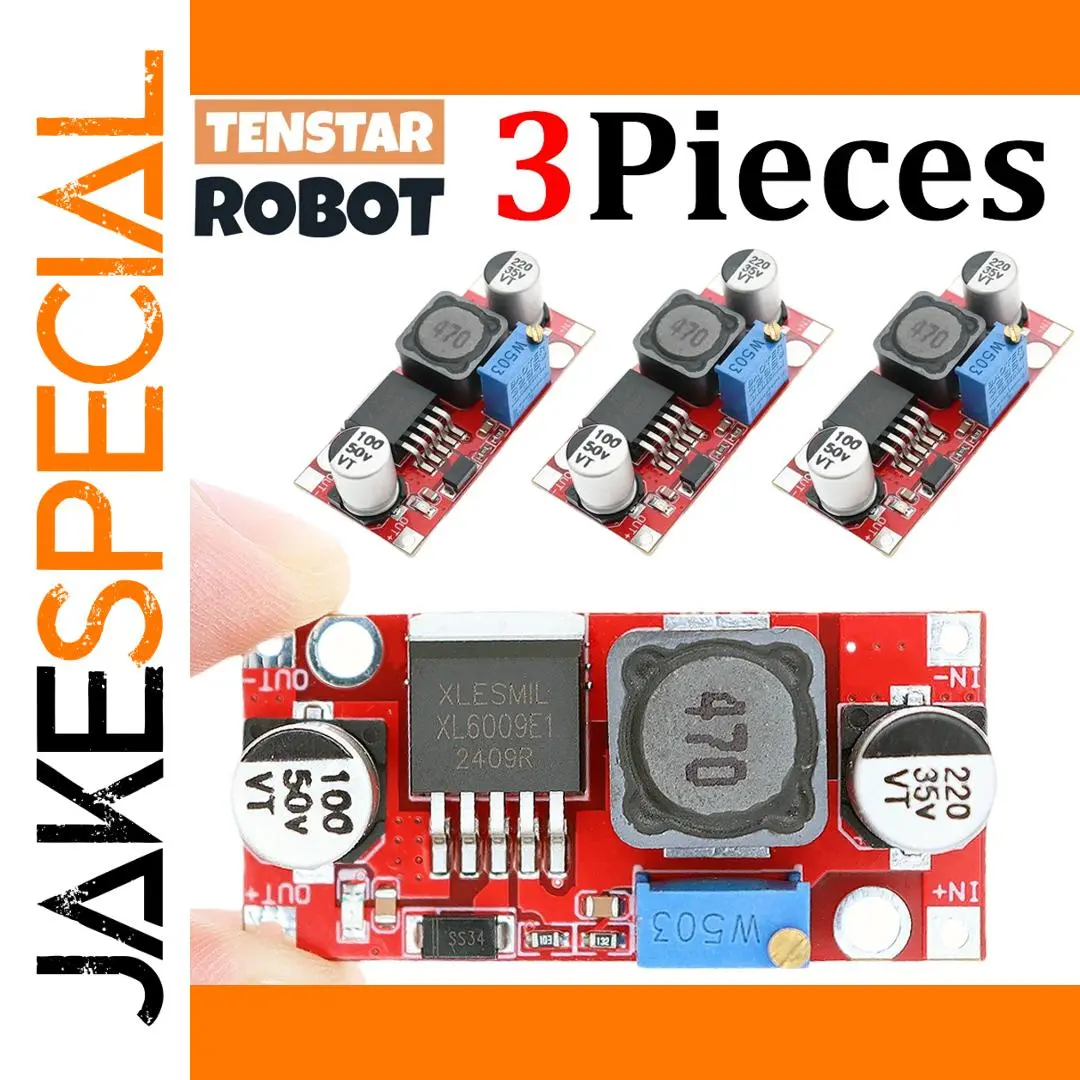 Experience the power of this set of three vibrant red XL6009 DC-DC booster modules, designed to enhance your electronic projects and power supply setups. With a bold red PCB and a compact rectangular layout, these modules combine functionality with a striking aesthetic. Each module features a prominent black IC labeled “XLESML XL6009E1 2409R,” large electrolytic capacitors with white casing and black text, and a light blue potentiometer for easy adjustment of output voltage. The modules' design emphasizes clarity and usability, with mounting holes for secure placement, making them ideal for DIY electronics, repairs, and custom power solutions. Installing these modules will bring a new level of efficiency and style to your projects, making power management simple and reliable.