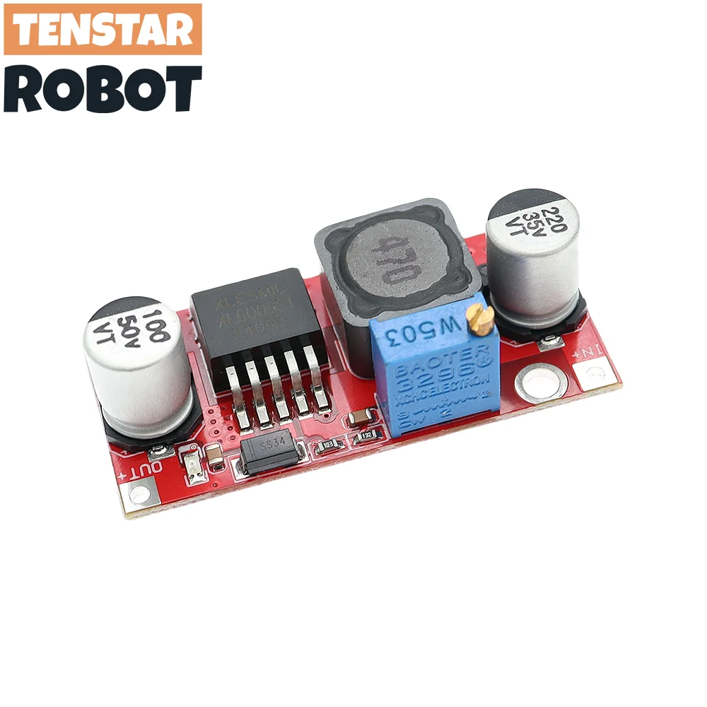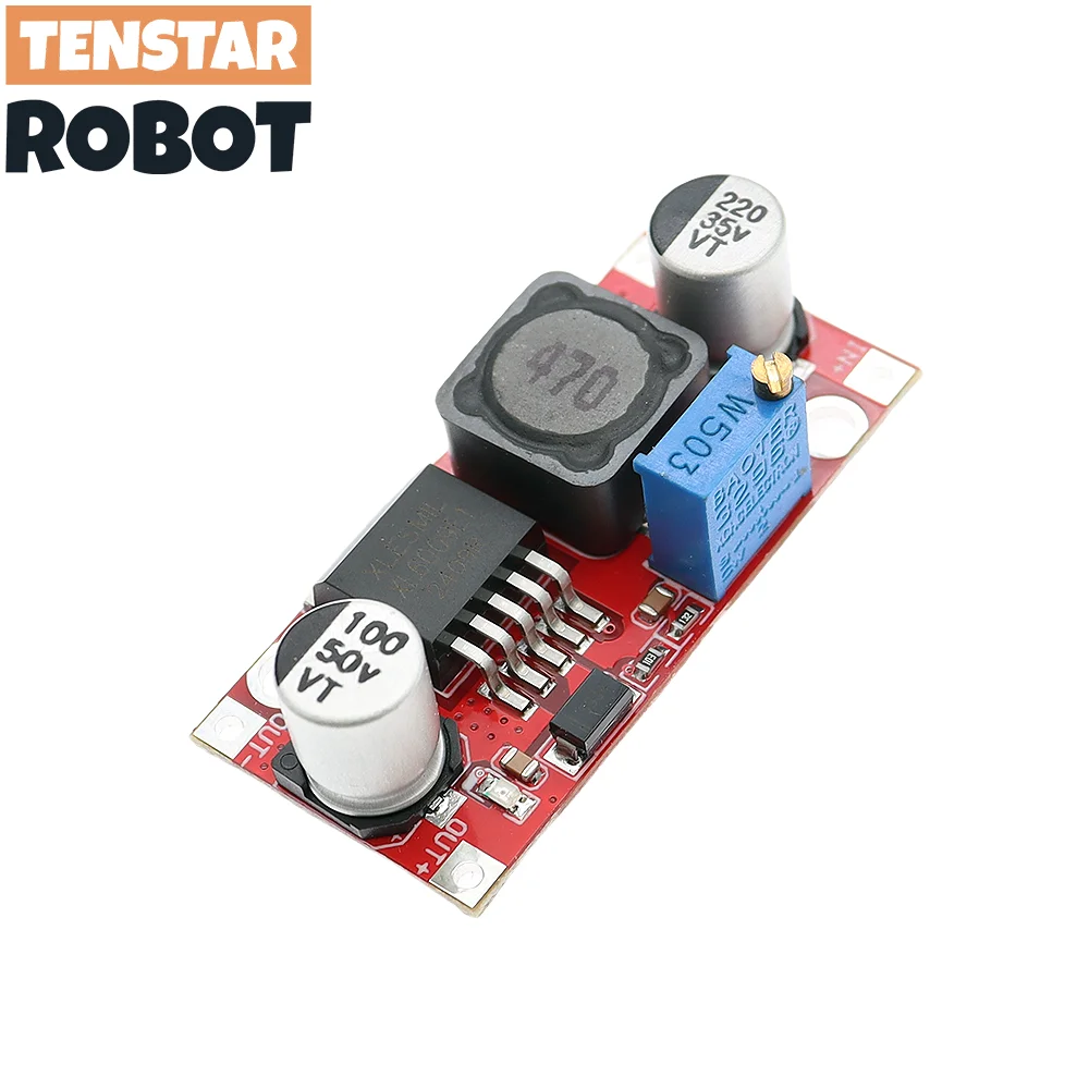 - The adjustable output voltage, controlled via a small blue potentiometer with a brass screw, allows precise customization based on your project needs.