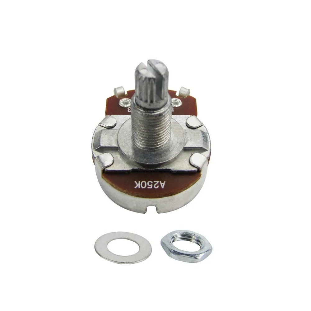 Upgrade your guitar’s electronics with this set of four full-size metal potentiometers, featuring resistance options of 250kΩ or 500kΩ in A and B types. Each potentiometer has a durable metallic finish, a long 18mm split shaft with a 6mm diameter, and an 8mm threaded shaft for secure fitting. The compact base measures approximately 24mm in diameter, with a total length of around 27.5mm, making them ideal for replacing or upgrading tone and volume controls. The coarse knurled shaft ensures easy grip and compatibility with most control knobs, providing a sleek, professional look and reliable performance for your guitar modifications.