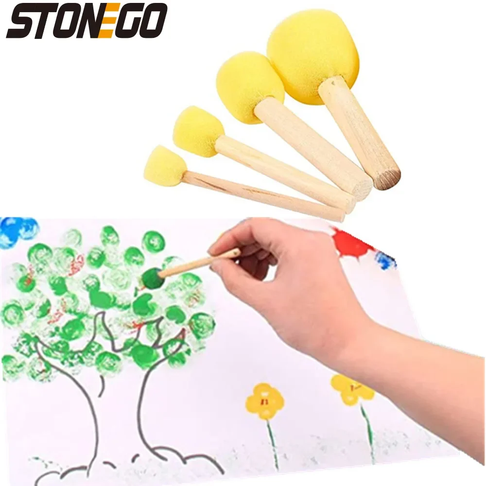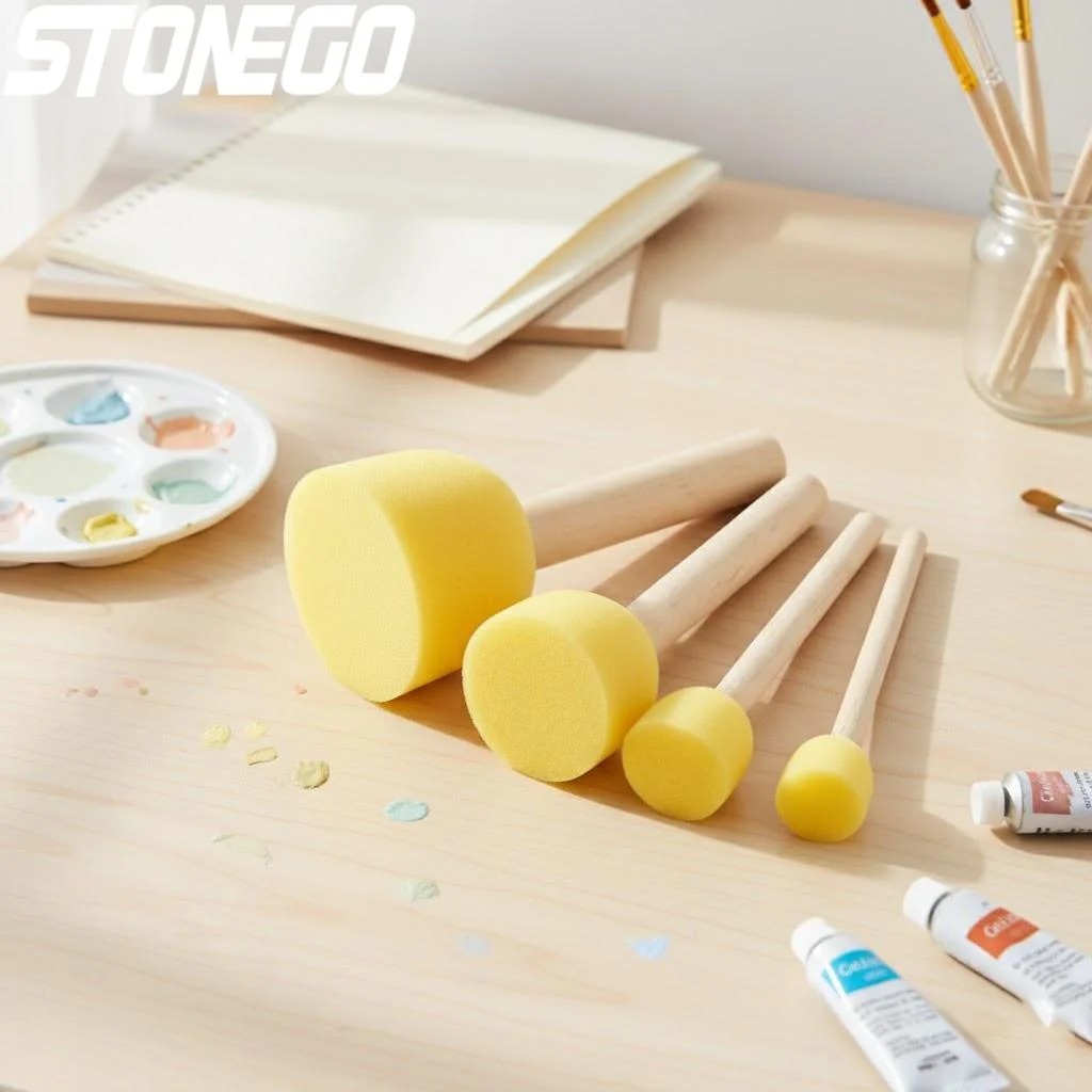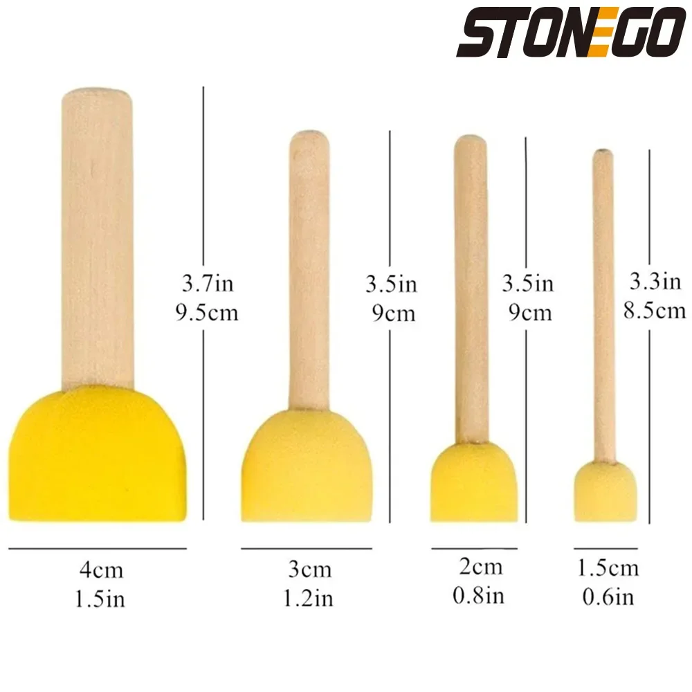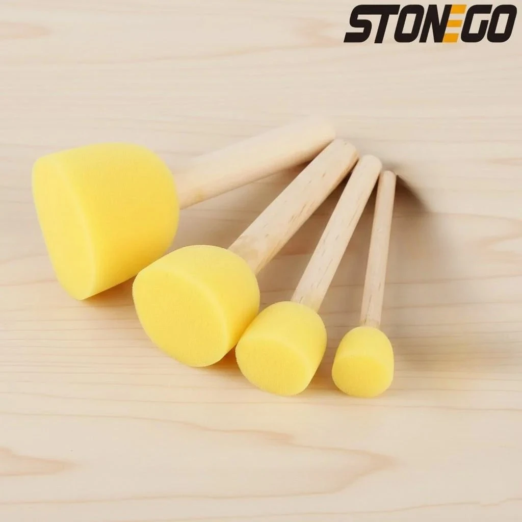 - Technical specifications include foam diameters of 4cm, 3cm, 2cm, and 1.5cm; bright yellow high-quality sponge; light-colored wooden handles; compatible with watercolor and acrylic paints; suitable for staining and varnish projects; designed for washable, reusable use.