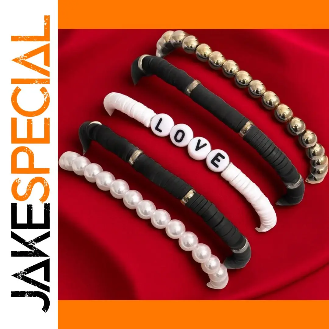 - The set features bold, shiny silver metallic beads, playful black and white alphabet beads spelling “LOVE,” and white lustrous faux pearls for a timeless, elegant appearance.