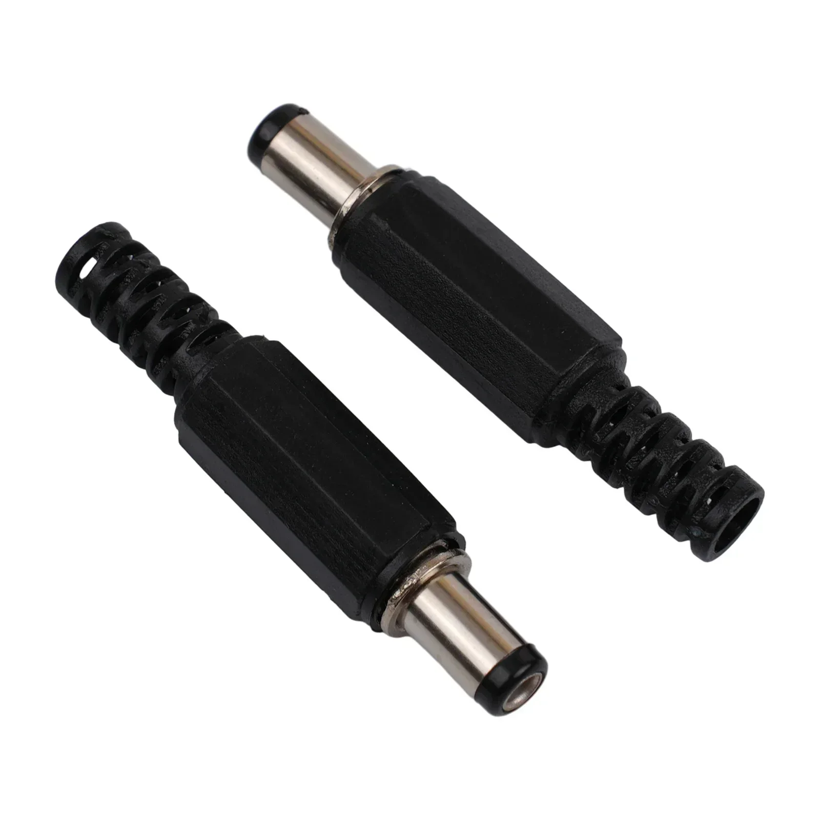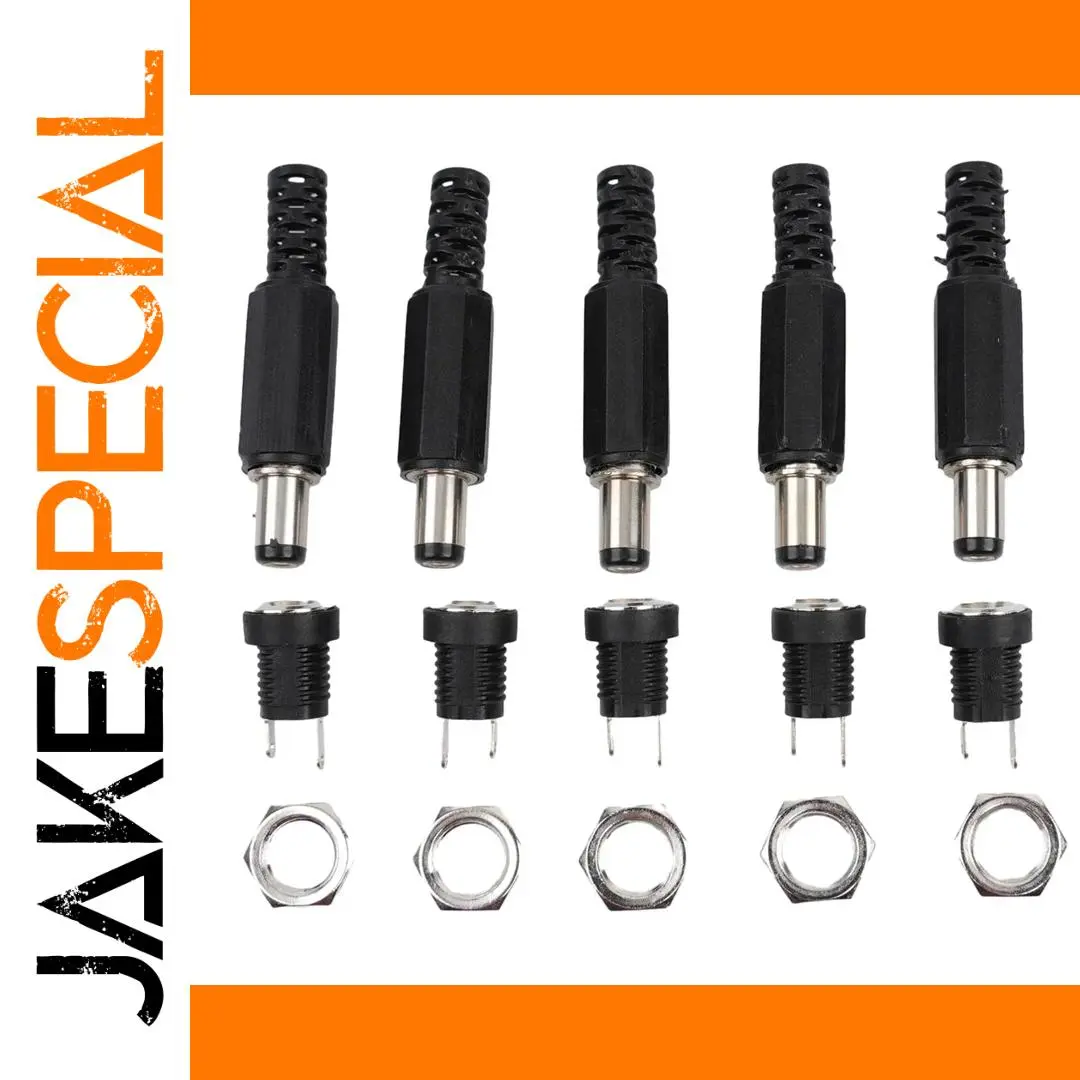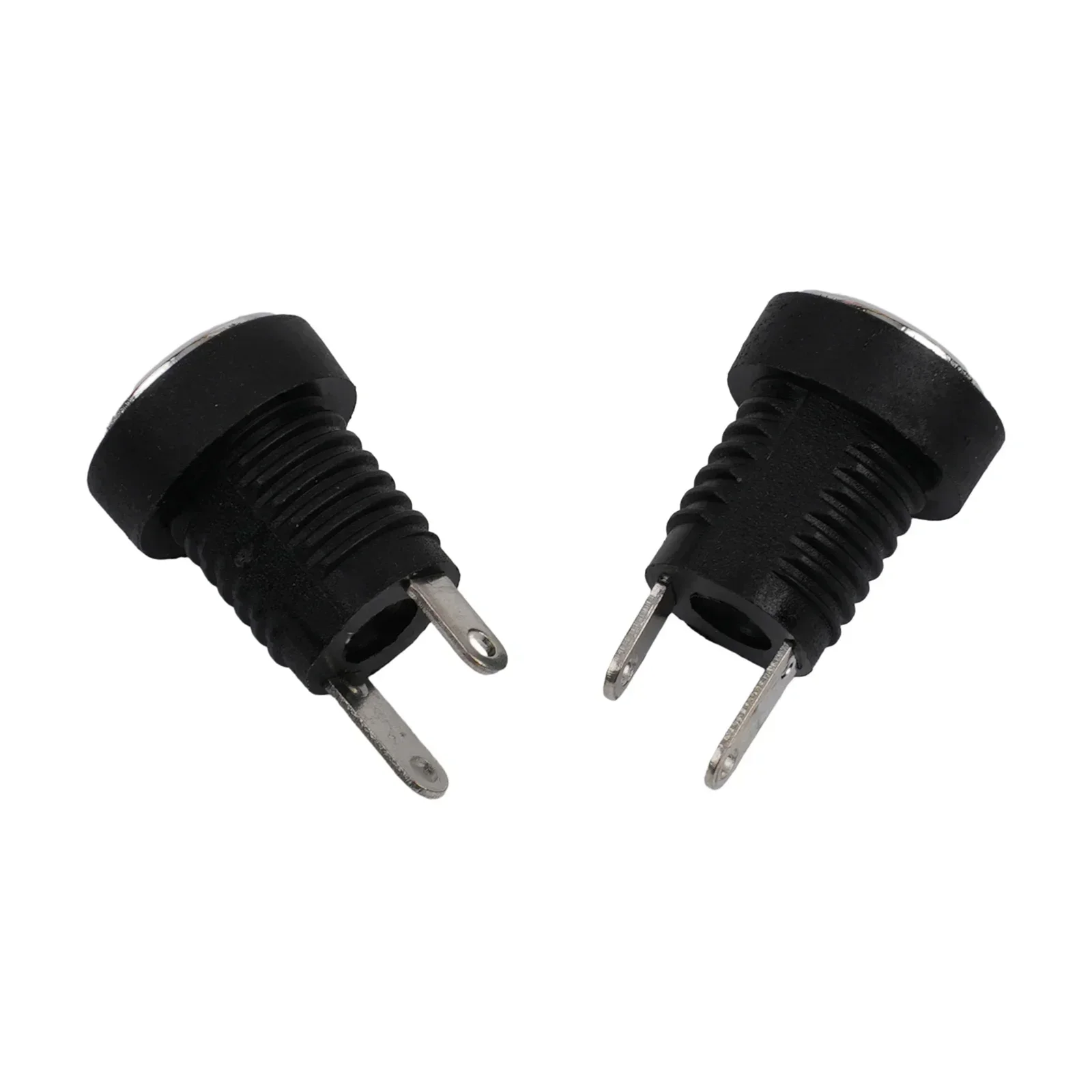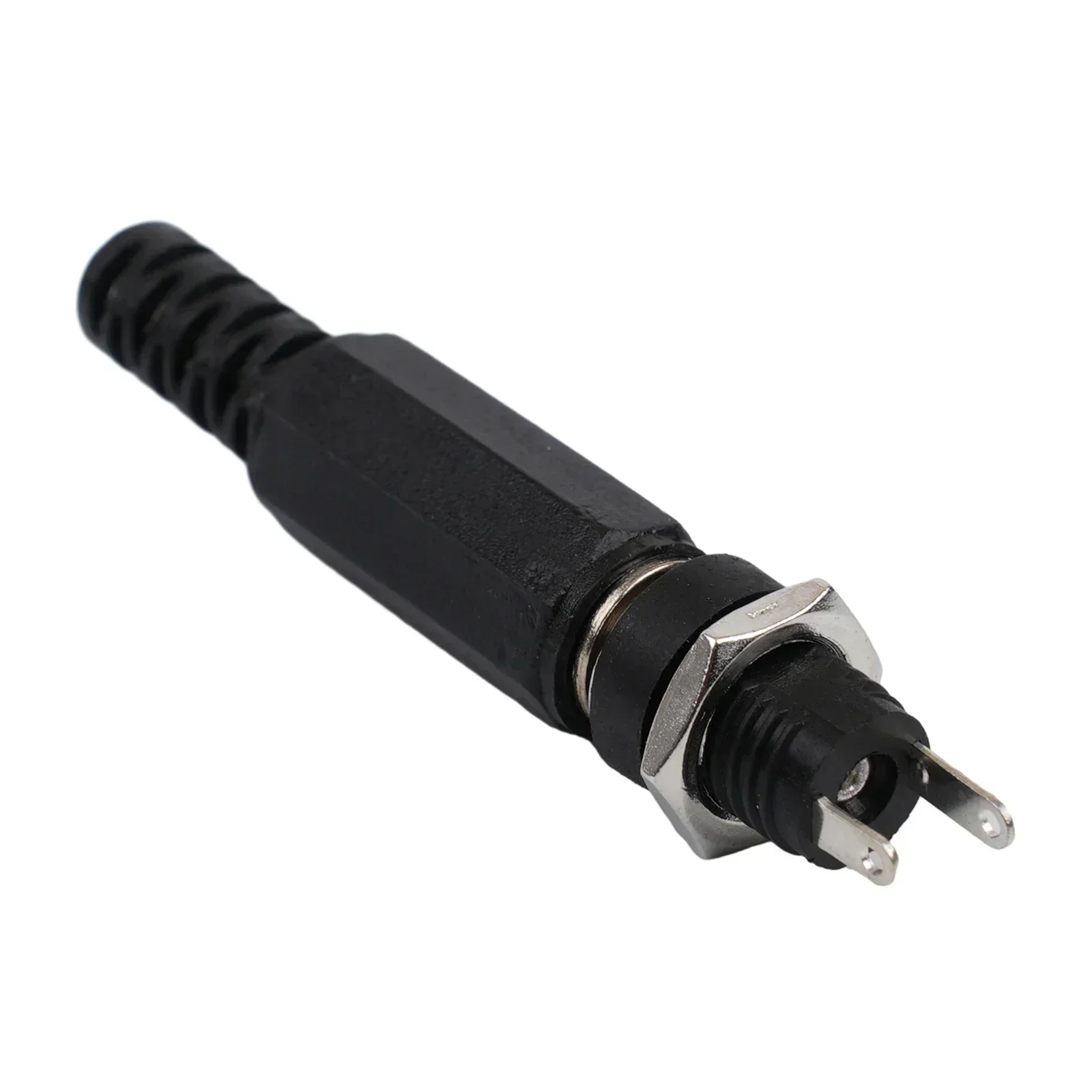This set includes five high-quality panel mount DC power connectors with sizes of 5.5/2.1mm, 5.5/2.5mm, 5.5/3.5mm, 5.5/1.35mm, and 5.5/2.1mm, rated for 3A at 5V and 12V. Crafted with a sleek black plastic body and shiny metallic nuts, these connectors feature an external diameter of 5.5mm and internal diameters suitable for various power applications. Their simple installation involves inserting cables into the holes, locking in place, and soldering, with wiring indicating the longer pin as negative and the shorter as positive. Perfect for replacing worn connectors or creating custom cables, these durable components ensure a professional, industrial aesthetic suited for electronic enthusiasts and professionals alike.