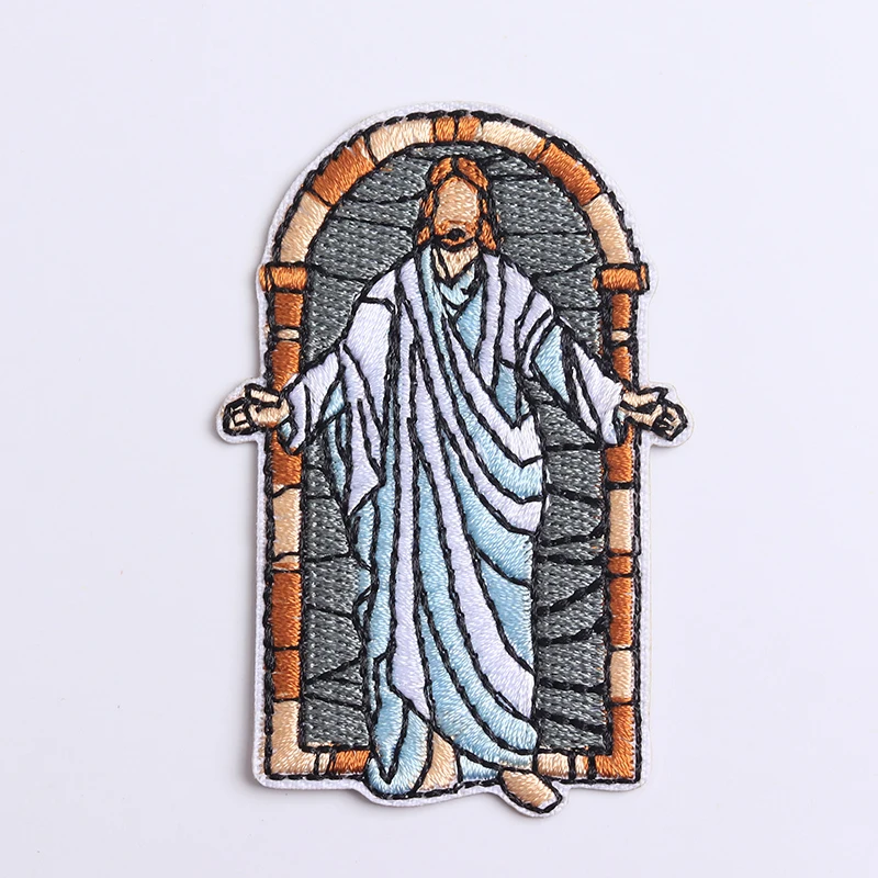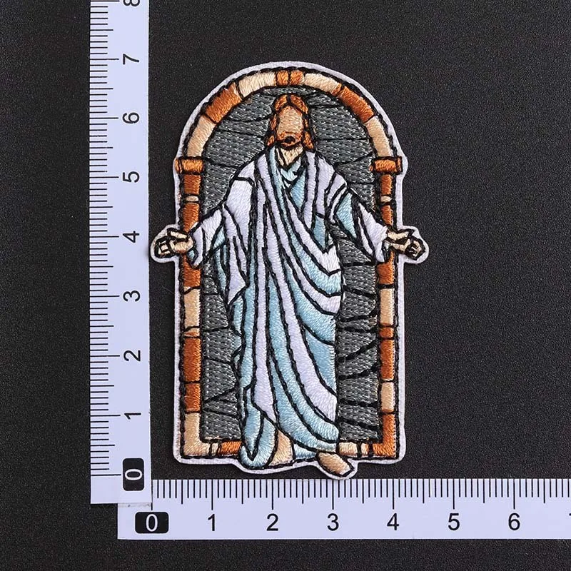 Transform your clothing and accessories with this exquisite set of five embroidered patches, each measuring 6.8 cm by 4.6 cm. Designed to showcase a religious figure, likely Jesus, these patches feature intricate 3D embroidery with vibrant terracotta and earthy gray hues surrounding the beautifully detailed figure dressed in flowing white robes, highlighted with delicate shades of light blue. Made from durable polyester, they boast a tactile quality and are perfect for personalizing apparel or home décor. Simply use a household iron or heat press machine to adhere these patches, making them a versatile choice for any DIY enthusiast.