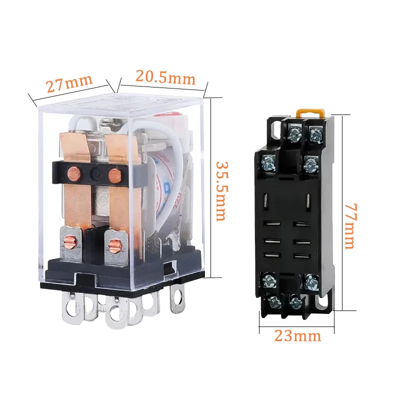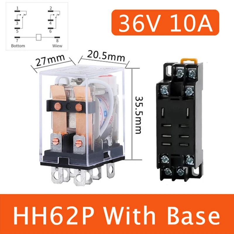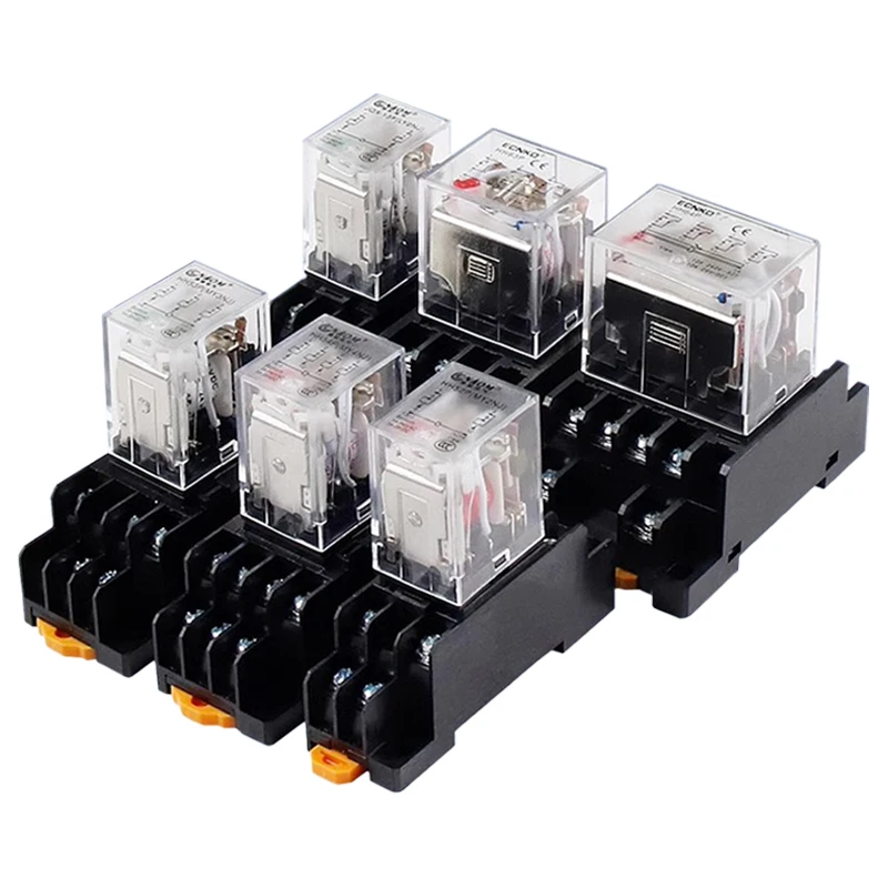 - The relays operate at multiple voltages: 12V, 24V, 36V, 110V, or 220V, with each unit mounting on an 8-pin socket base for simple installation and replacement in your control system.