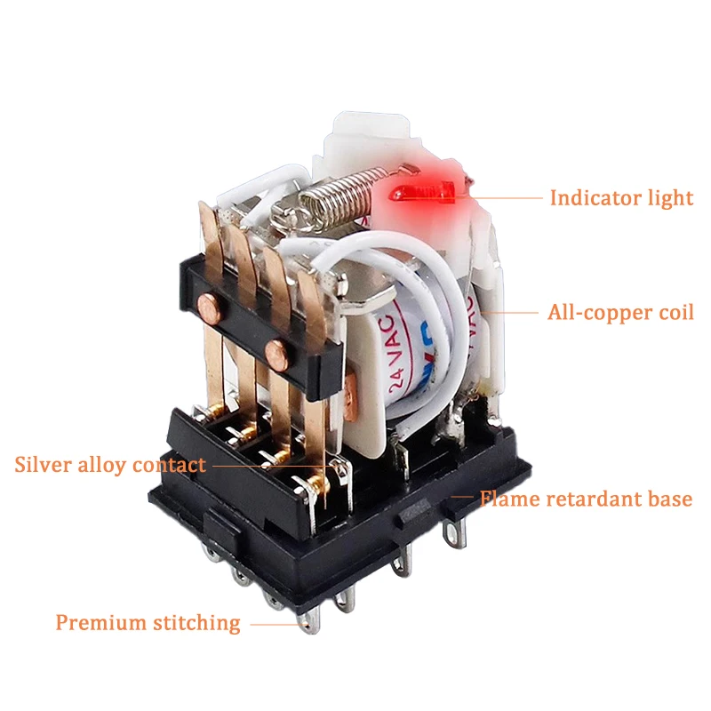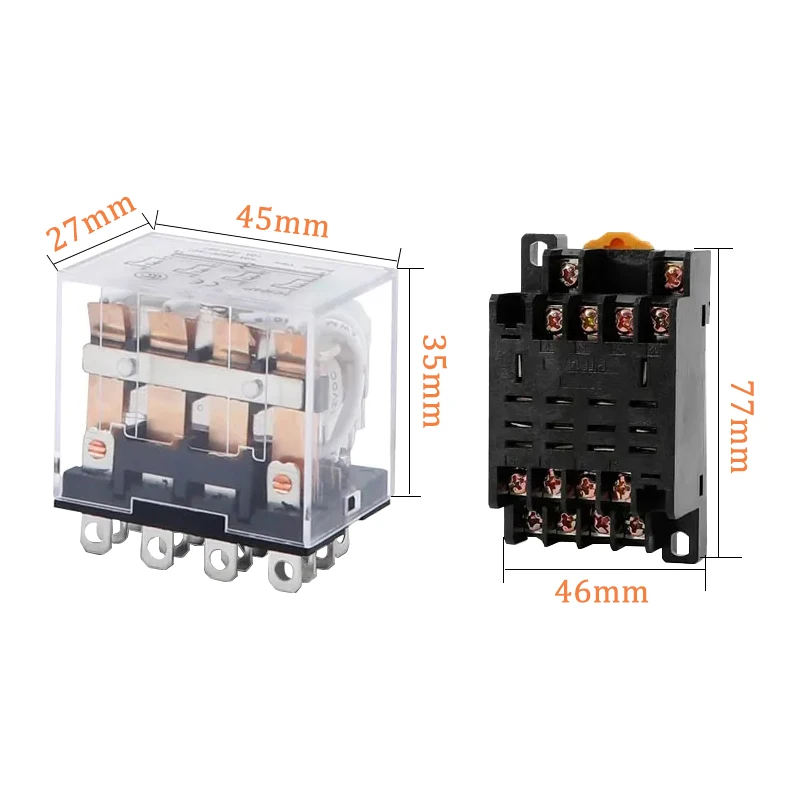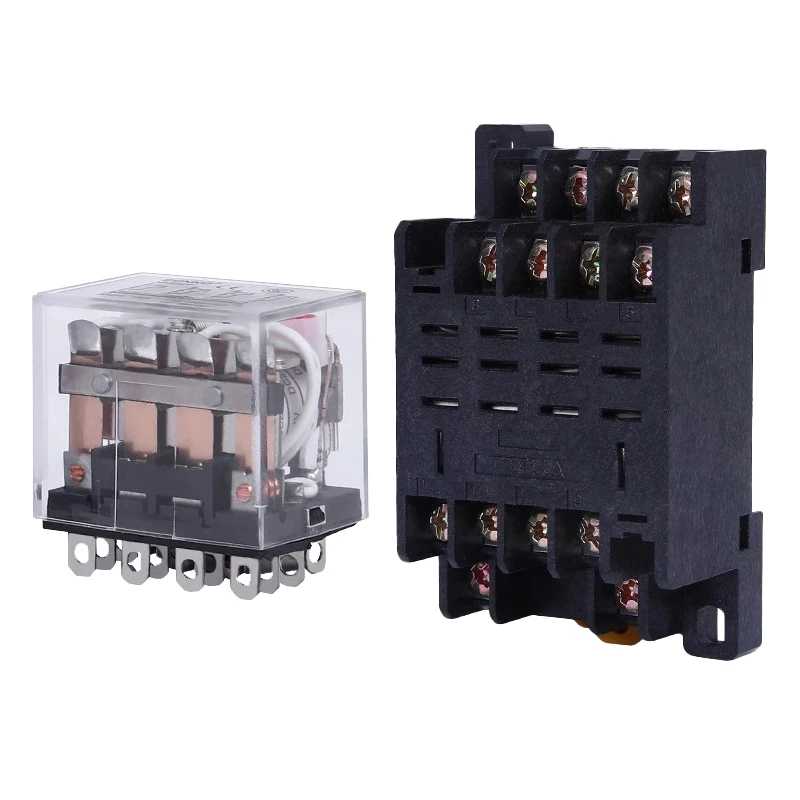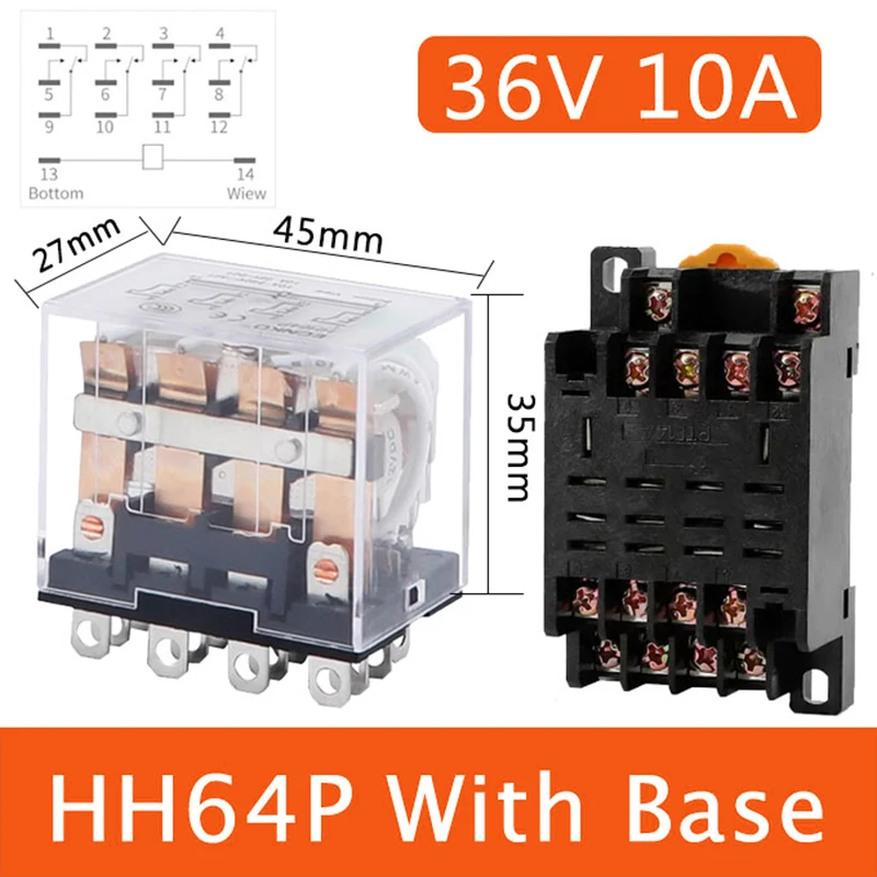 This set of five electromagnetic relays features a sleek, compact design with a black plastic housing and transparent cover, revealing copper-colored coils and silver metal contacts. Each relay is equipped with a 14-pin socket base (PTF14A) and operates on voltages of 12V, 24V, 36V, 110V, or 220V, supporting a current rating of 10A. They are suitable for general-purpose switching applications in electrical and automation systems, offering versatile compatibility with AC loads of 110V, 220V, or 380V, and DC voltages of 12V, 24V, or 36V. Their reliable, sturdy construction ensures precise performance in demanding environments.