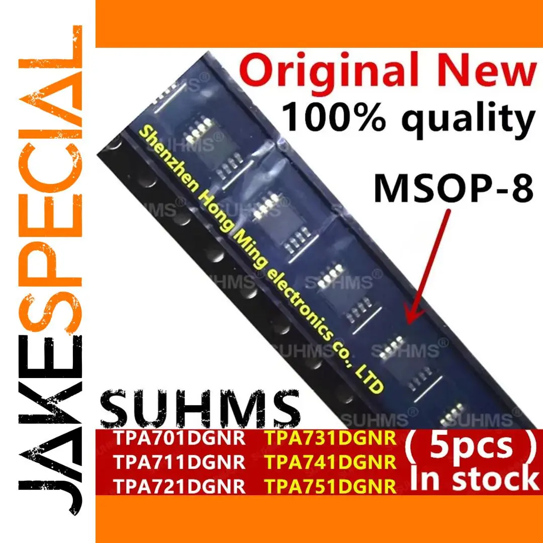 Enhance your electronic projects with this set of five brand-new voltage regulators in MSOP-8 package, including models TPA701DGNR ABA, TPA711DGNR ABB, TPA721DGNR ABC, TPA731DGNR AJC, TPA741DGNR AJD, and TPA751DGNR ATC. Designed for reliable performance in computer applications, these regulators feature a sleek black plastic tape with bright blue inserts and vivid yellow side printing, showcasing a modern, professional look. Each component is precisely mounted with metallic pins on one side, ensuring secure installation. Built to meet international voltage standards, they are ideal for maintaining stable power supply, providing you with peace of mind for your electronic endeavors.
