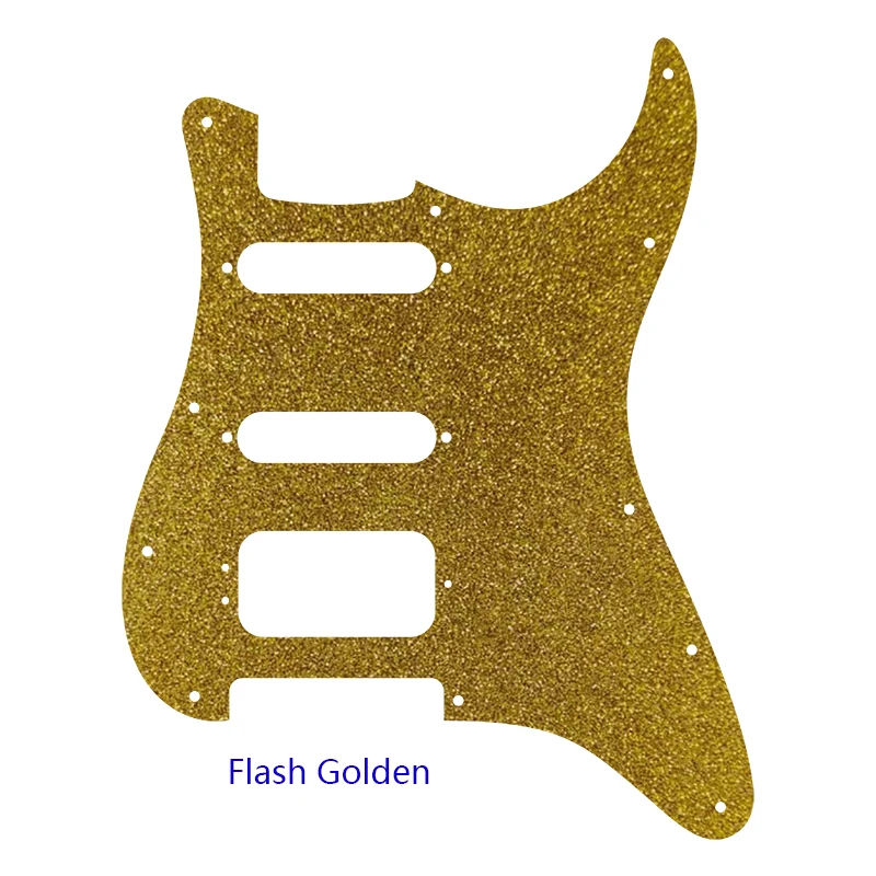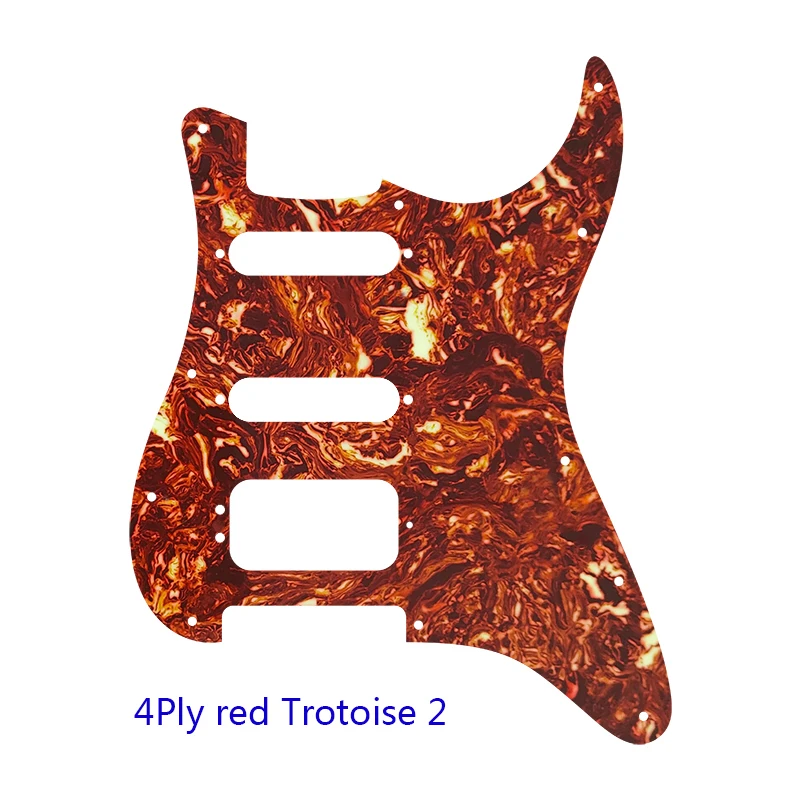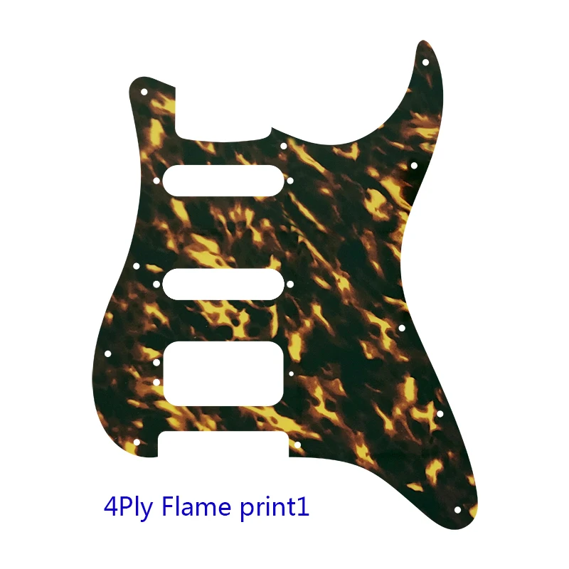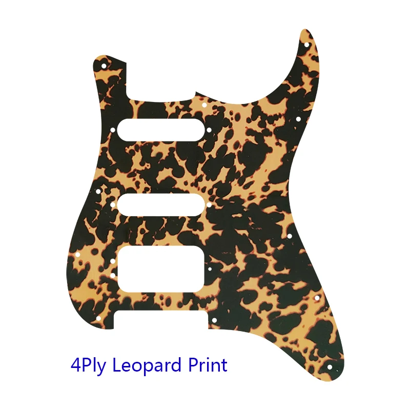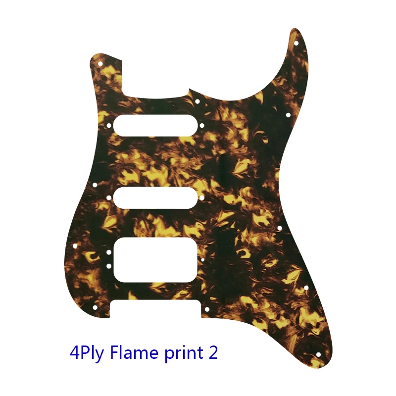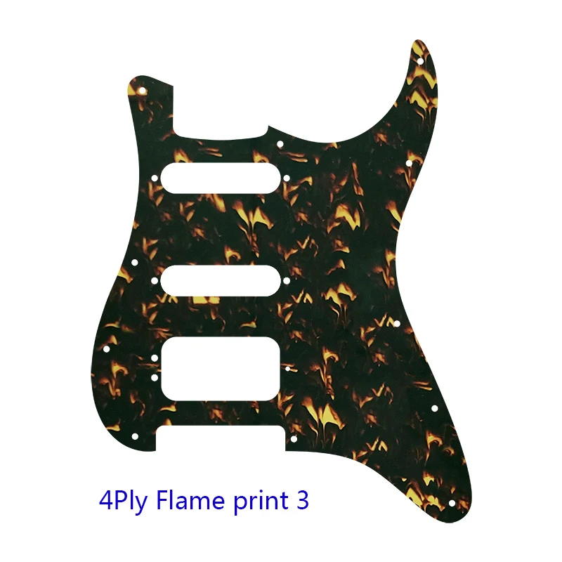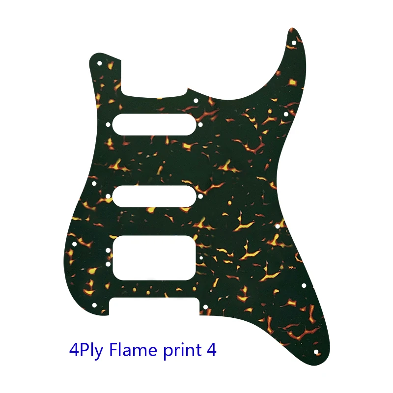 Elevate your Stratocaster with this vibrant set of five guitar pickguards, specially designed for 11 screw hole HSS models. Each pickguard showcases unique colors and eye-catching patterns, including leopard print and flame motifs, ensuring your guitar stands out. Made from high-quality PVC and composite materials, they provide durability and protection against scratches. The inclusion of a real aluminum foil shield effectively minimizes noise, making your performance cleaner. With dimensions of 285mm x 230mm x 2.4mm and a weight of approximately 105g-110g, these pickguards offer a perfect fit and substantial quality for your instrument.