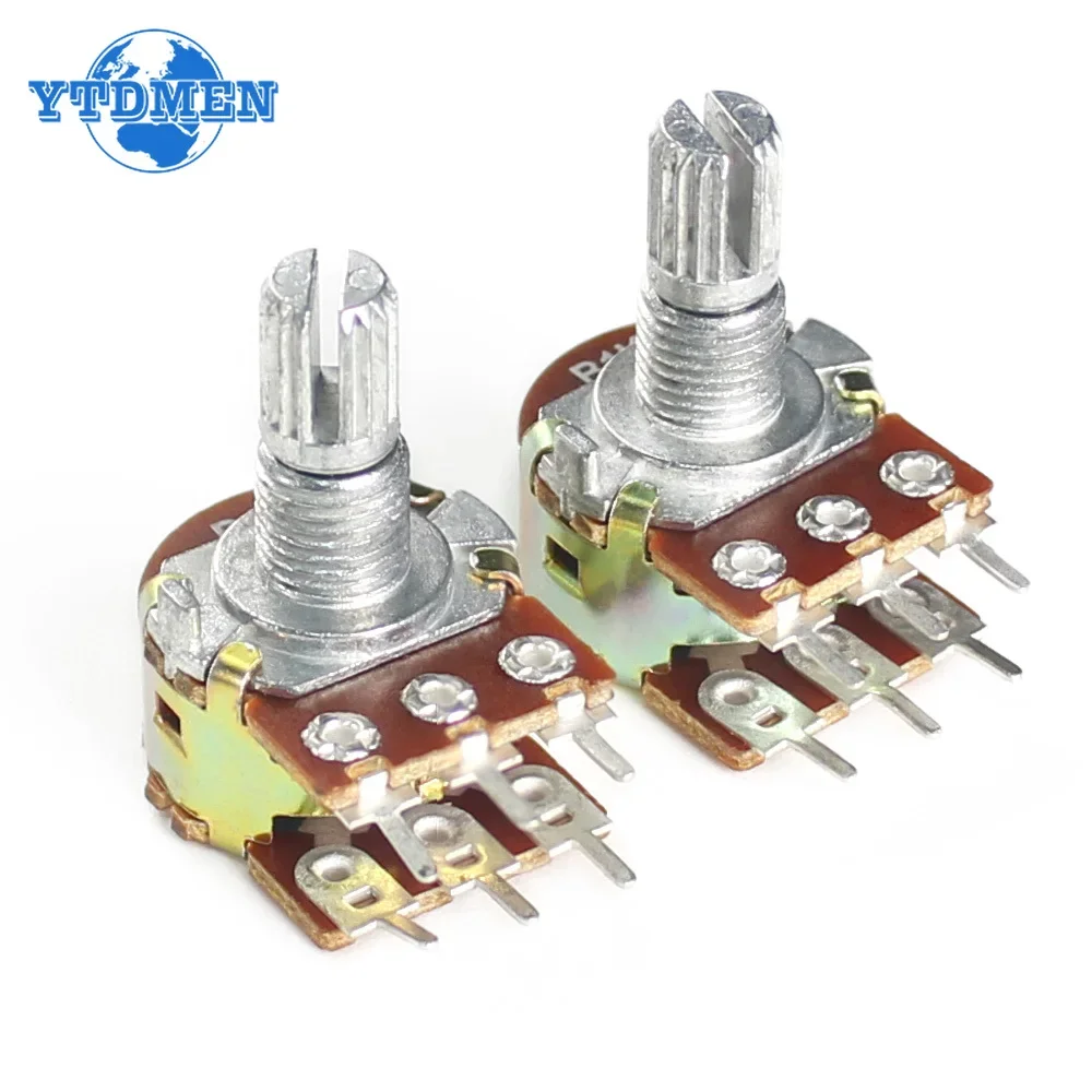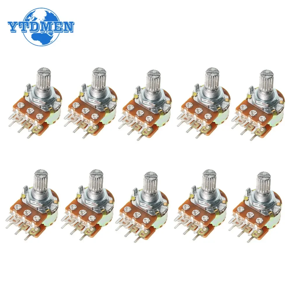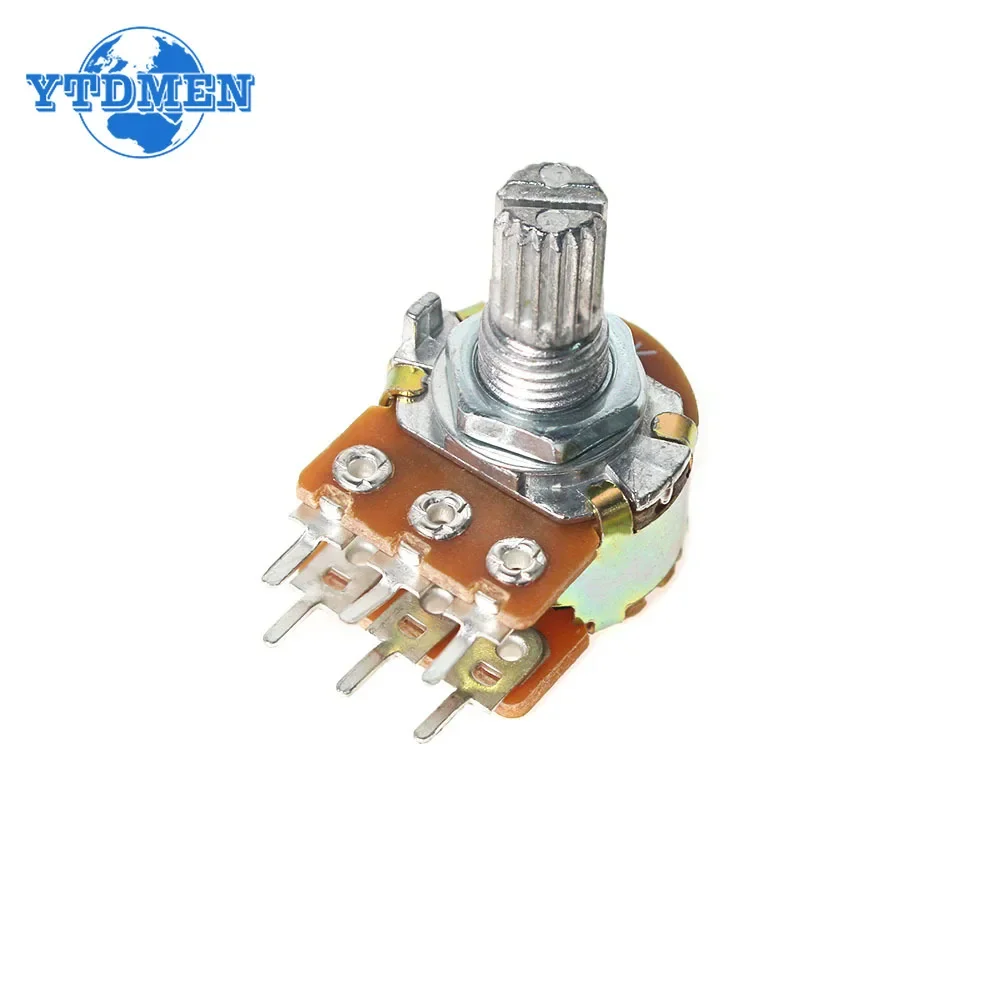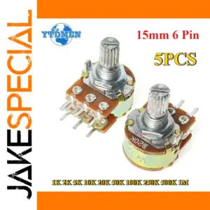 Enhance your electronic projects with this set of five WH148 rotary potentiometers featuring resistance values of 10KΩ, 20KΩ, 50KΩ, 100KΩ, and 250KΩ, along with 1KΩ, 2KΩ, 5KΩ, 500KΩ, and 1MΩ options. Each has a sleek cylindrical design with a metallic iridescent finish in silver and gold tones, a 15mm shaft with a 300°±10° rotation angle, and six solder pins for secure connections. Rated for 0.05W (Curve B) and 0.025W, with max voltages of 50VDC or 25VAC, these durable potentiometers are perfect for audio, electronics, communication, and medical devices, offering reliable performance over 10,000 cycles.