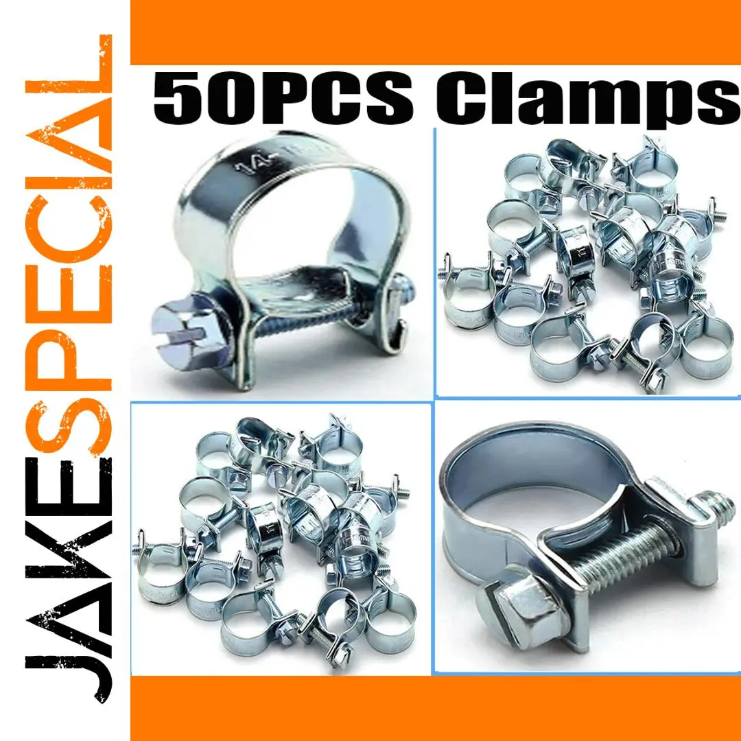 - Includes 50 metal clamps available in size variants from 7mm to 17mm diameter, suitable for various hose and pipe fixing needs around the home or workshop.