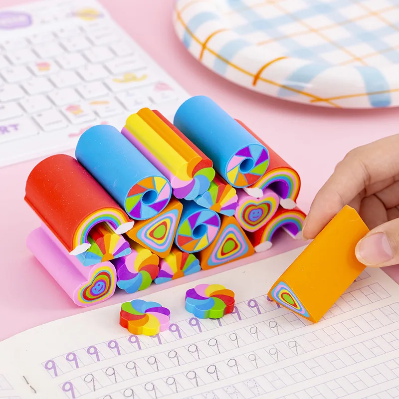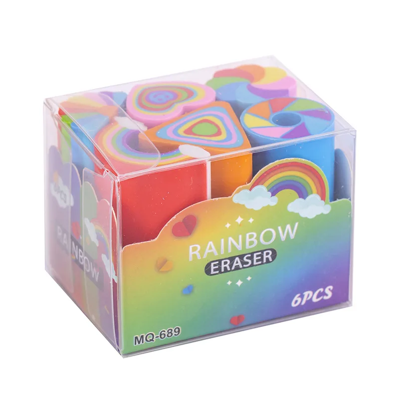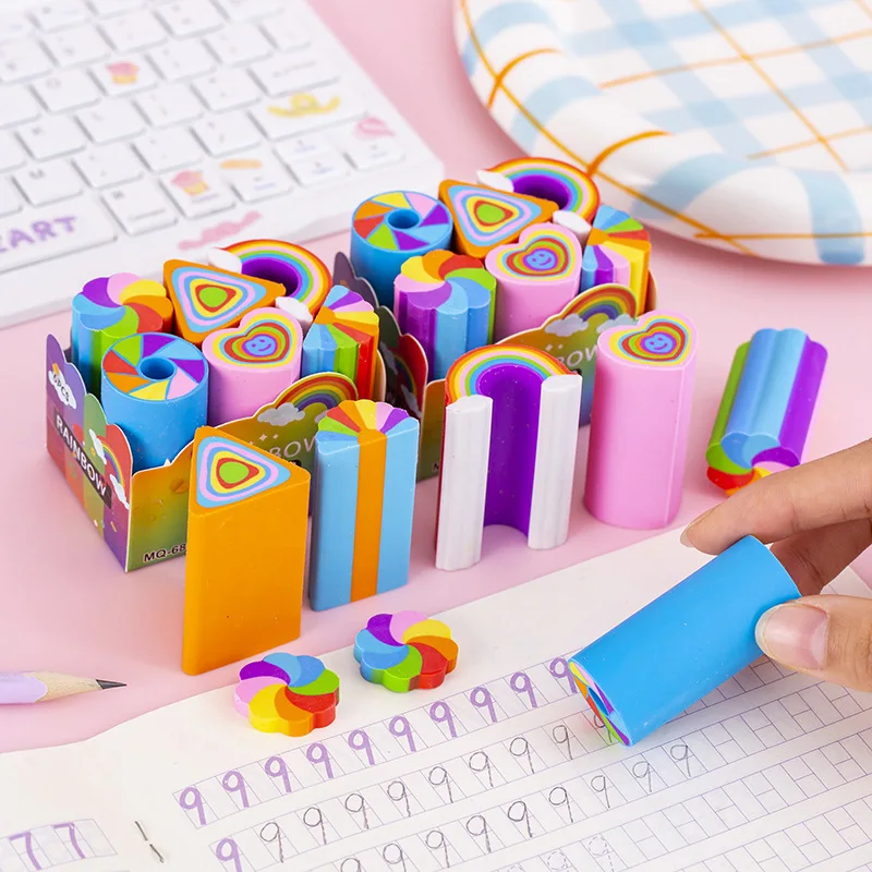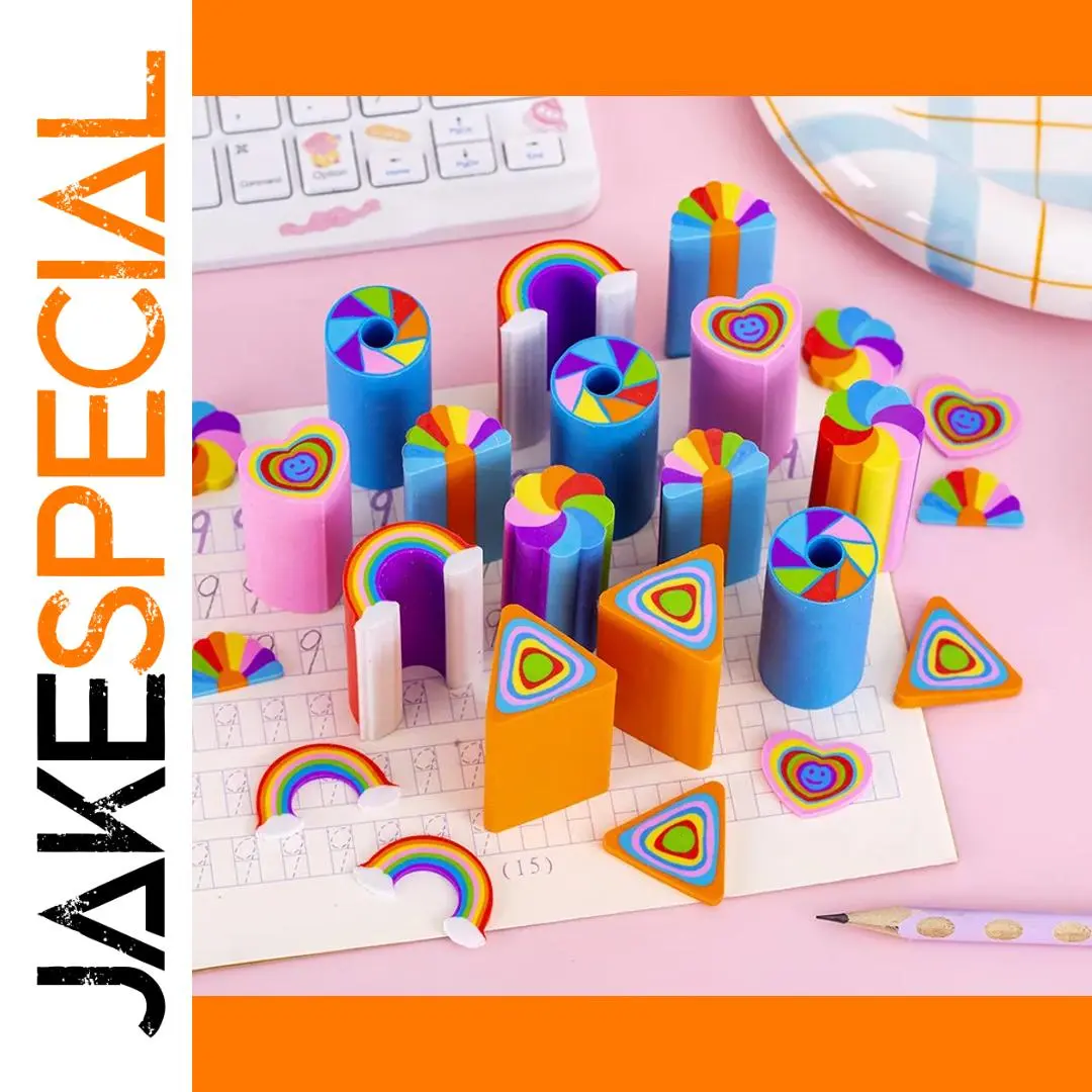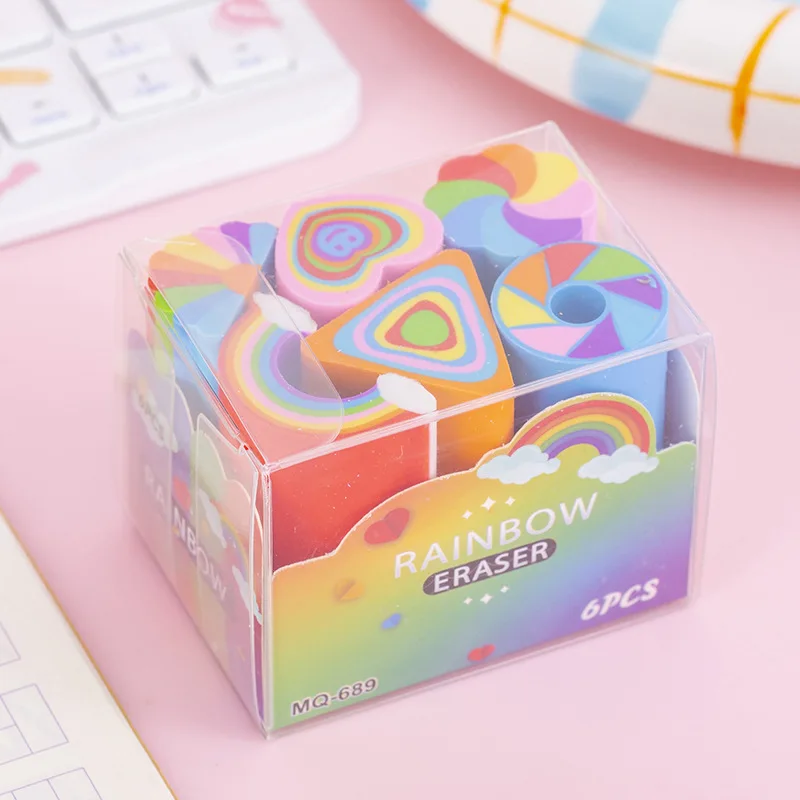 Transform your stationery with this delightful set of six pastel-colored cartoon erasers, crafted from soft rubber, featuring adorable rainbow, love heart, and playful character designs in seven vibrant colors. Weighing a total of 242 grams, these erasers are perfect for school, office, or craft projects, offering a cheerful, kawaii aesthetic that appeals to all ages over 3 years. Each eraser’s charming, whimsical style enhances your desk with fun and practicality, making it easy to keep your notes neat while adding a touch of playful personality. Enjoy a colorful, cute, and functional collection that brightens any workspace or schoolbag.