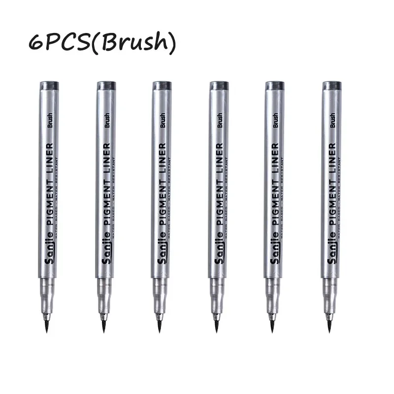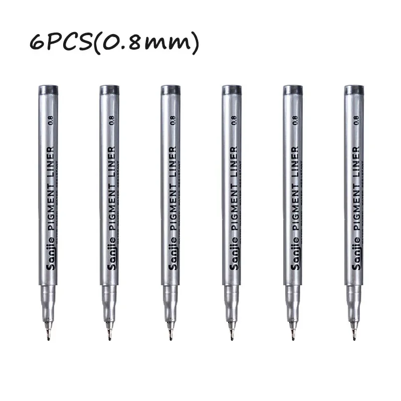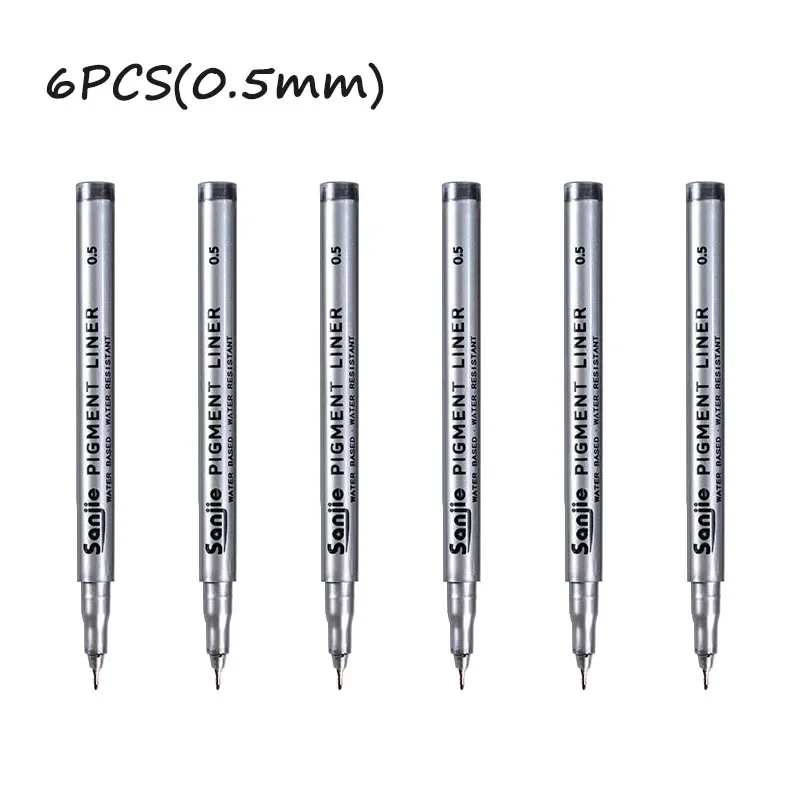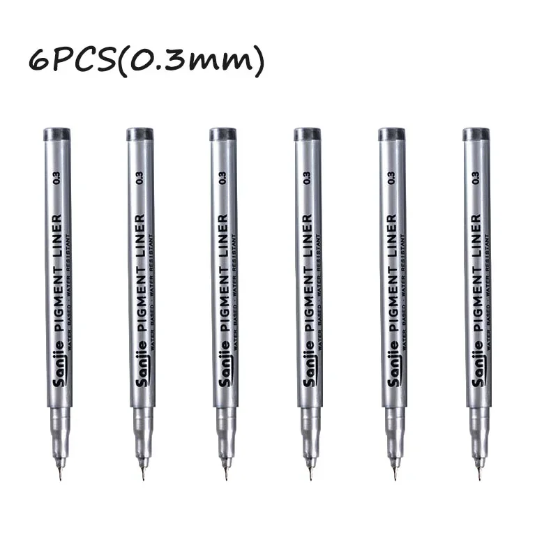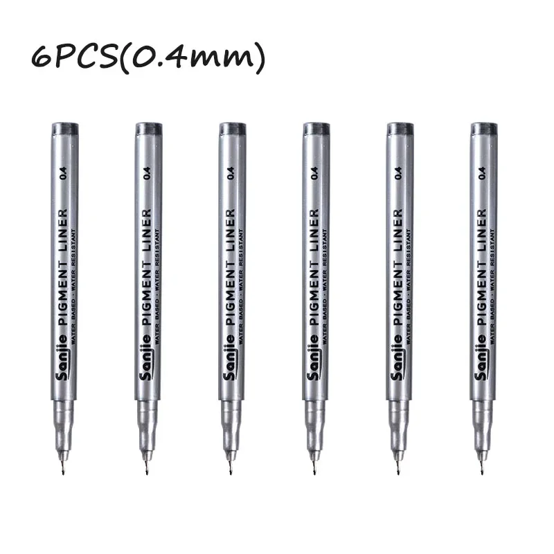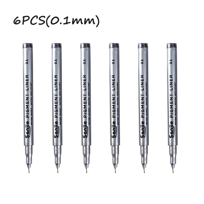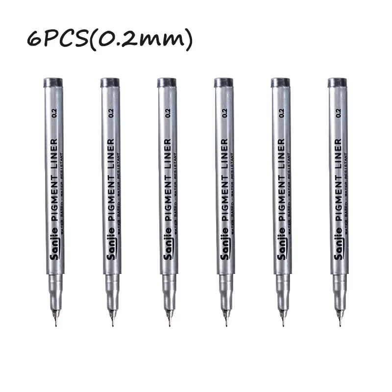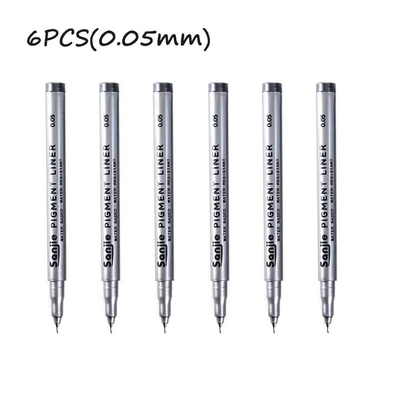Elevate your artistic precision with this set of 6 precision black micro-pens, perfect for hand-painting and detailed line work. Each pen features a sleek silver body, clearly labeled with its nib size for effortless identification, ranging from 0.05mm to 0.8mm. The continuous gel ink ensures smooth application, while the variety of tip sizes caters to all your creative needs. Crafted from durable plastic, these pens are ideal for use in both office and school settings. Experience the perfect balance of functionality and design, making every stroke count in your projects.