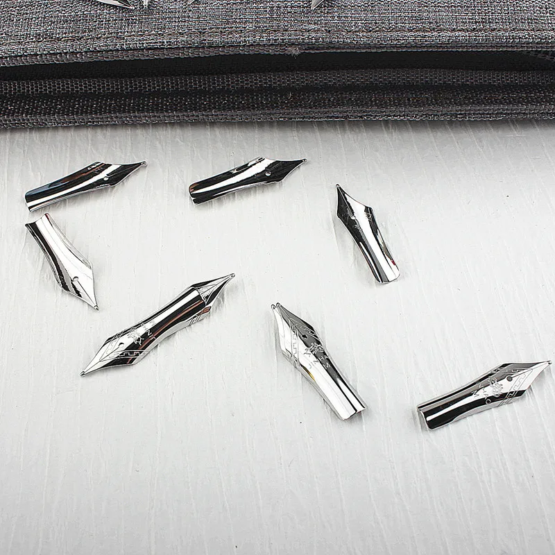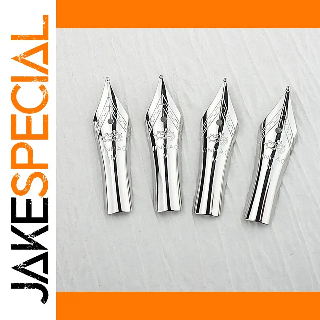 Experience the precision and elegance of this set of eight high-quality Jinhao 500 82 fountain pen nibs. Crafted from durable stainless steel, these nibs are designed to provide a smooth and consistent writing experience. The set includes four distinct sizes: extra fine (EF, 0.38mm), fine (F, 0.5mm), medium (M, 0.7mm), and a uniquely curved (bent) 1.0mm nib for broader strokes. With their polished, reflective chrome finish, the nibs exude a sleek, professional aesthetic. Each nib features engraved details and a precisely tapered point, offering both style and functionality. Whether you're replacing worn nibs or customizing your writing instruments, this set delivers reliability and elegance for sophisticated writing.