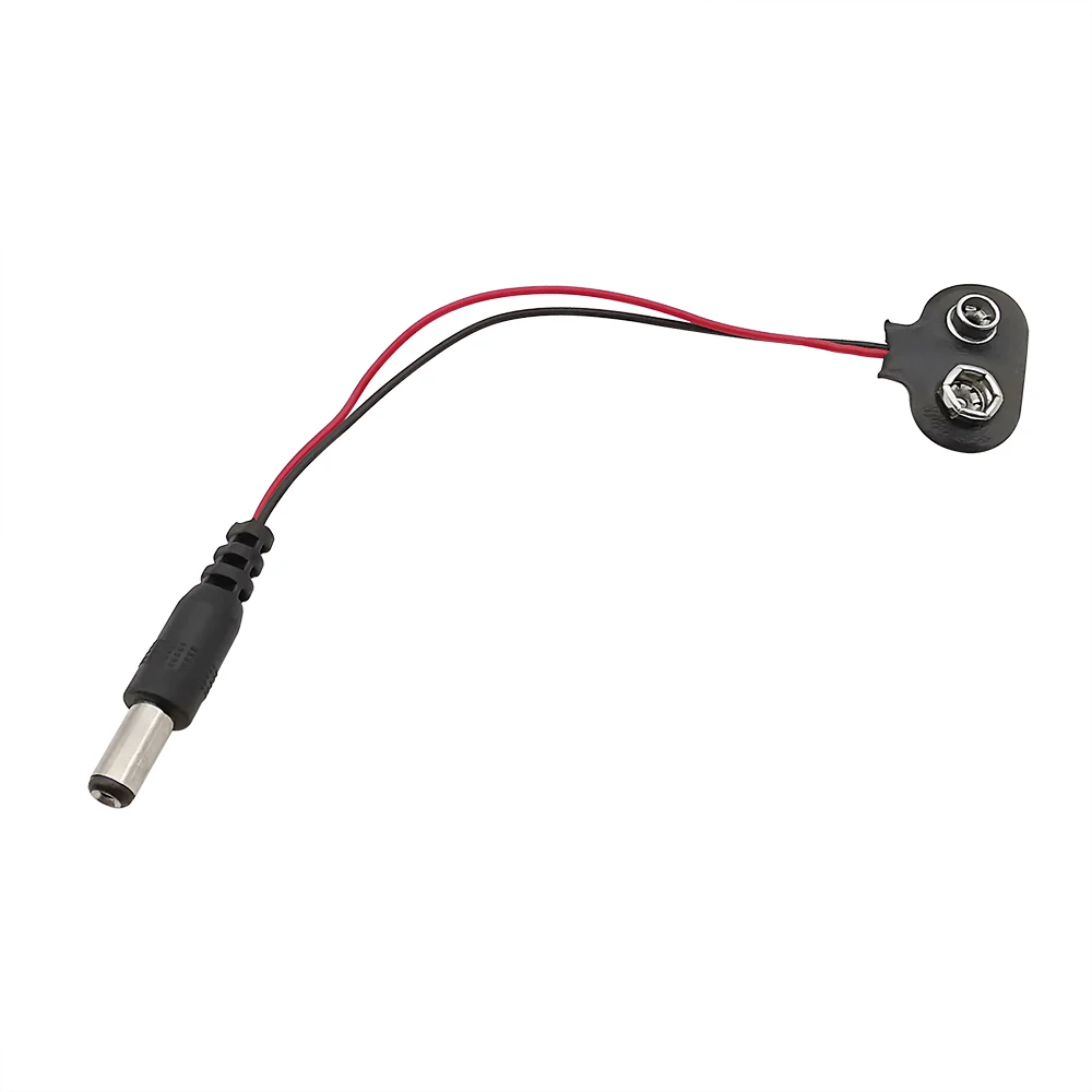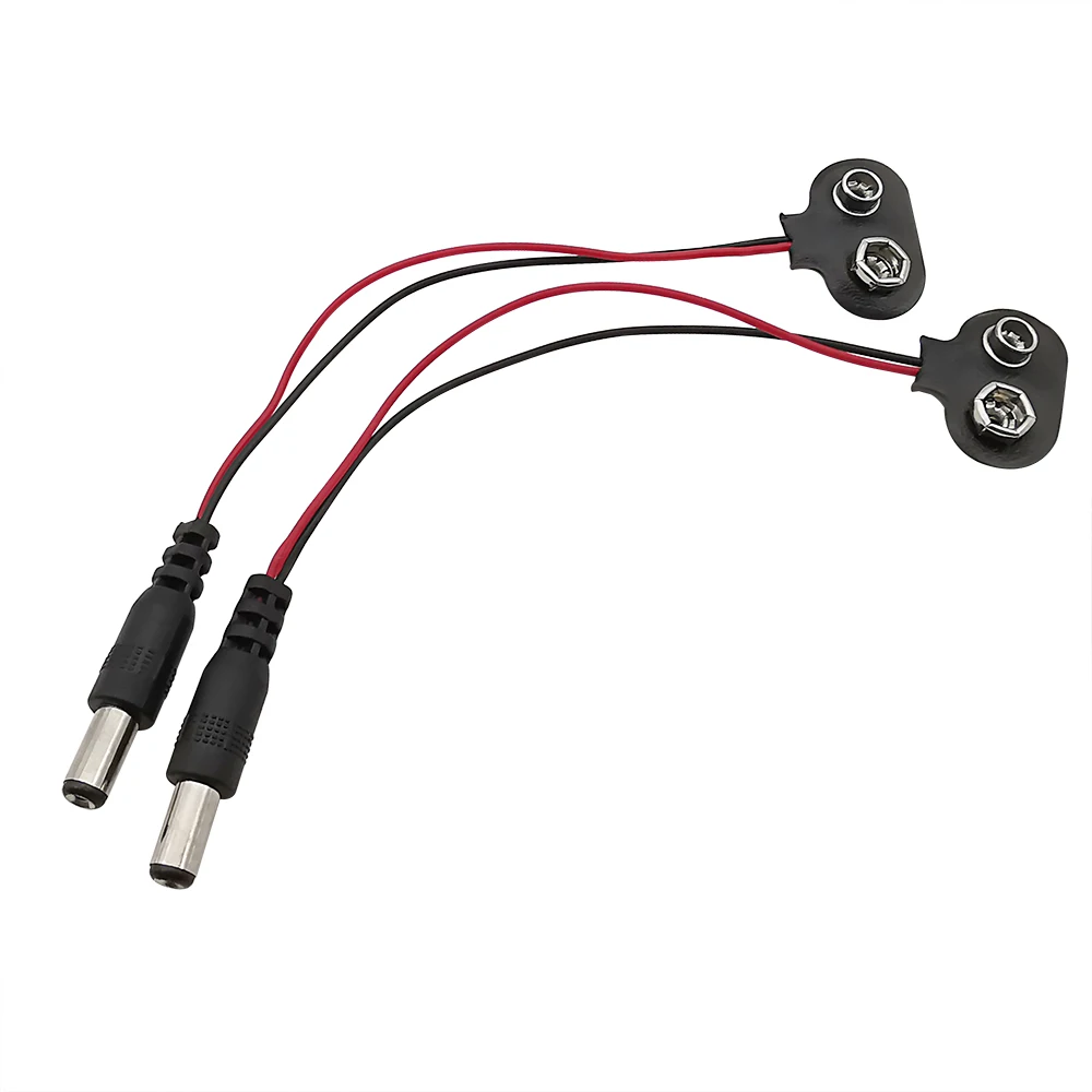 Transform your electronic projects with this set of five 15cm (5.9 inch) adapter cords featuring a 2.1 x 5.5mm male plug with tip-positive configuration, protected by a plastic ring to prevent accidental grounding, and a durable T-type 9V battery clip compatible with standard batteries or battery packs. Constructed from metal and plastic in sleek black and red colors for clear polarity indication, these adapters support a 9V supply voltage, making them ideal for powering small devices or circuits via a DC jack or battery power source. Perfect for hobbyists and professionals seeking reliable, organized connections for their electronic projects.
