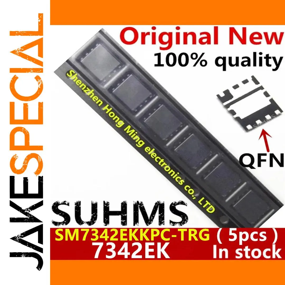 Discover the reliable performance and sleek design of this set of five new voltage regulators, model SM7342EK and SM7342EKKPC. Encased in a compact, square QFN-8 package, each unit boasts a metallic, reflective top surface paired with a matte black body, combining industrial sophistication with minimalist aesthetics. The flat sides are edged with tiny metallic contact pads, emphasizing precision engineering. Ideal for computer applications, these regulators are crafted to meet international standard supply voltage and dissipation power specifications. Their streamlined form offers easy integration into various electronic circuits, ensuring high performance and durability. Trust in their consistent quality to enhance your projects with technical excellence and modern design.