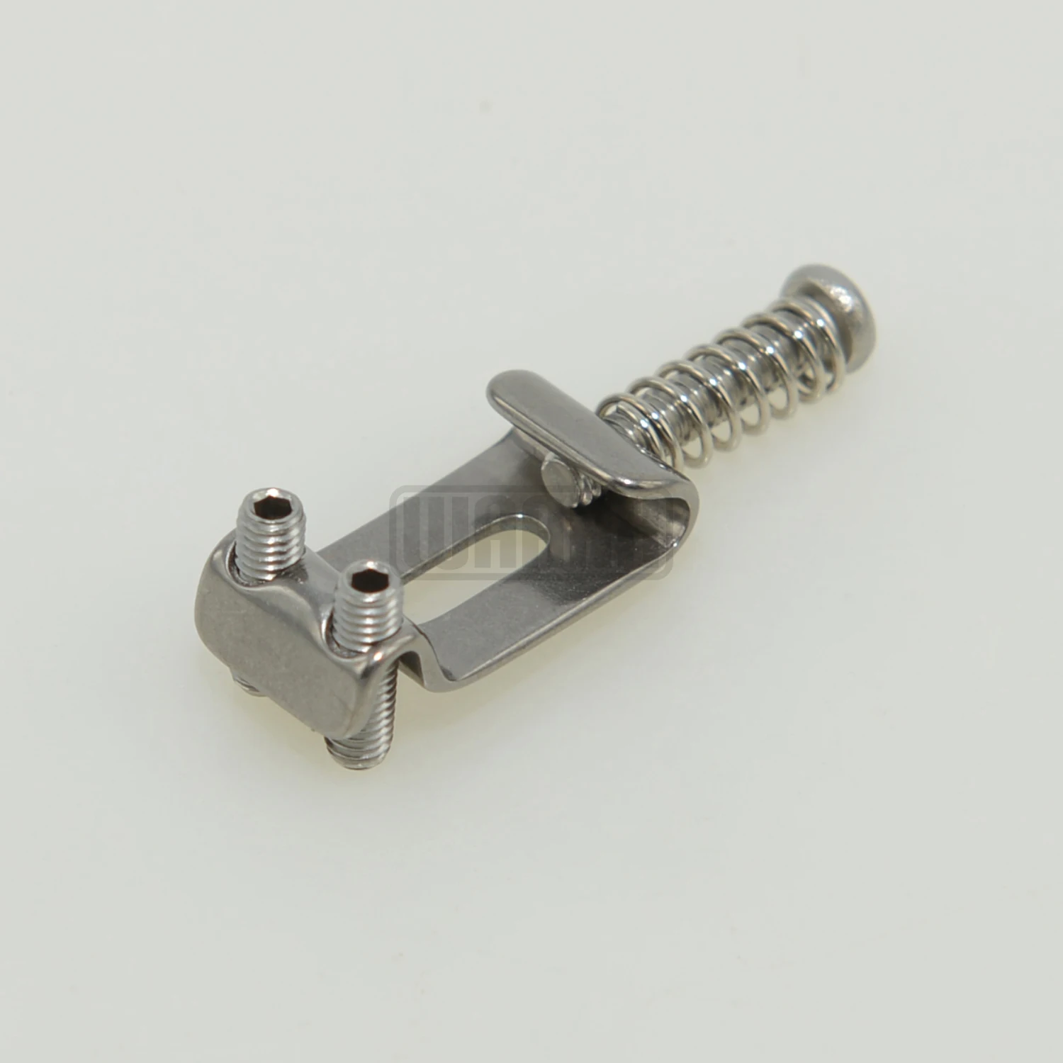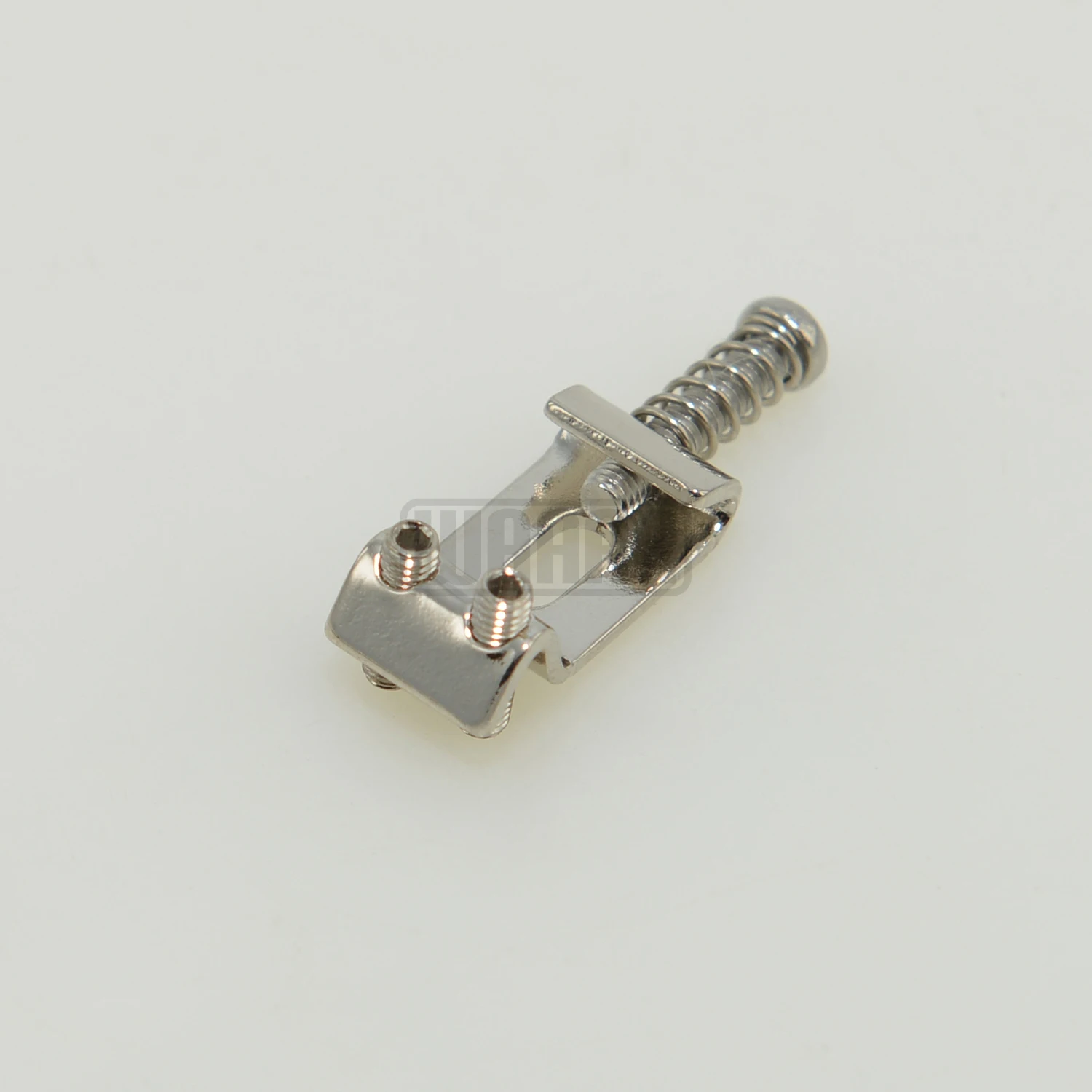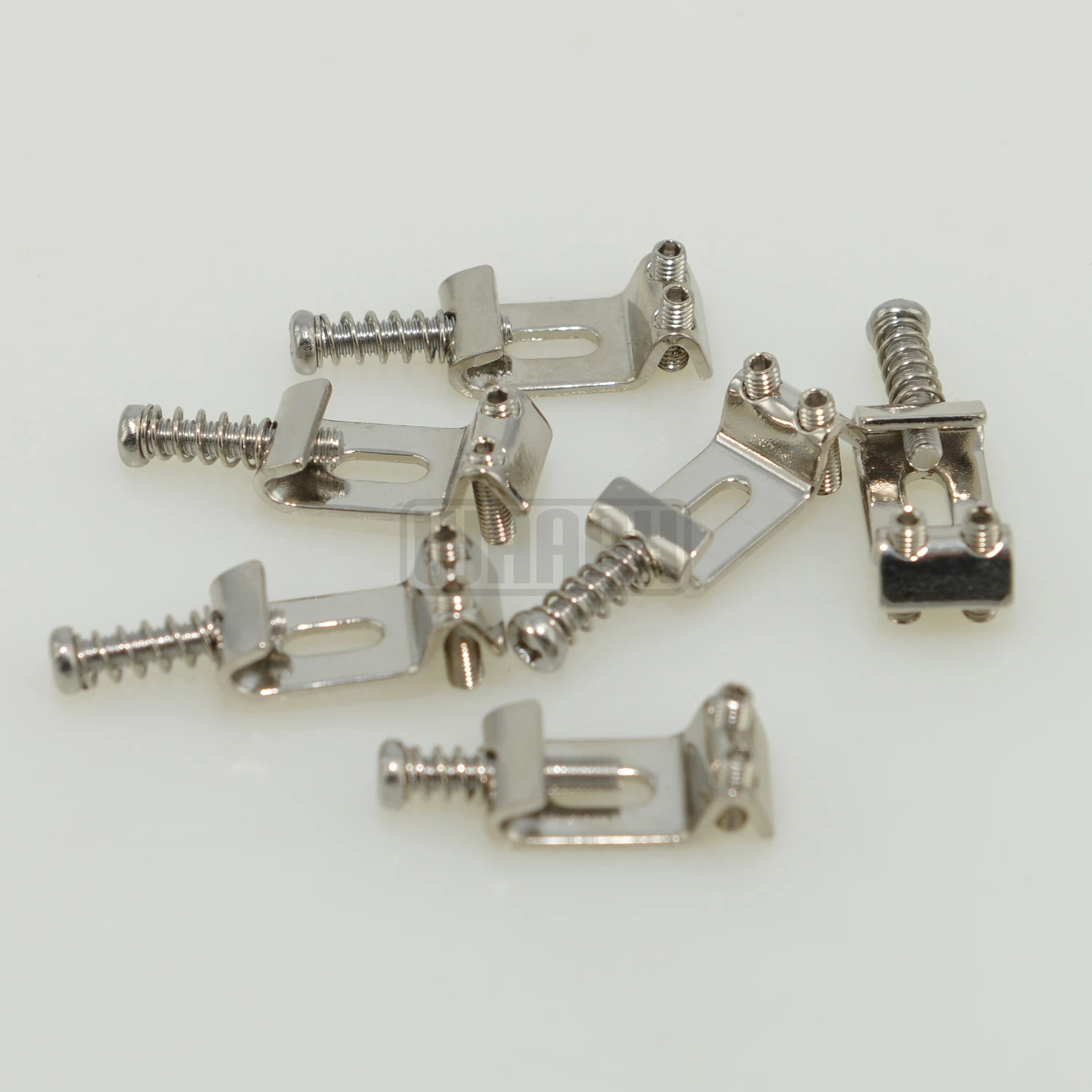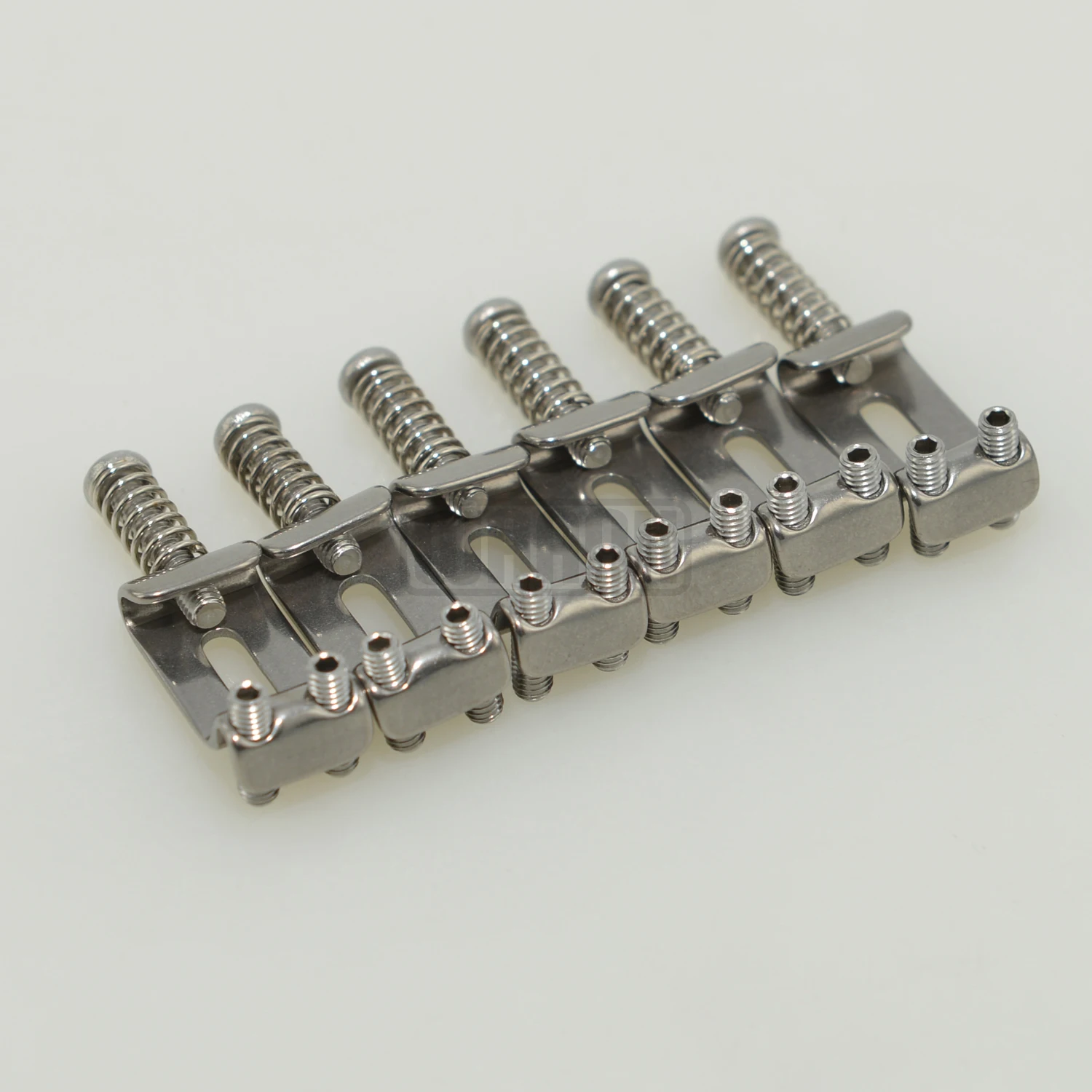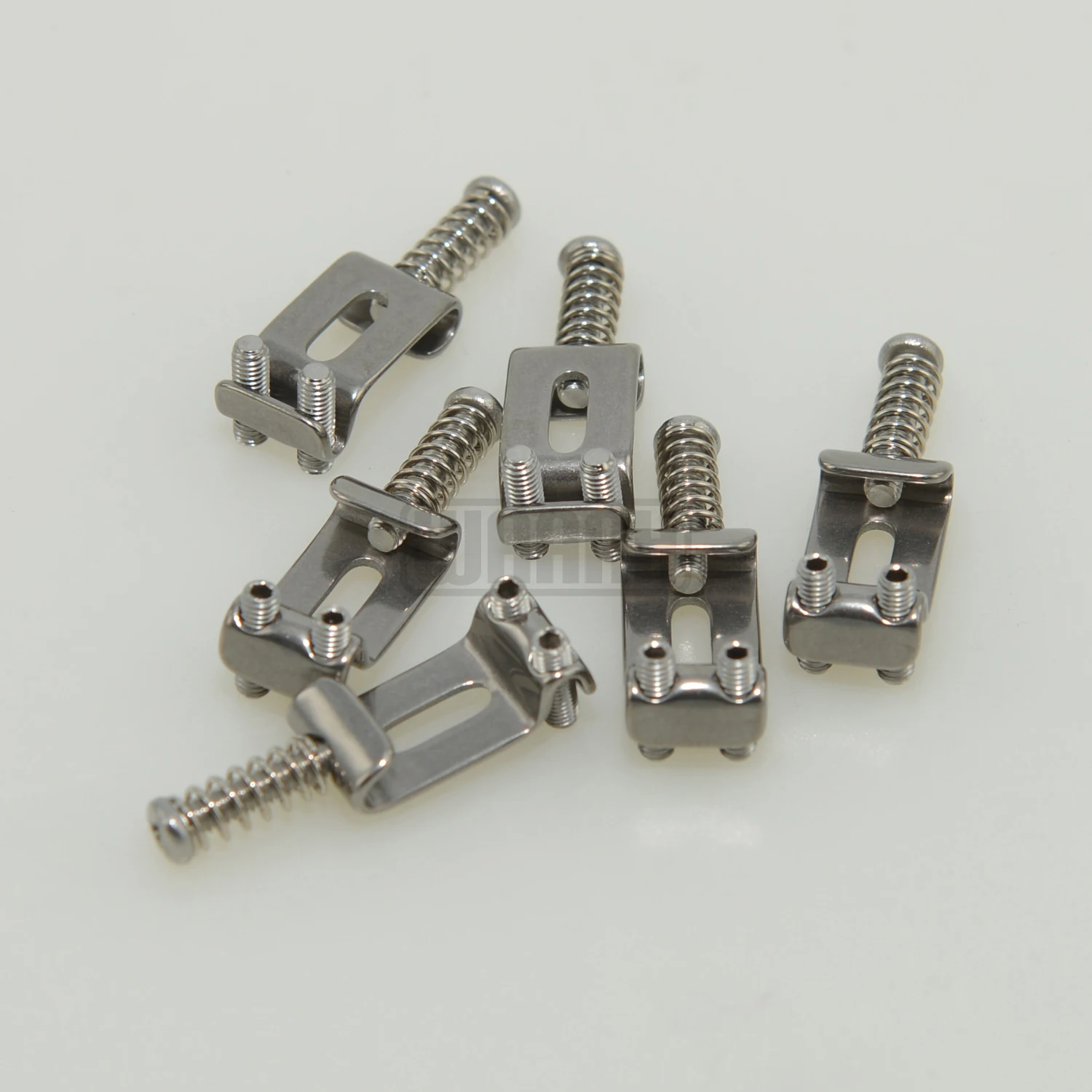 Experience enhanced tuning stability and smooth performance with this set of six high-quality guitar roller tremolo bridge saddles, designed specifically for electric guitars. Crafted from durable Iron and Titanium Alloy, these saddles feature a sleek, polished silver finish that adds a modern aesthetic to your instrument. The uniform rectangular shape with rounded edges provides both strength and a minimalist look. Each saddle includes elongated slots and a small, rounded screw hole for easy securement and precise adjustment. Their spring-loaded screws and coiled springs ensure optimal tension and height control, making your playing more comfortable. This set promises durability and performance, elevating your guitar's sound and tuning stability. Ideal for professional musicians and hobbyists alike, it guarantees reliable performance for years to come.