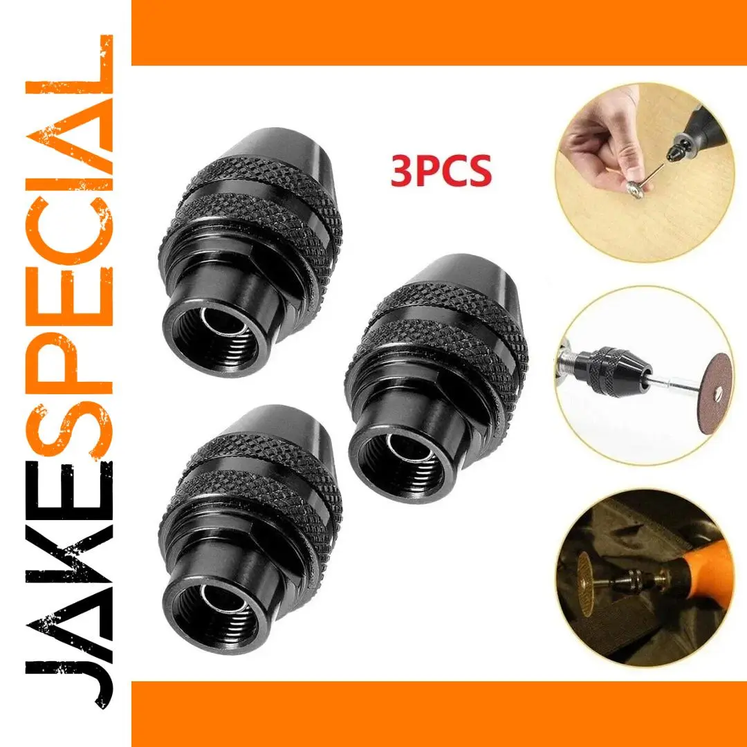 Enhance your DIY toolkit with this set of three durable, black keyless drill chucks. Designed for precision and ease of use, each chuck features a sleek cylindrical shape with a high-gloss finish. The textured, knurled band around the midsection ensures a secure grip when tightening or loosening, making installation quick and hassle-free. Compatible with popular Dremel rotary tools such as models 3000, 4000, 7700, and 8200, these chucks effortlessly accommodate drills with a clamp capacity of 0.8mm to 3.2mm, ideal for grinding, polishing, drilling, and woodworking tasks. Their sturdy construction guarantees longevity and reliable performance even in demanding projects, giving you peace of mind for all your DIY endeavors.