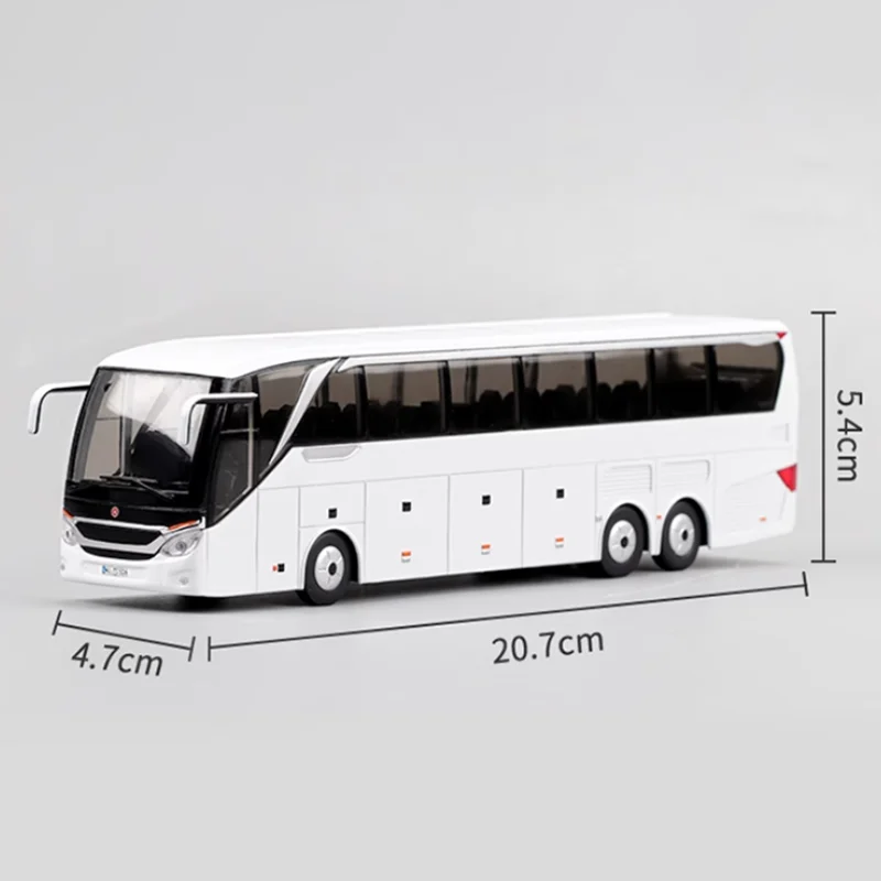 Bring home the sleek, modern aesthetic of this detailed diecast Setra tourist bus, perfectly crafted for display, gifting, or personal collection. Measuring about 20.7 cm long, the model showcases a stylish, streamlined shape with smooth lines and a pristine white finish (available in two color options: A and B), emphasizing its contemporary design. Large, tinted windows extend almost the full length, enhancing realism, while the expansive, slightly curved windshield adds an elegant touch. The black detailing around the front windshield and bumper accentuates its refined look. Equipped with small, detailed black tires with silver centers, this model exudes a polished, high-quality appearance. Carefully crafted from alloy and plastic, it balances durability with sophisticated aesthetic appeal, perfect for any enthusiast seeking a realistic, collectible piece.