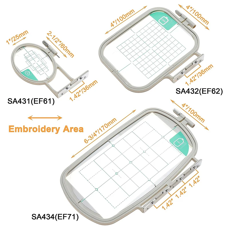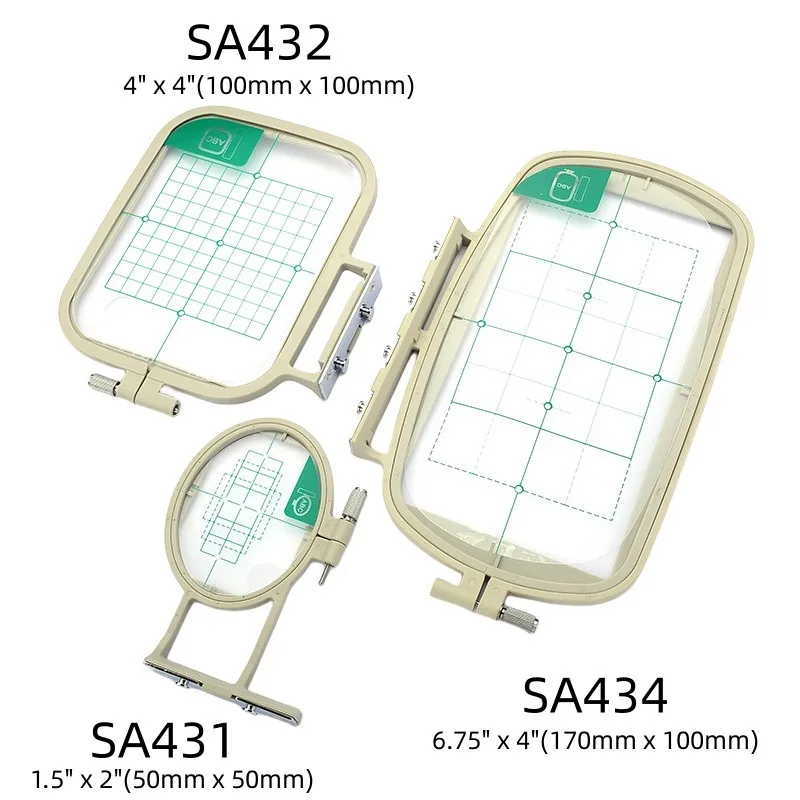 Discover the sewing experience you've been yearning for with this exceptional Sewing and Embroidery Hoop set. Designed for compatibility with a wide range of Brother and Babylock embroidery machines, this collection includes three uniquely sized hoops. The small hoop (SA431) measures 1.5″ by 2″, while the medium square hoop (SA432) measures 4″ by 4″, and the large rectangular hoop (SA434) measures 4″ by 6.75″. Each hoop is made from durable plastic, featuring an off-white color that blends seamlessly into your sewing space. Clear alignment markings and a grid pattern elevate your embroidery projects, ensuring precision and ease of use.