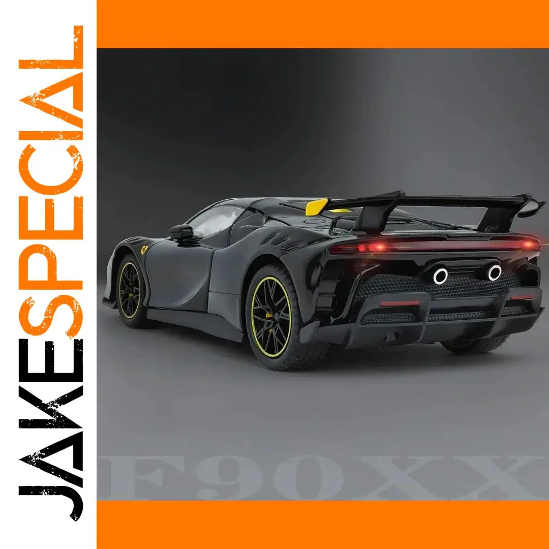Experience the thrill of owning an exquisitely crafted diecast model of the high-performance SF90XX. Measuring at a precise 1:24 scale, this model embodies speed, precision, and craftsmanship. Its matte black finish highlights sleek curves and sharp aerodynamic lines, perfectly capturing the essence of a modern supercar. Equipped with functional sound and light features, the model brings your collection to life with bright red taillights and detailed interior details visible through clear windows. Designed for adult collectors, it features a pull-back mechanism for realistic movement and durability. Multiple color options, including Rafa FXXK, Purosangue FVU, SP3, and others, allow you to choose your favorite. Showcase this piece proudly in any collection to make a statement on speed and luxury.