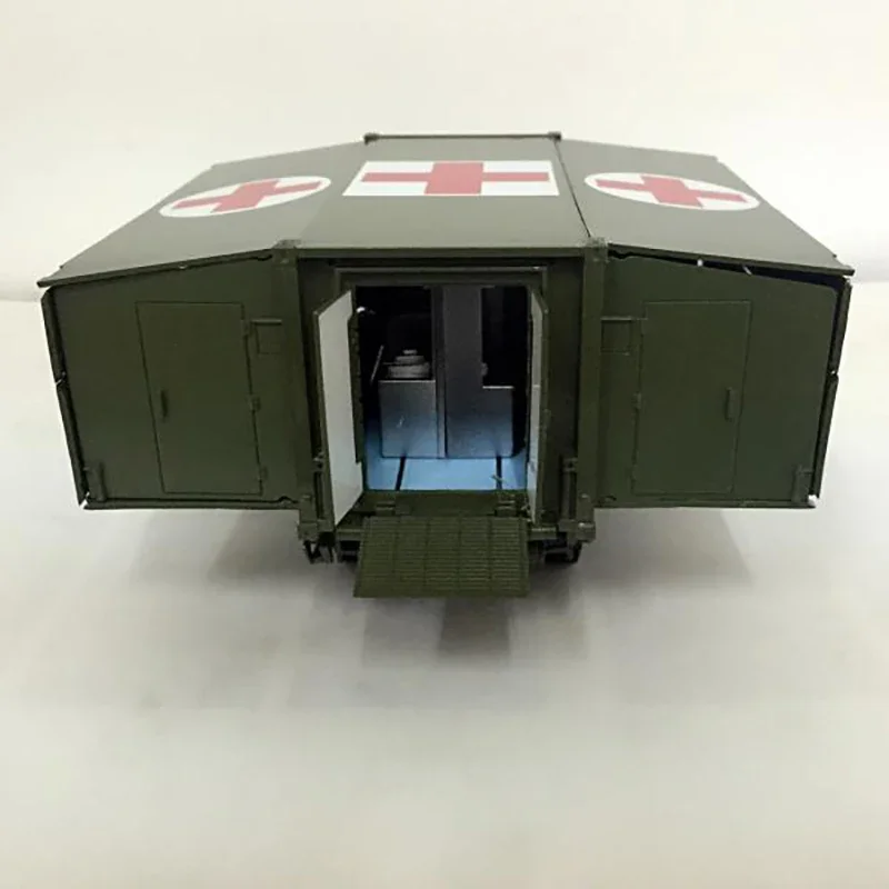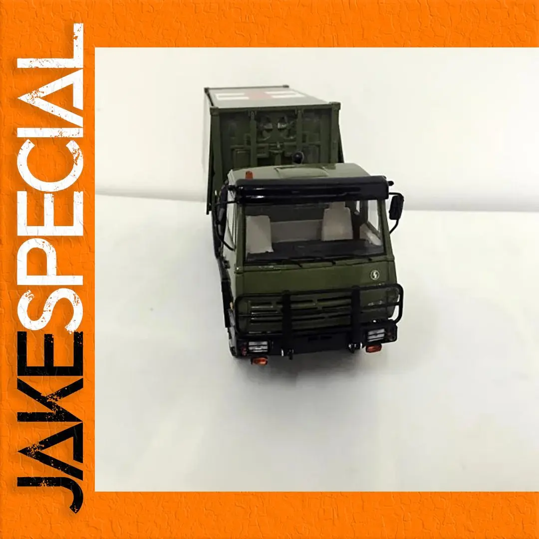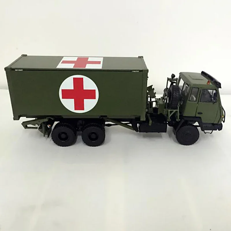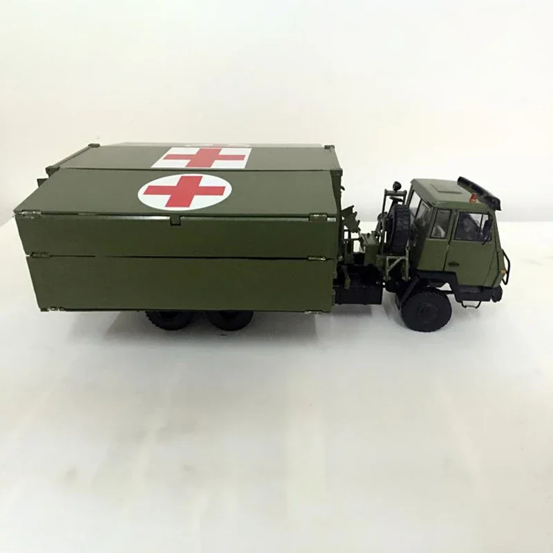This detailed 1:43 scale die-cast model of a Shaanxi automobile logistics support medical expansion shelter is crafted from alloy and ABS plastic, showcasing a rugged olive green matte finish. It features functional moving parts including openable side doors, a liftable front cab, a movable front bumper with hydraulic rod, fully pull-up rear axle bracket, and turnable wheels with detailed rims. Designed for collectors and enthusiasts, this model measures approximately life size and includes delicate details that emphasize a sturdy, utilitarian military or logistical aesthetic. Packaged in a new foam box, it’s ideal for display, gifting, or static collection, with minor manufacturing flaws normal for process limitations.