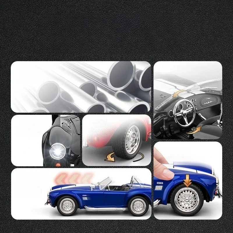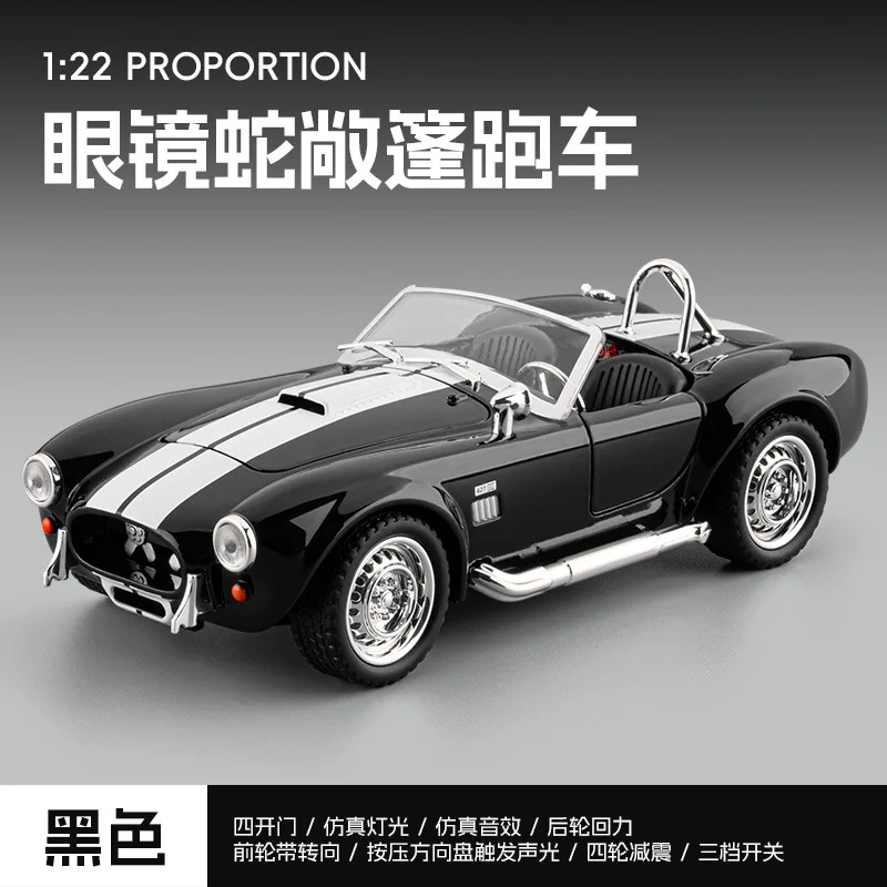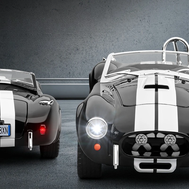 Immerse yourself in the world of classic racing with this highly detailed 1:22 scale diecast replica of the Shelby AC Cobra alloy racing car. Crafted from durable metal, this model features a glossy black finish accented by a bold white racing stripe that runs from the front to the rear, highlighting its sleek, aerodynamic curves. The convertible design reveals a textured black interior with intricate seats, steering wheel, and dashboard visible through a clear windshield. Silver-colored wheels with detailed spoke patterns, side pipes, vents, chrome mirrors, and trim accents add to its vintage racing appeal. Powered by a button battery, this collectible is perfect for enthusiasts aged 14 and above.