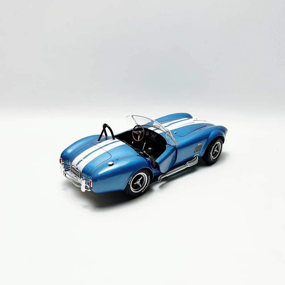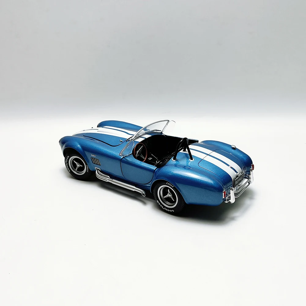 Experience the timeless allure of the Shelby AC Cobra 427 Convertible with this meticulously crafted 1:18 scale die-cast model. Made from alloy, plastic, and rubber, this static collectible captures the vehicle’s sleek, aerodynamic design, featuring a glossy metallic blue finish with a bold white racing stripe running centrally from front to back. The model includes realistic details such as a clear windshield, black interior, black roll bar, and polished silver five-spoke wheels with “Goodyear Eagle” tires. Perfect for display or collection, it comes in a dustproof box, highlighting fine craftsmanship with minor paint flaws that add to its authentic vintage appeal.
