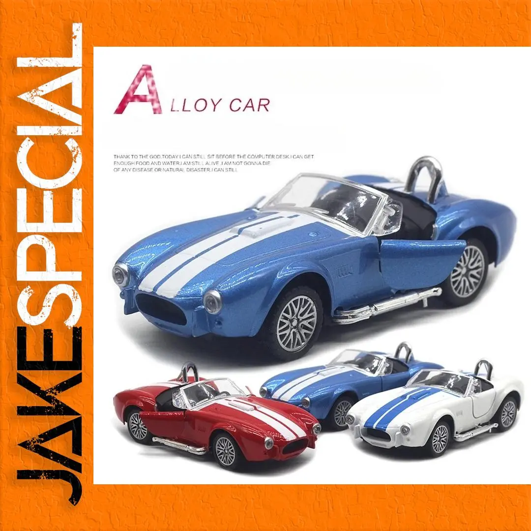 This 13cm-long, 1:32 scale diecast metal alloy replica of the classic Shelby Cobra 427 features a sleek, curved body available in blue, red, and white with iconic white racing stripes. The detailed model includes a polished exterior, small streamlined side mirrors, chrome side exhaust pipes, realistic wheel rims, and tires. The clear or slightly tinted windshield reveals a minimalistic black interior, highlighting its vintage racing style. Crafted from durable metal alloy, this non-electric collectible is ideal for ages 14 and above, making it a perfect display piece or gift for car enthusiasts and collectors alike.