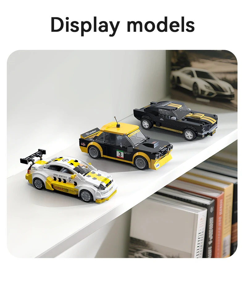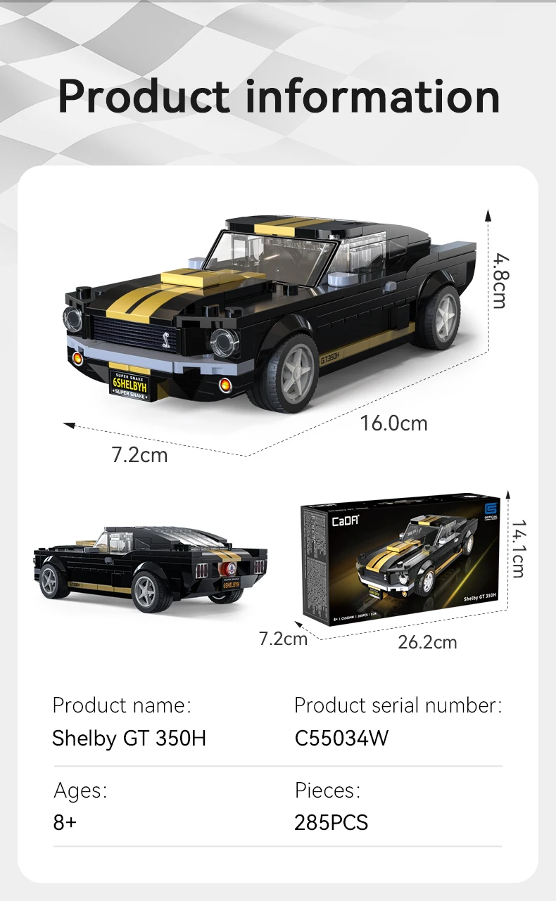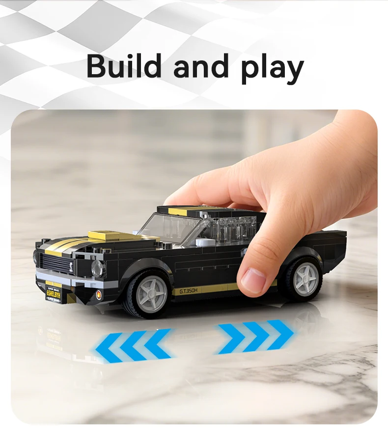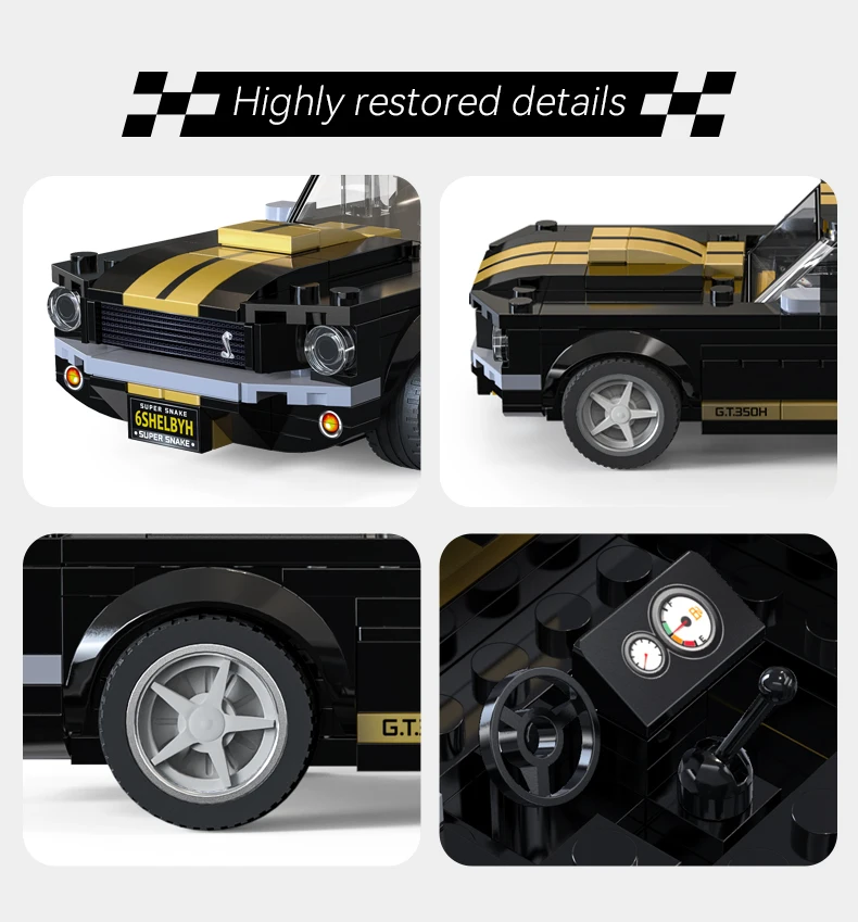 Bring the iconic Shelby GT350 to life with this highly detailed 1:24 scale building block set, perfect for adult collectors and enthusiasts. Crafted from durable ABS plastic compatible with other small building blocks, this non-electric, battery-free model features a sleek black finish with a bold yellow racing stripe running over the hood, roof, and rear. Notable design elements include a raised hood section, realistic round headlights, black grille, and multispoke white rims with black tires. The vintage silhouette is accented with a “GT350H” badge, clear side windows framed in black, and a matching yellow stripe on the rear trunk, capturing the classic muscle car’s authentic style.