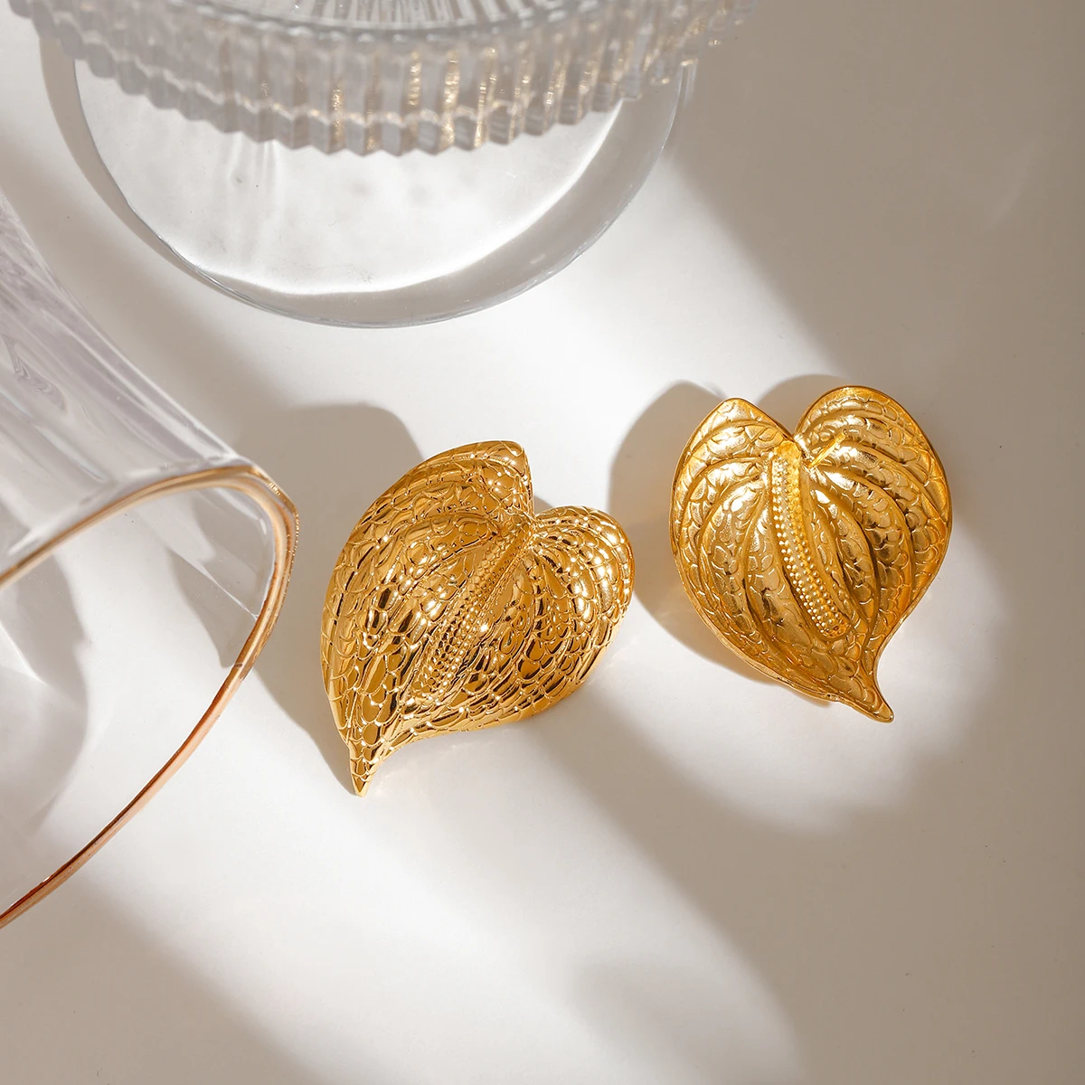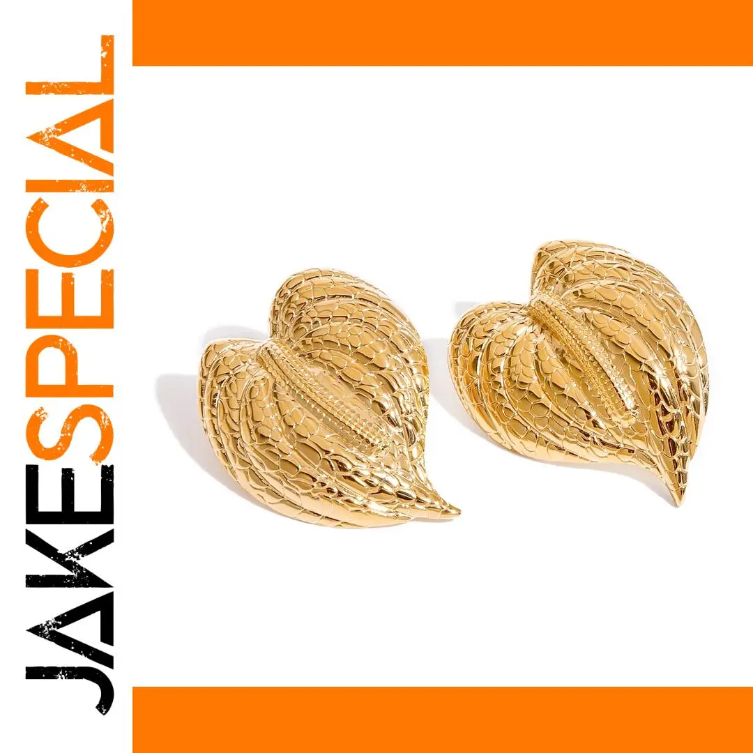 Elevate your style effortlessly with these exquisite, bold earrings inspired by natural seashells. Crafted from high-quality stainless steel with a durable, luminous gold finish, they offer long-lasting shine and elegance. The design features a rounded, shell-like shape with a pointed, slightly convex tip, which adds a touch of sophistication. Its highly detailed surface mimics natural shell textures, including intricate lattice patterns and vein-like lines for depth. A prominent central ridge runs along the length of each earring, decorated with tiny bead accents that enhance their visual appeal. Their chunky, statement-making design makes them perfect for transforming everyday outfits into eye-catching ensembles. Whether worn for casual outings or special occasions, these earrings combine luxury, natural motifs, and current trends seamlessly.