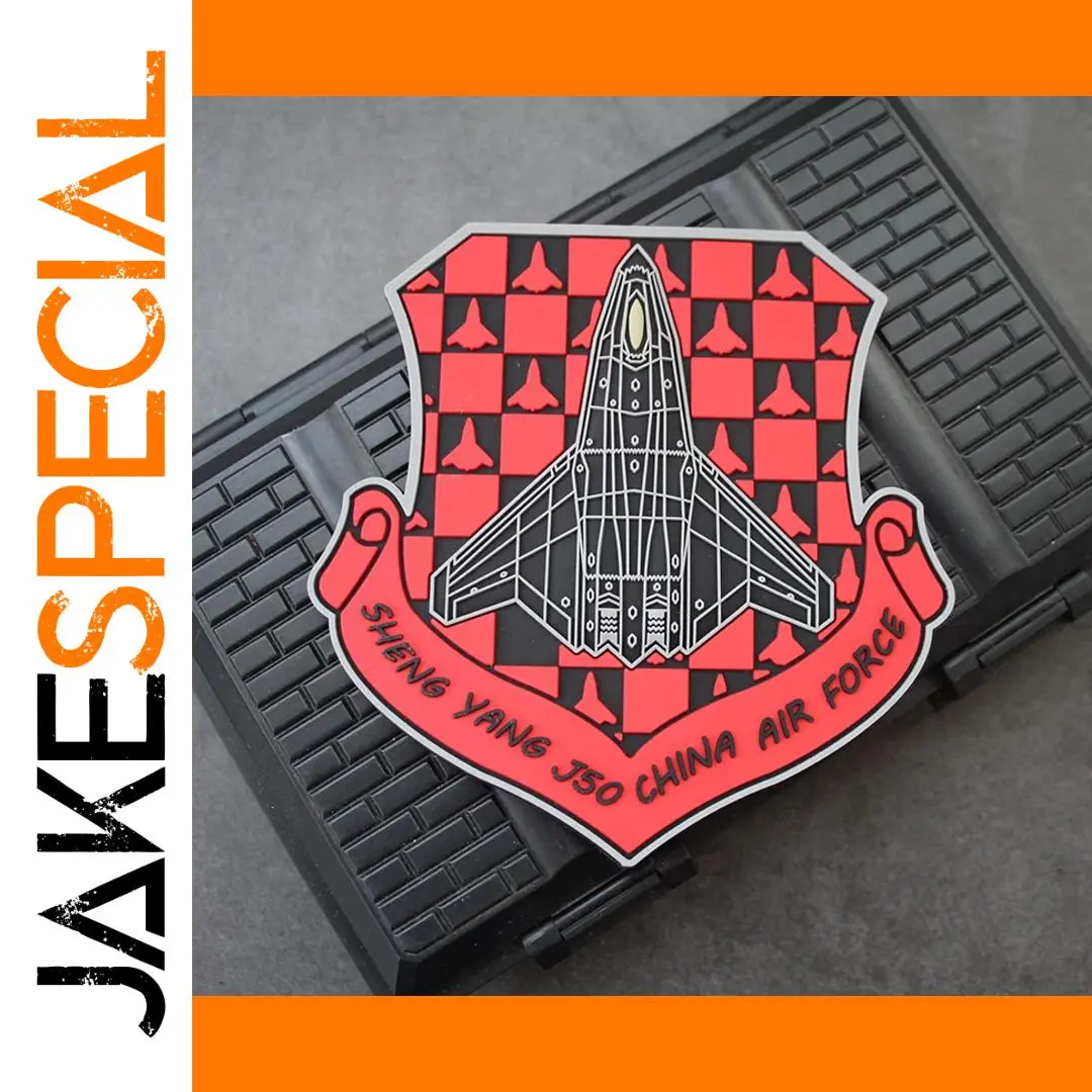 Imagine adding this eye-catching PVC patch to your collection or gear, instantly elevating your style with its bold aviation-inspired motif. Measuring 9.8 by 10 centimeters, this patch features a shield-like shape with a dynamic checkerboard background of red and black squares, each intricately decorated with a stylized fighter jet silhouette. The centerpiece showcases a detailed black-and-white line art illustration of a fighter jet, highlighting fine panel lines and structural details. Beneath the jet, a curved red banner displays crisp black text reading “SHENG YANG JSO AIR FORCE,” adding a military touch. With its raised 3D effect, this durable PVC patch offers both visual depth and tactile appeal, making it perfect for customizing apparel or gear with a strong aviation character.